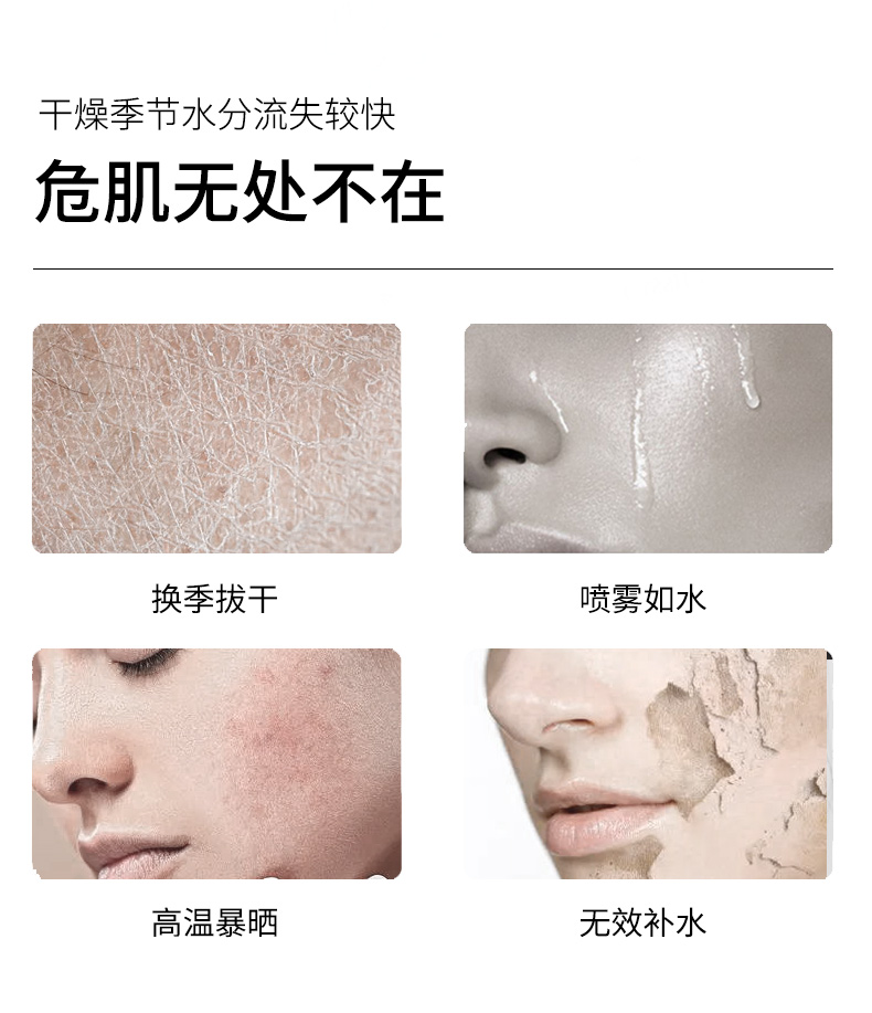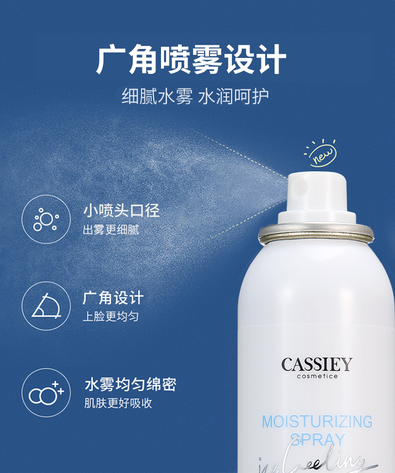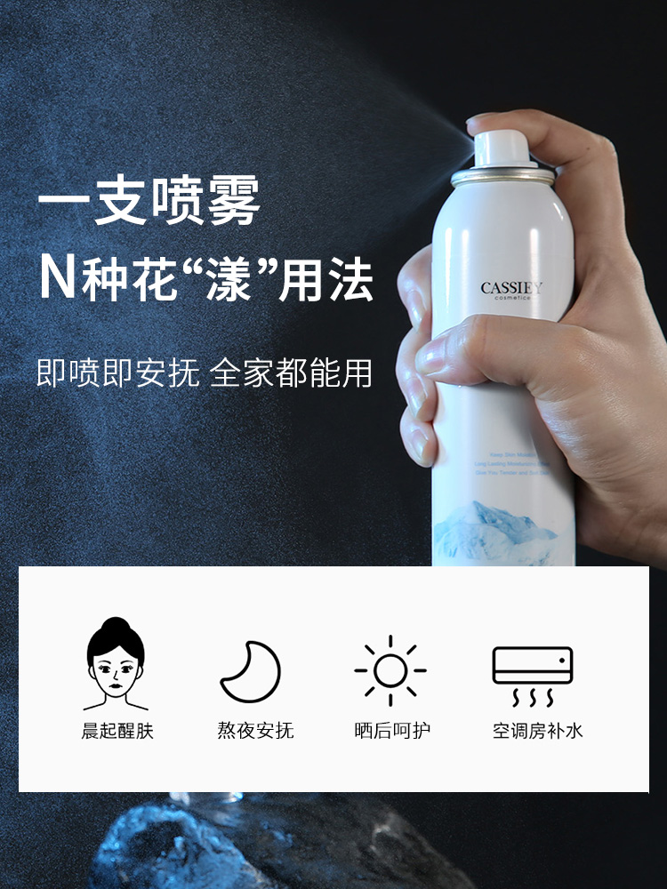 天然植物成分,镇定舒缓,小分子玻尿酸,直达肌肤底层,修护肌肤,亲水润肤,肌肤柔嫩水润,微米喷头设计,超微粒扇面出雾,全面水润肌肤,气雾定妆,清爽不油腻,一喷即搞定~