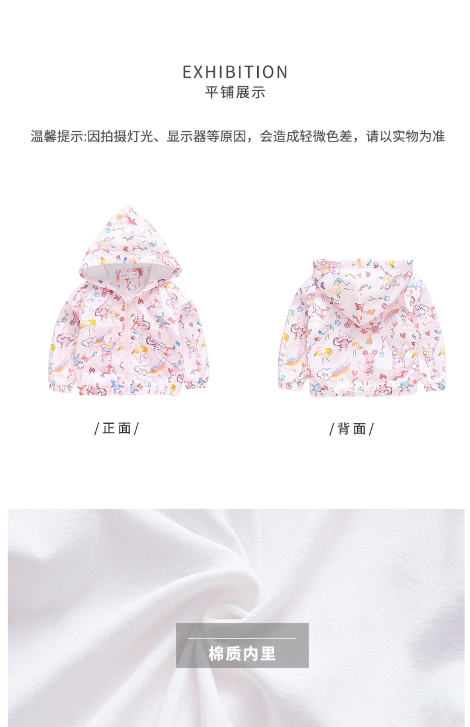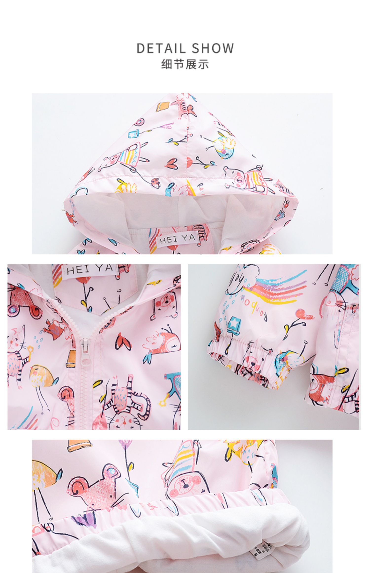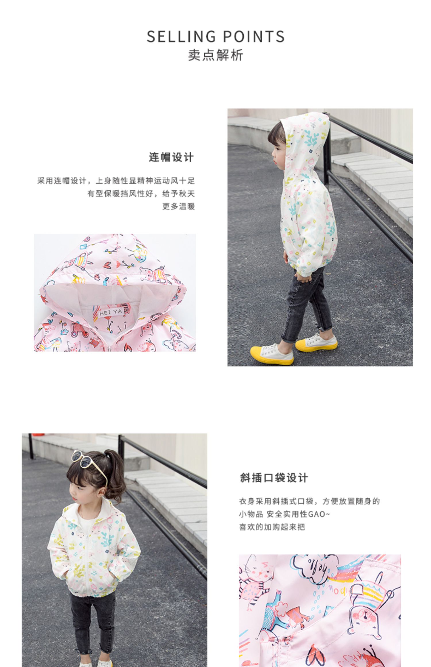 采用连帽设计,上身随性显精神运动风十足,有型保暧挡风性好,舒适双层面料,顺滑手感,让宝宝穿的舒服,看的精致!