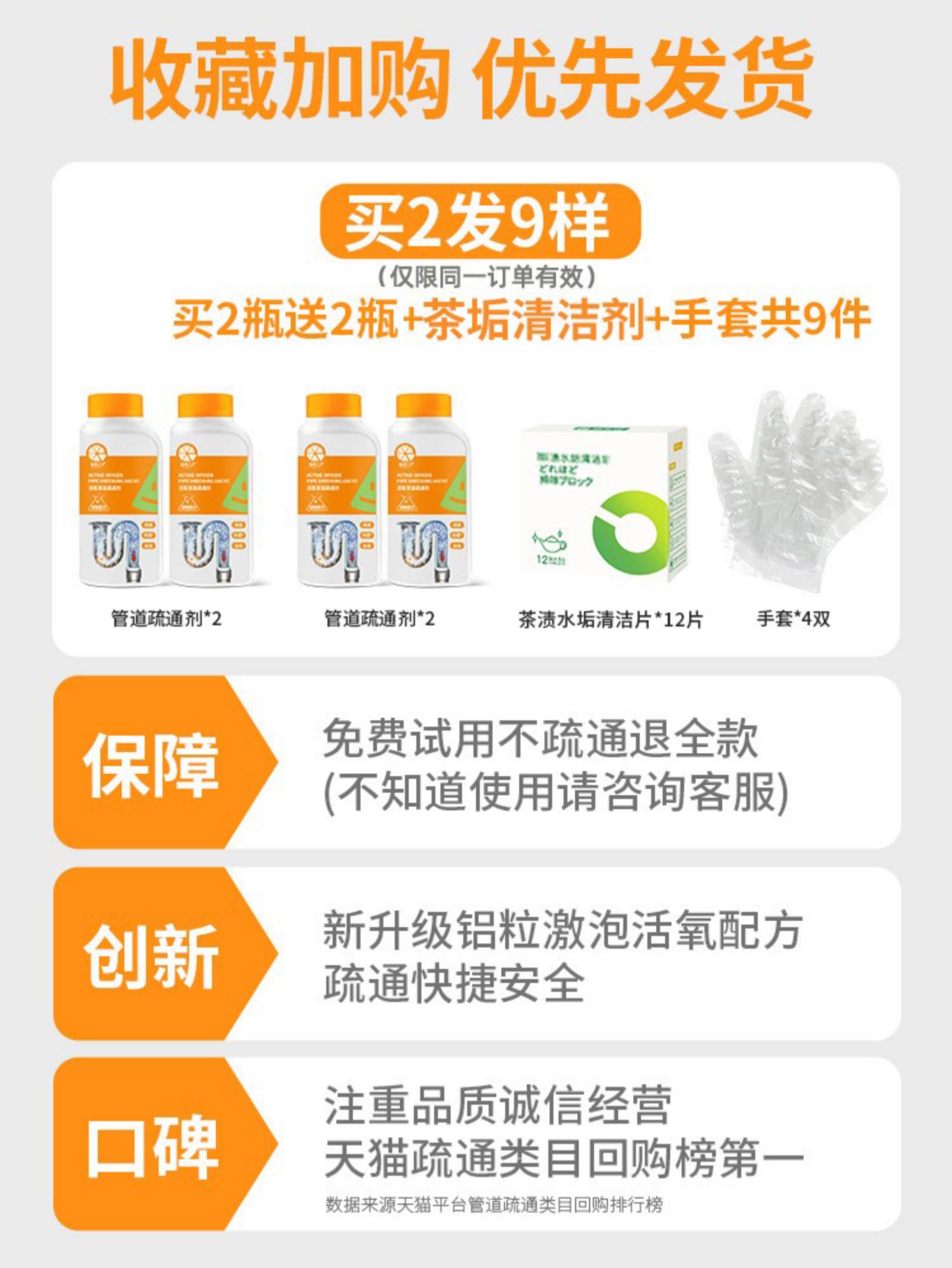 【拍二发五送茶垢清洁*1+一次性手套*4,到手共9样】马桶、地漏堵了,就用它!管道疏通神器~橙乐工坊管道疏通剂!家政公司都在用!除臭、养护、疏通、清洁多效合一,快速疏通管道!