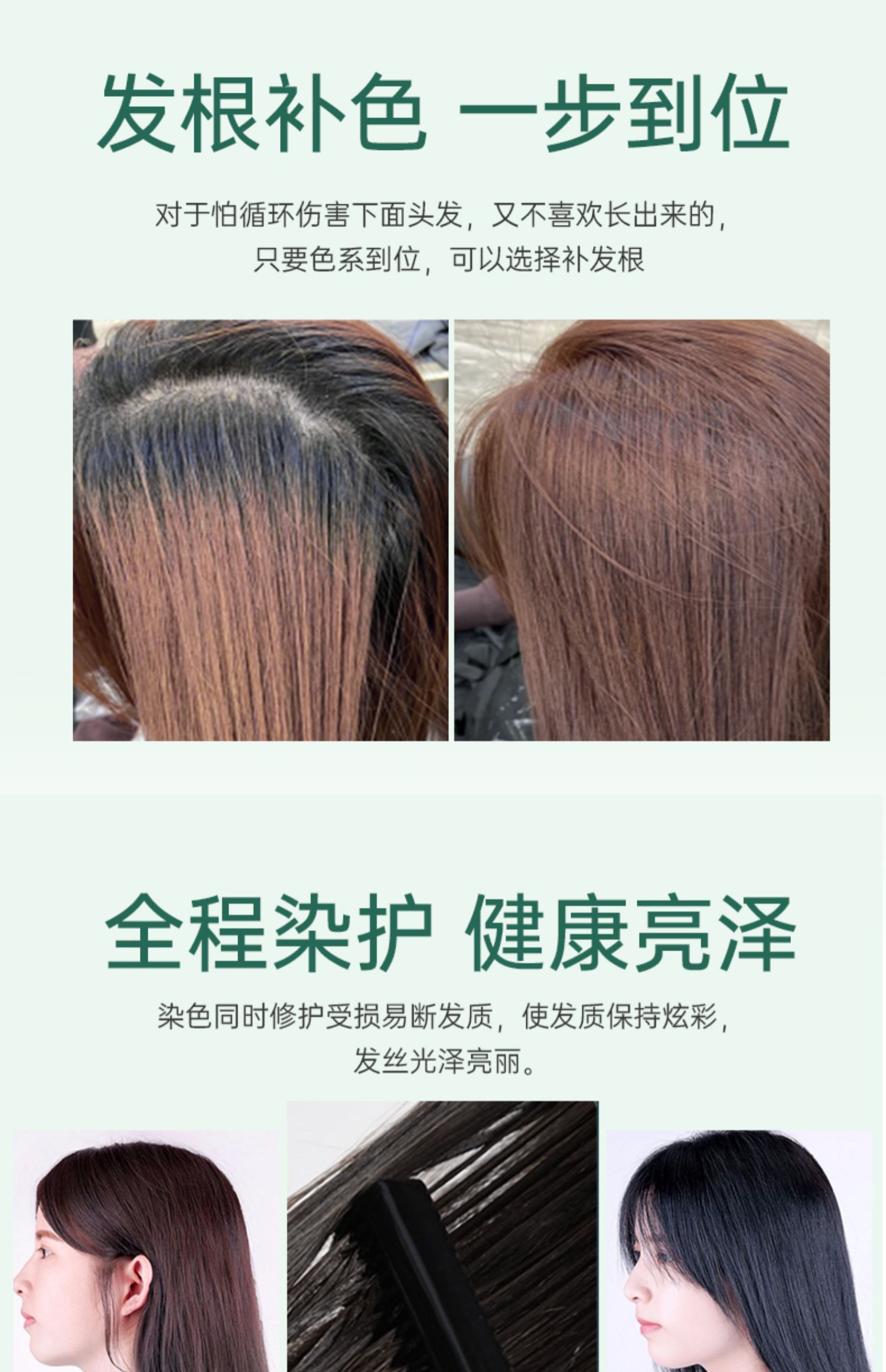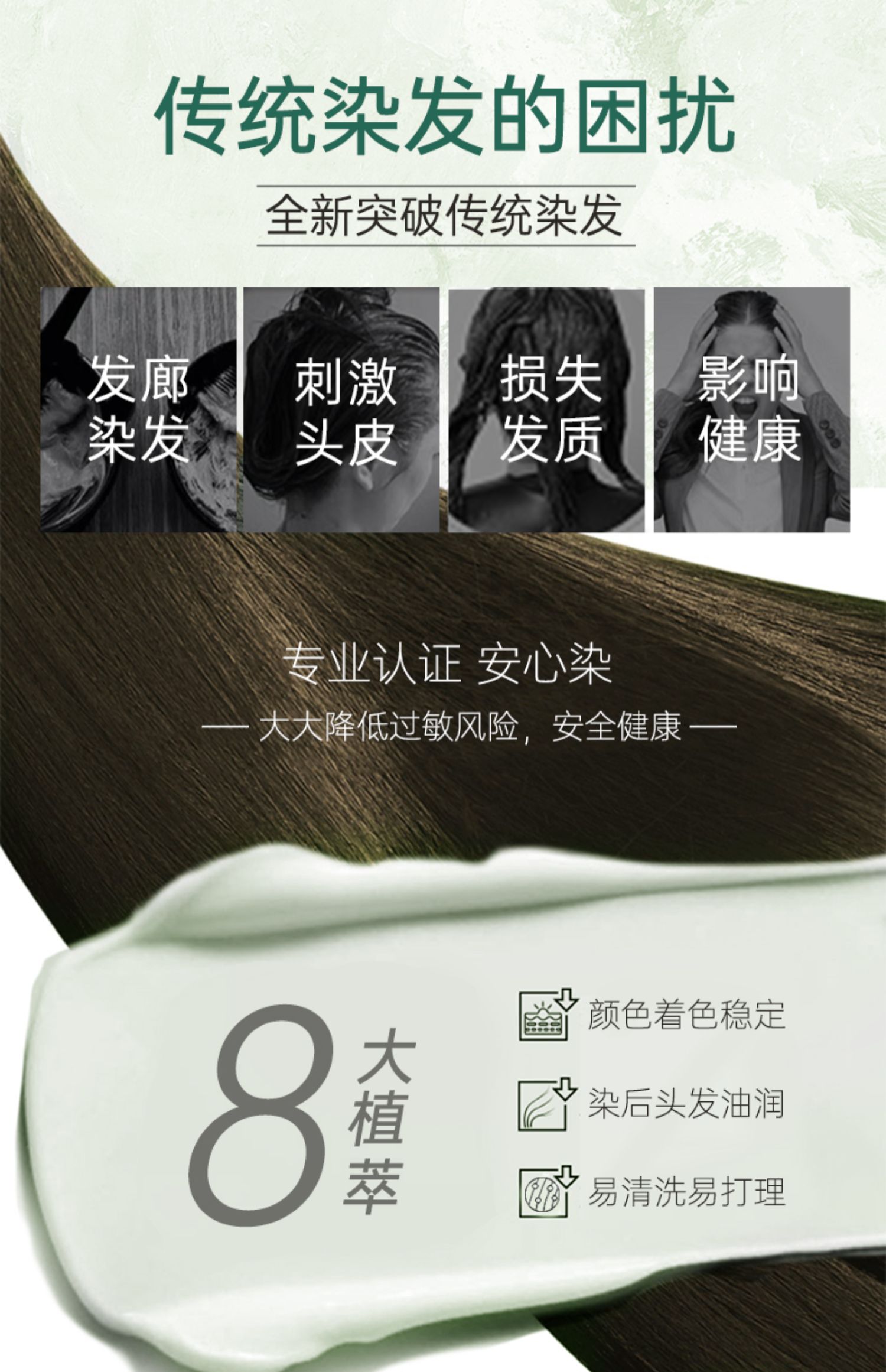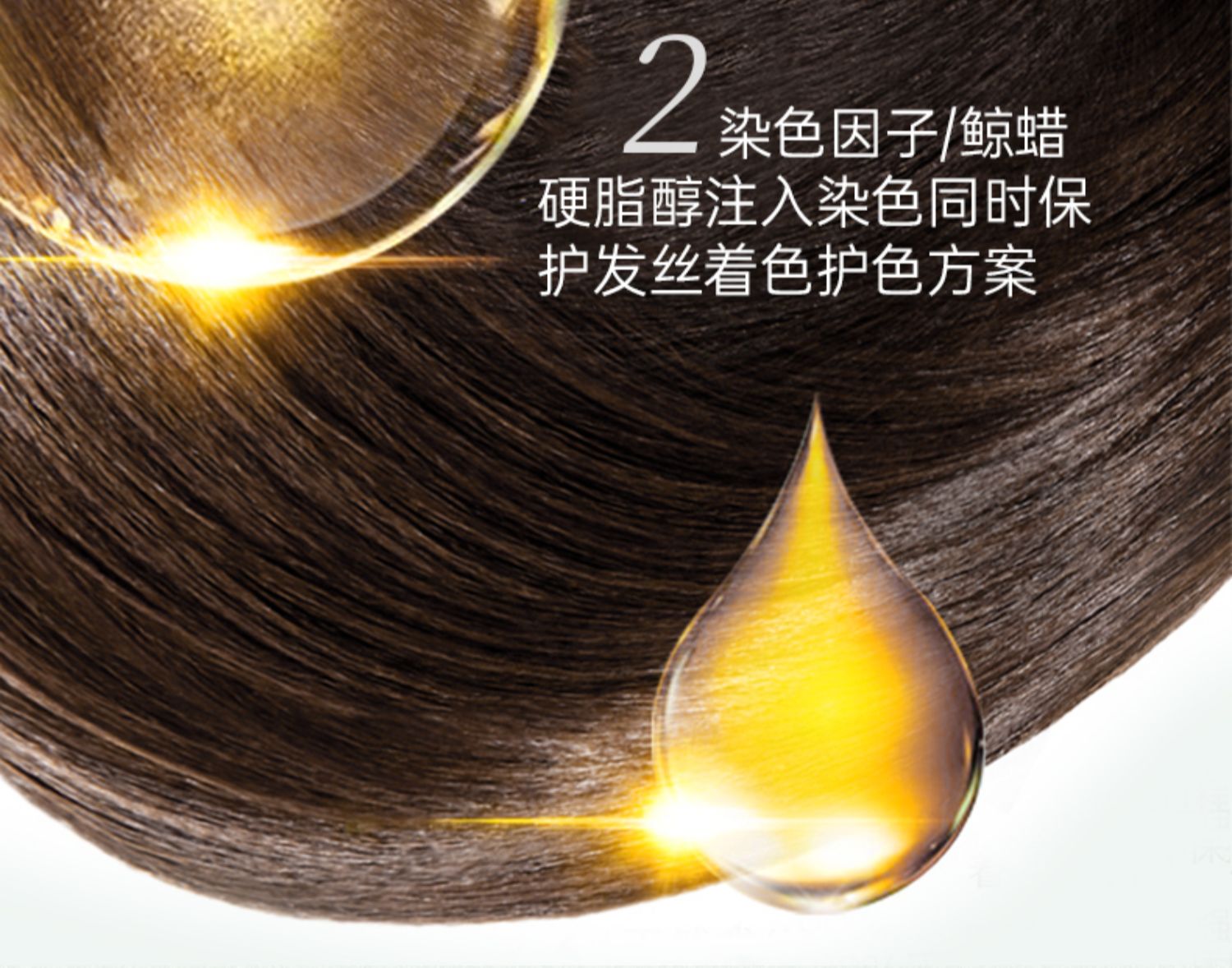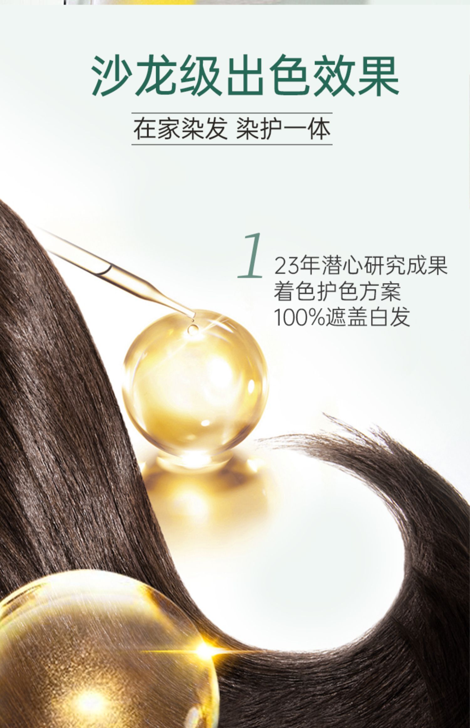 染发+焗油+护发,三效合一,植物养护配方,健康染发,改善多种染烫损伤发质。温和膏体,气味芳香怡人,持久固色,只黑头发,不黑头皮~