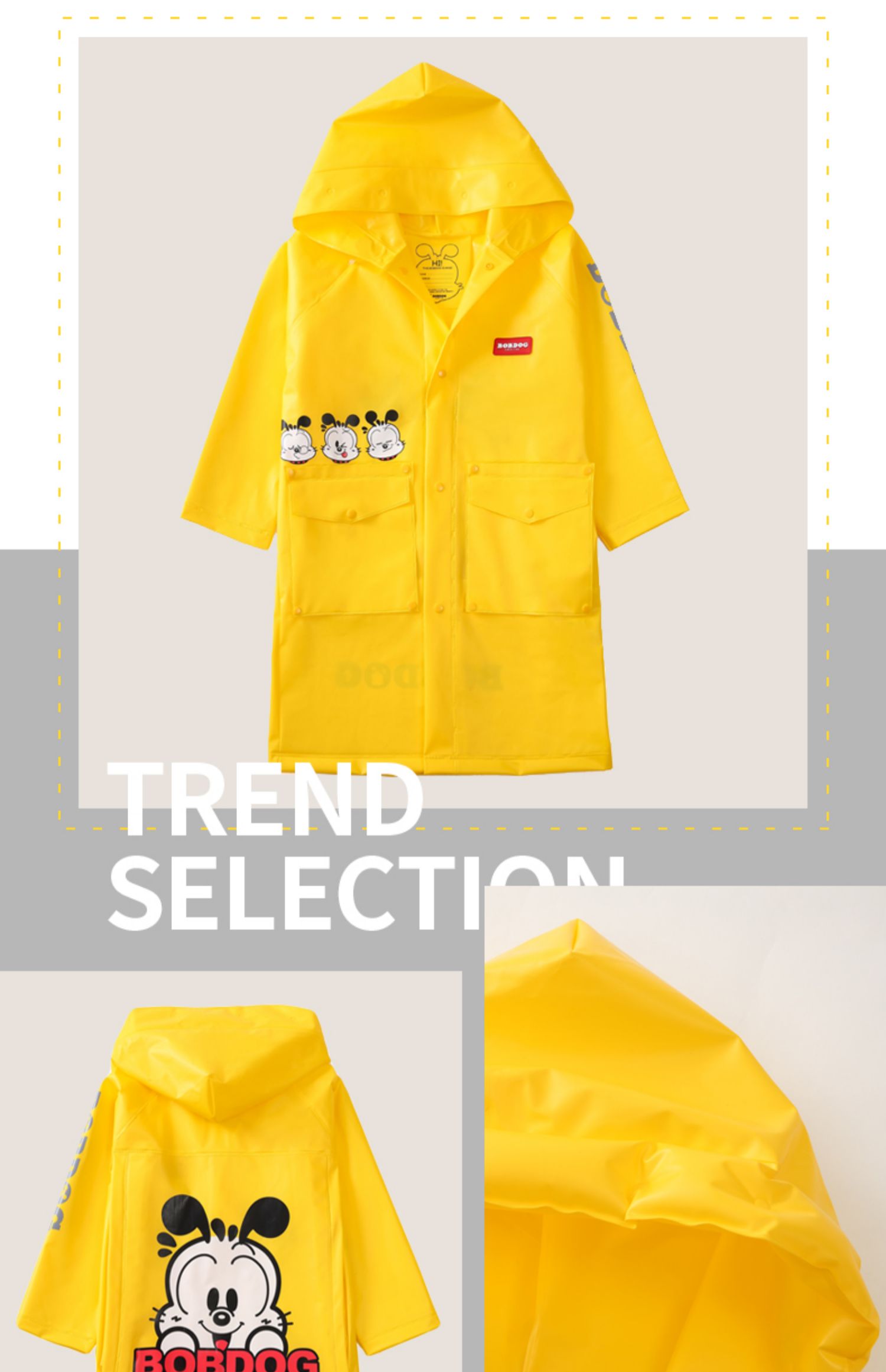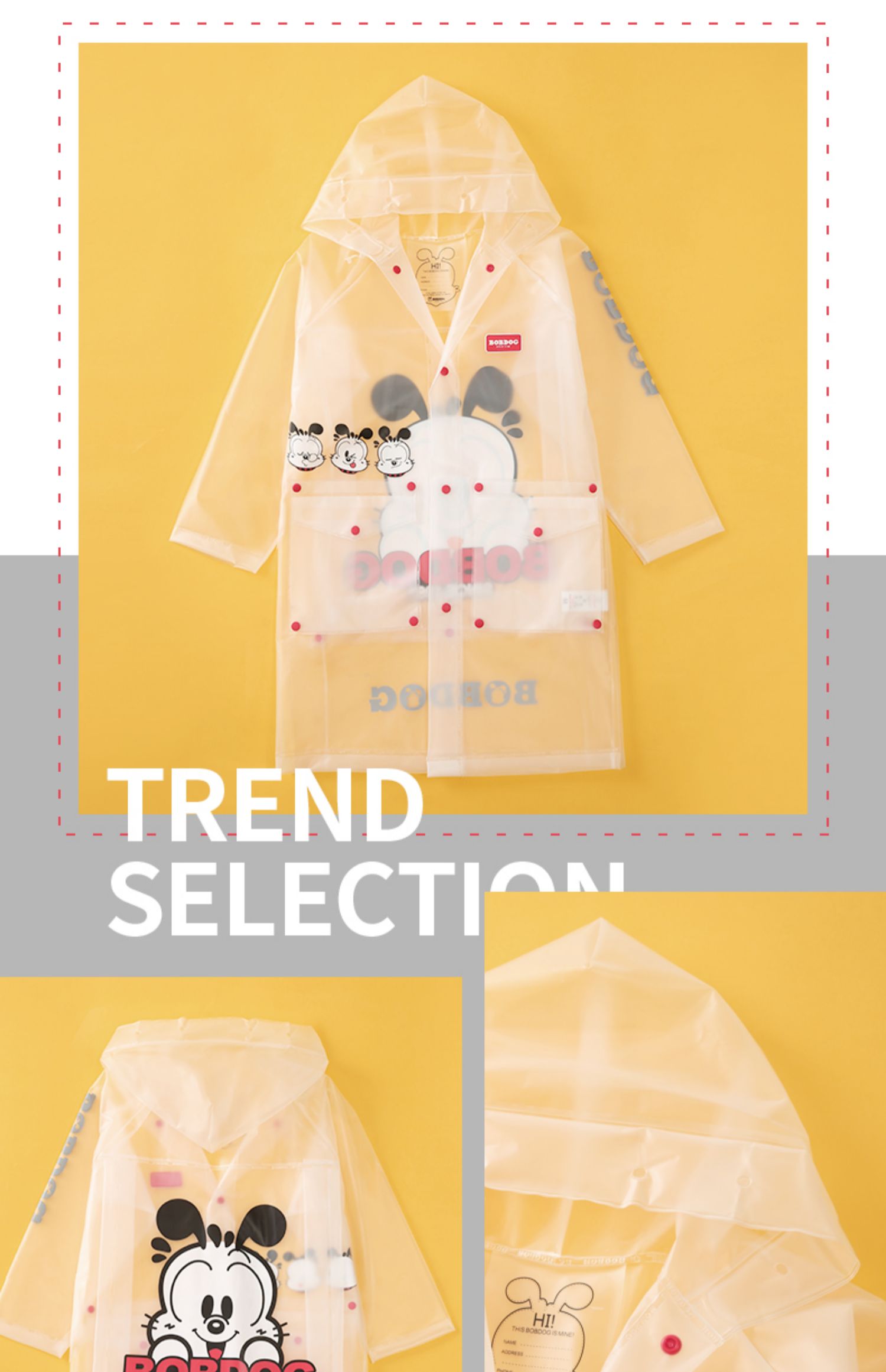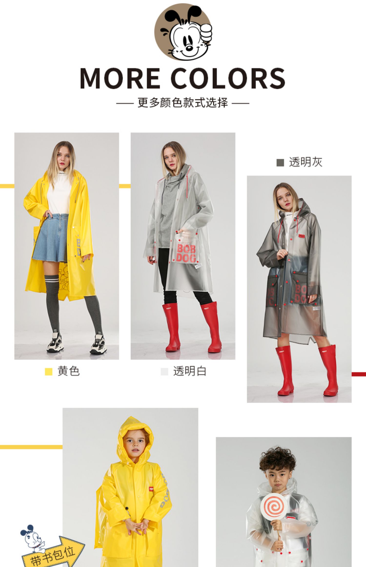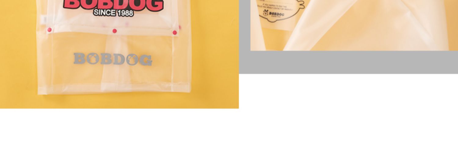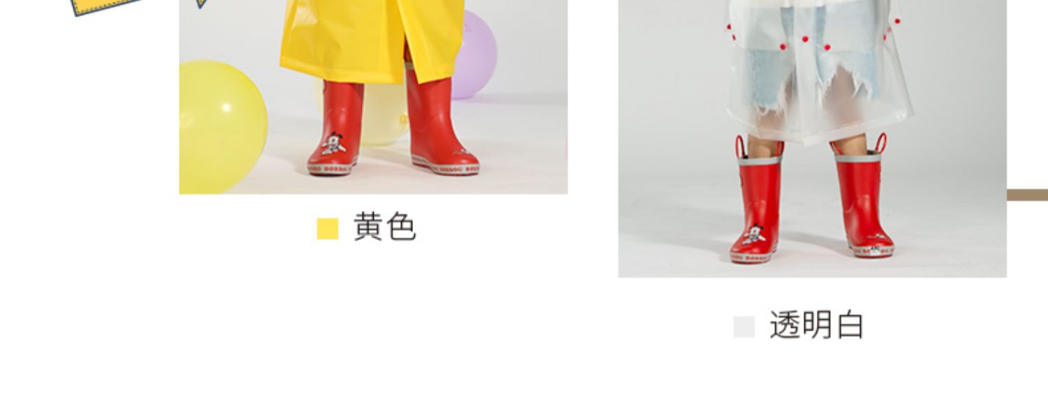TPU材质,卡通形象,专为儿童设计的雨衣,环保面料,柔软舒适,安全无异味,防风挡雨,防水速干,防污耐脏,一擦即净,长久耐用,有反光条,出行更安全。