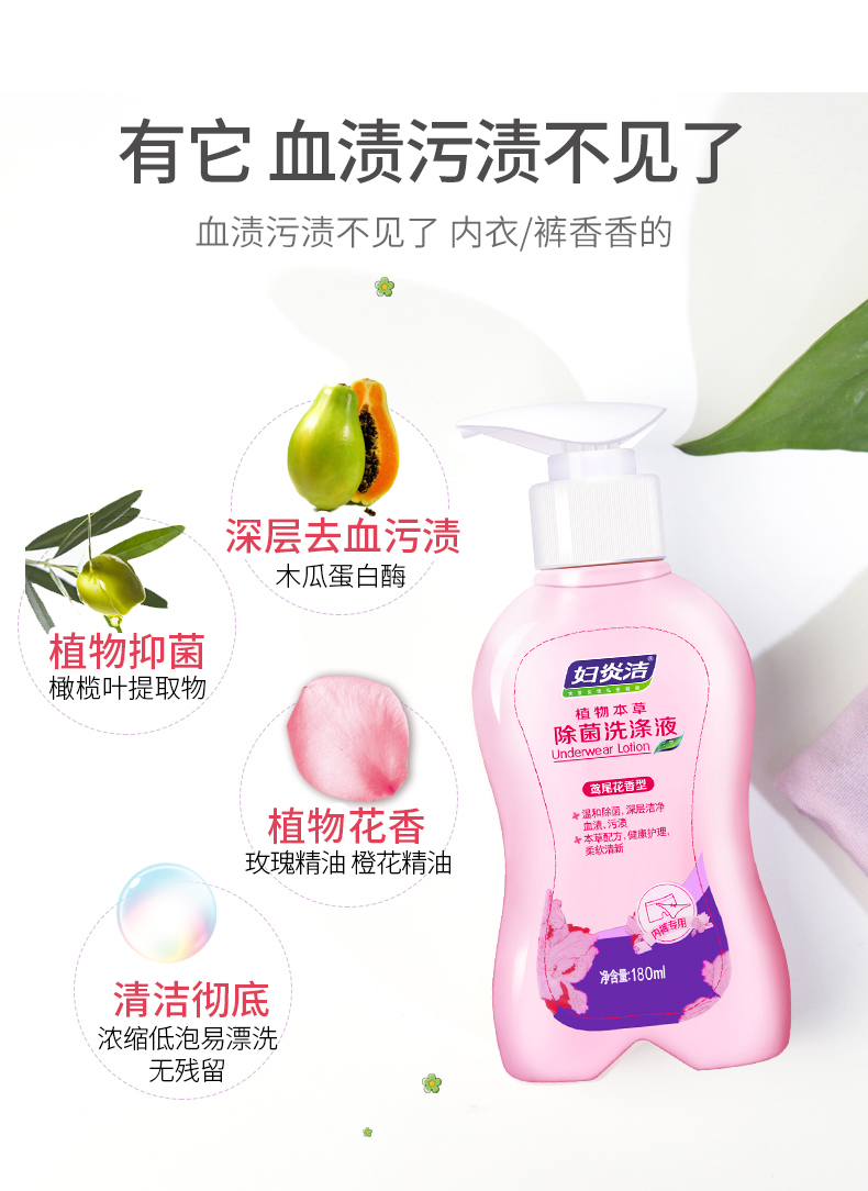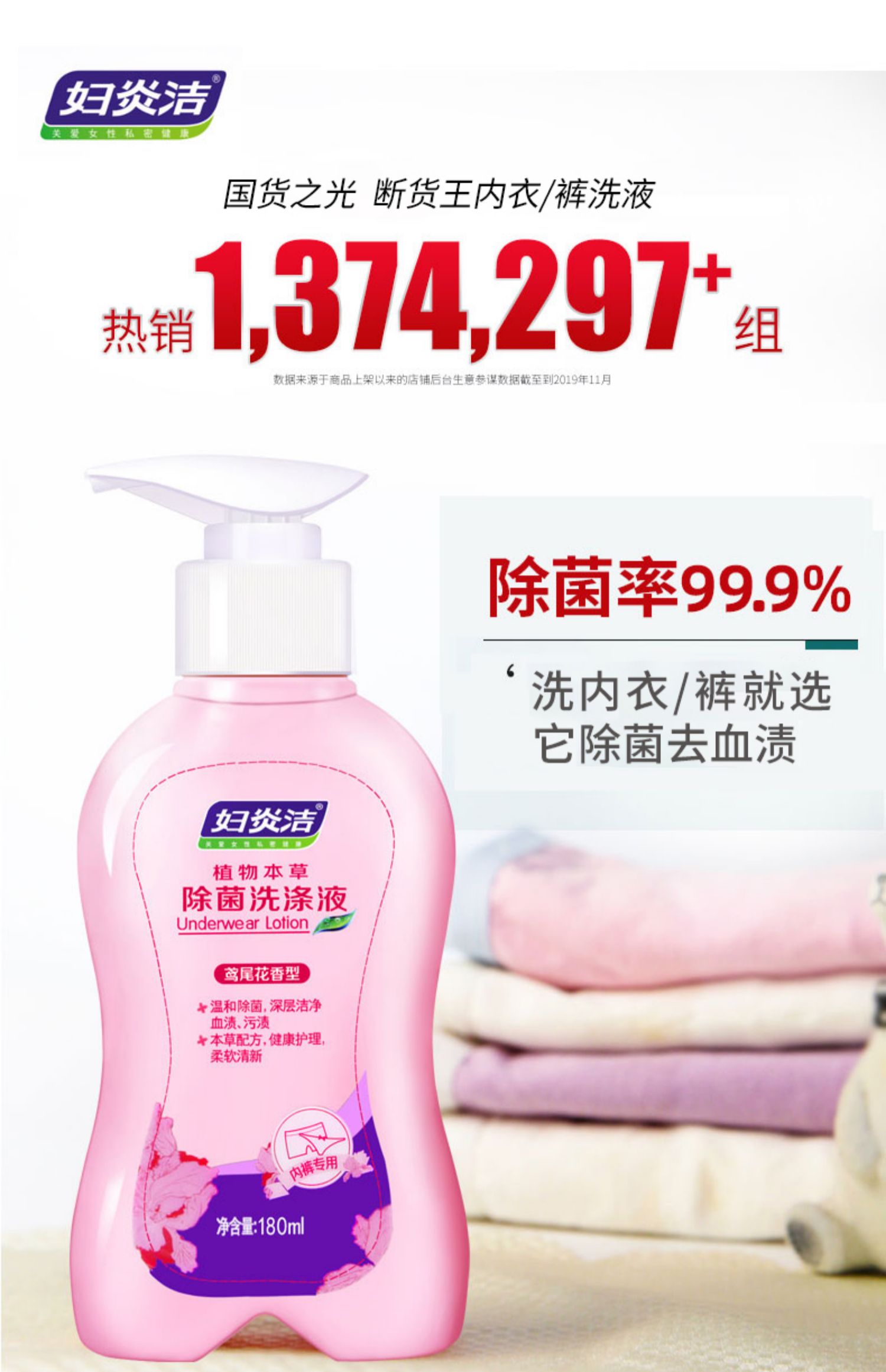 妇炎洁,专注私处健康!看不到的脏才是真脏。萃取植物精华,专洗内裤,强力去血渍,深层清洁,温和抑菌,保持内裤无痕本色无异味!【全家可用】