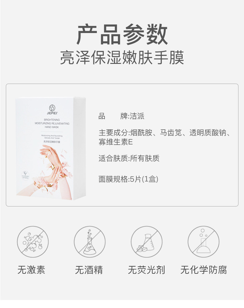 【1包2片】洁派亮白保湿手膜,烟酰胺加倍透亮,表面增润,深层减黄,去角质细纹,修护+嫩白,双效合一,15分钟双手白白嫩嫩,触感如丝帛般细腻。