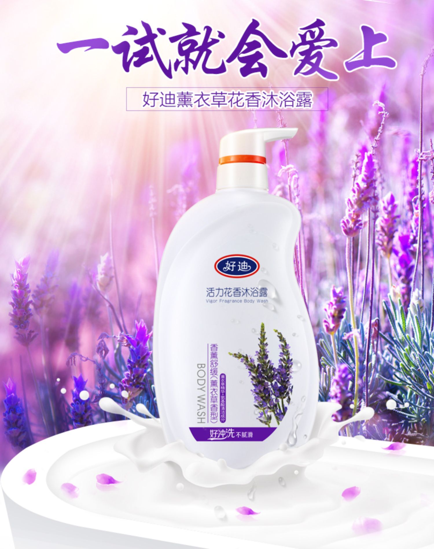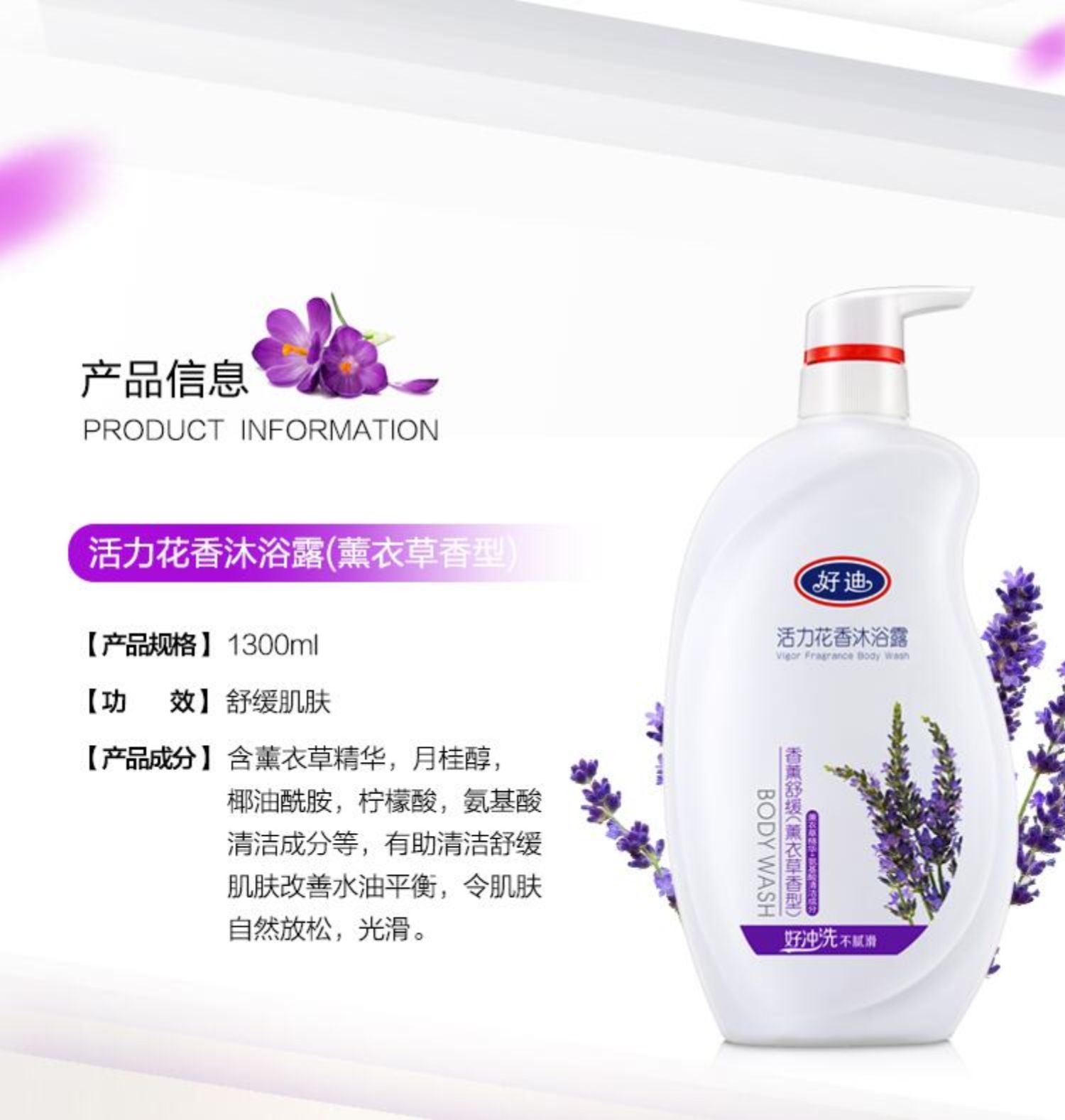 好迪薰衣草花香沐浴露,浪漫的薰衣草香芬,保湿滋润,持久留香,泡沫绵密,好冲洗不腻滑,1300ml大瓶装一瓶抵2瓶,梦幻薰衣草花香陪伴呵护家人