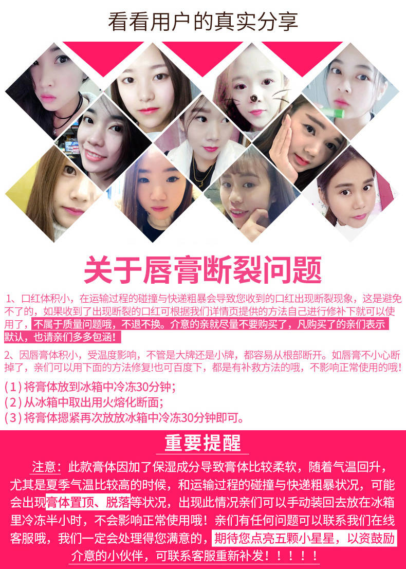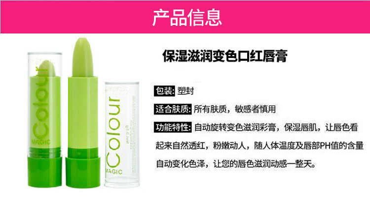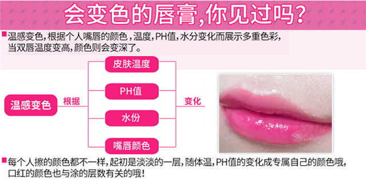 【AAA环保级孕妇也可用】精选健康原材料,萃取牛油果,胡萝卜素,维生素E,天然蜂蜡,滋润保湿不干裂,增加唇部肌肤弹性,淡化唇纹,随温度变色,千人千色,打造你的专属唇妆。