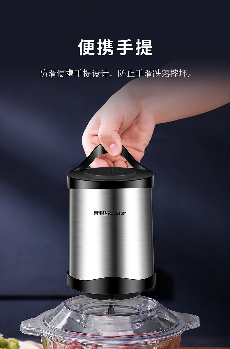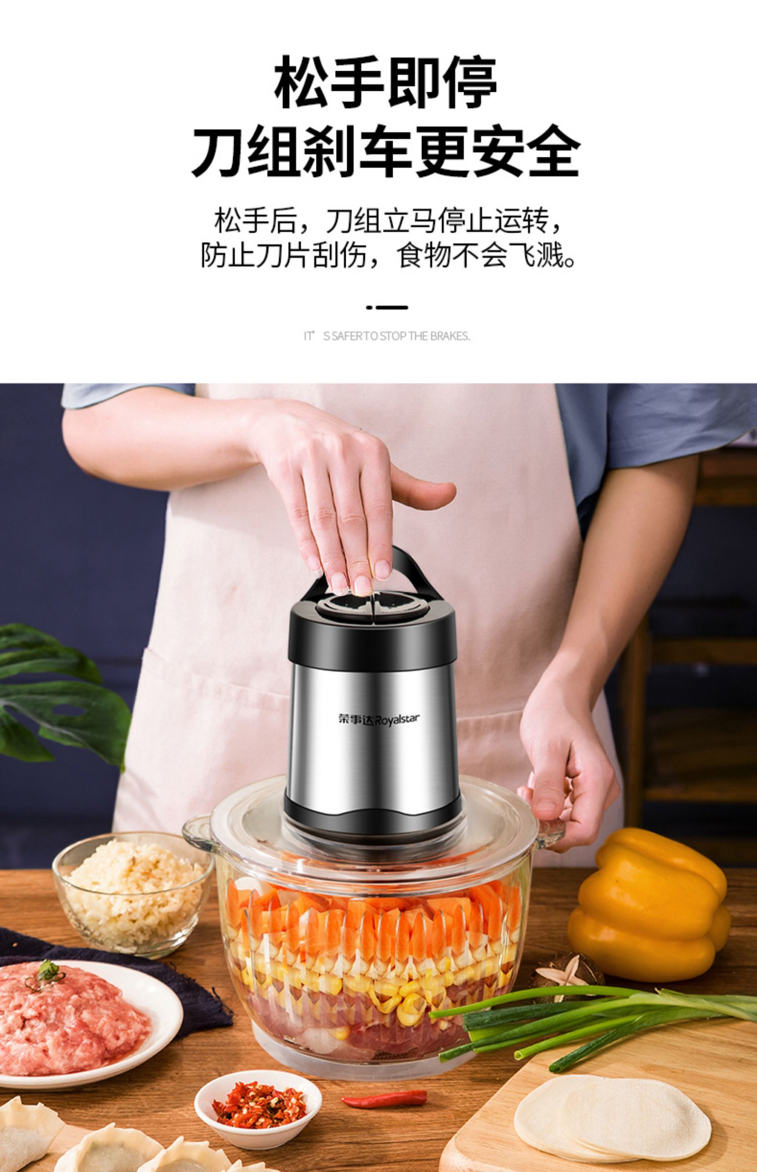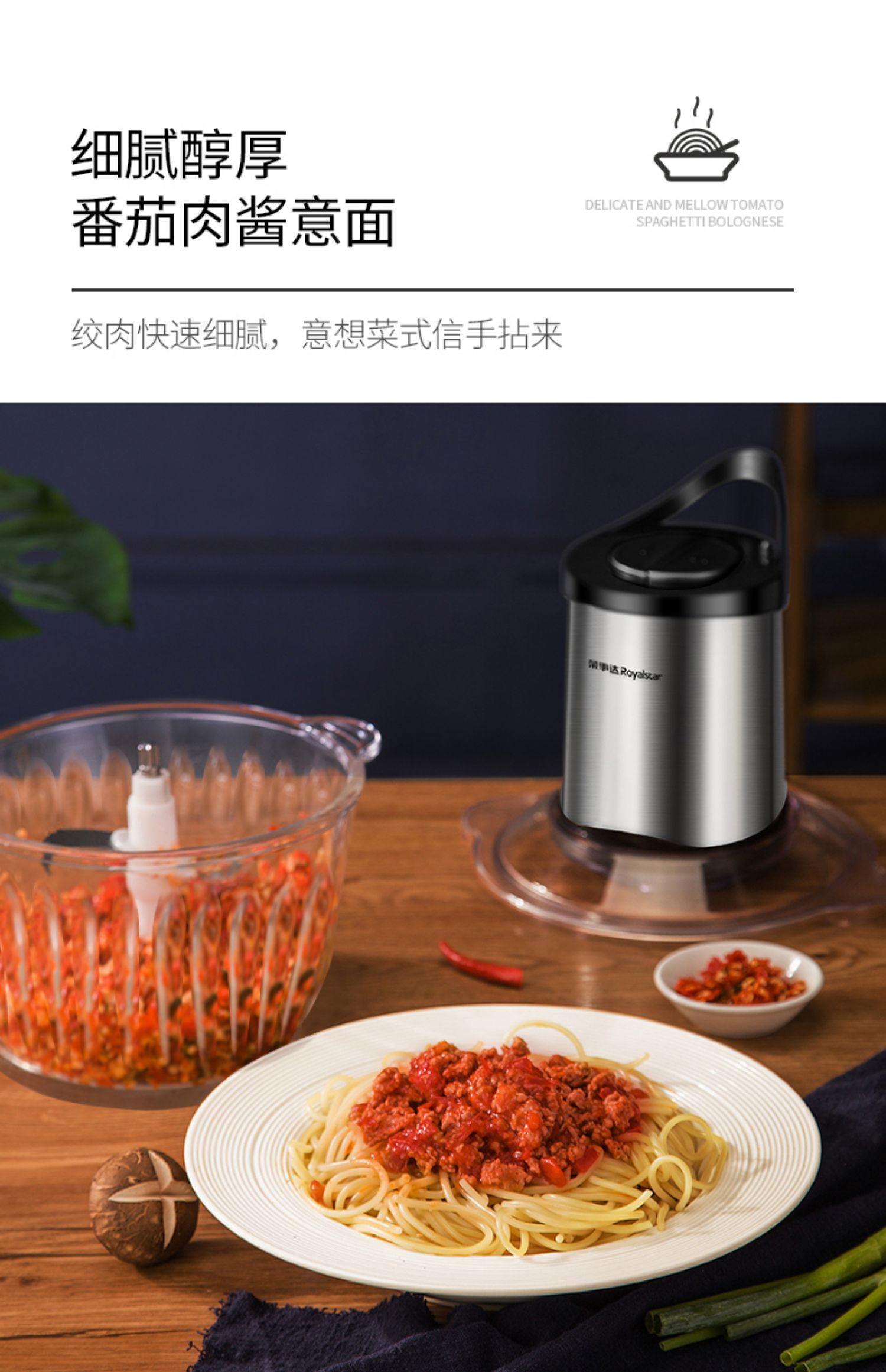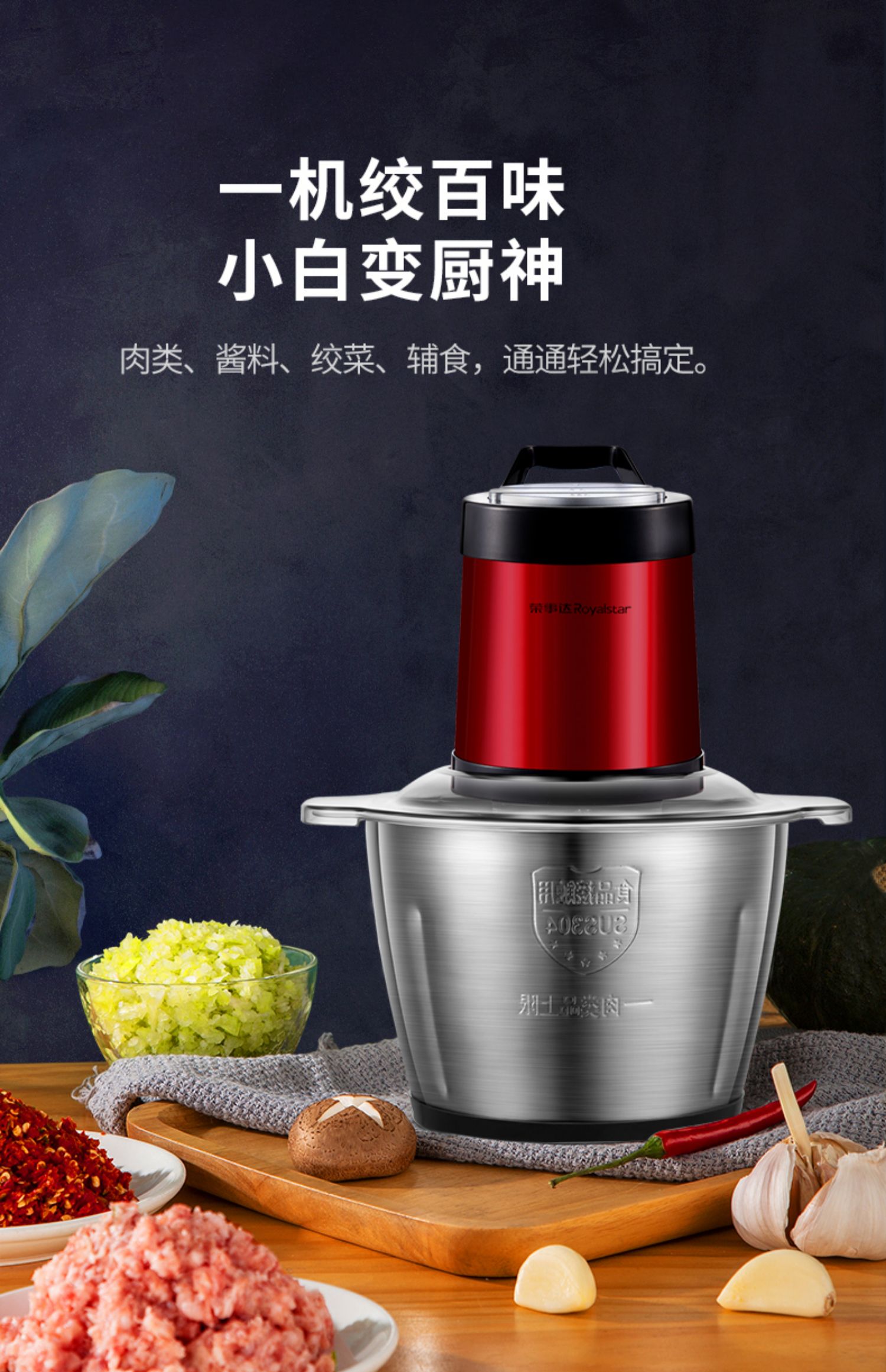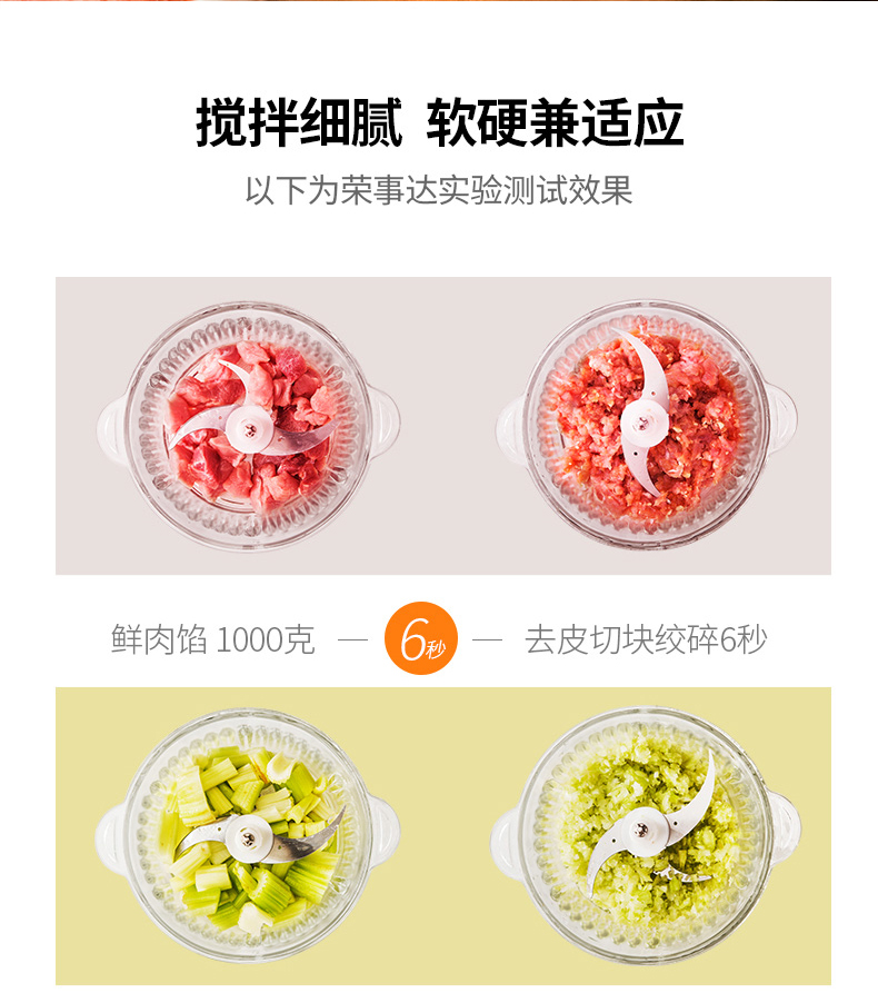 【荣事达家用多功能绞肉机】67年老牌国货,双刀双层立体S型锋刀,360°快速均匀搅拌,6秒绞出细腻,可拆卸清洗,一冲即净,ABS材质上盖,304不锈钢主机,底部安全童锁,防滑便携手提设计,解放双手。