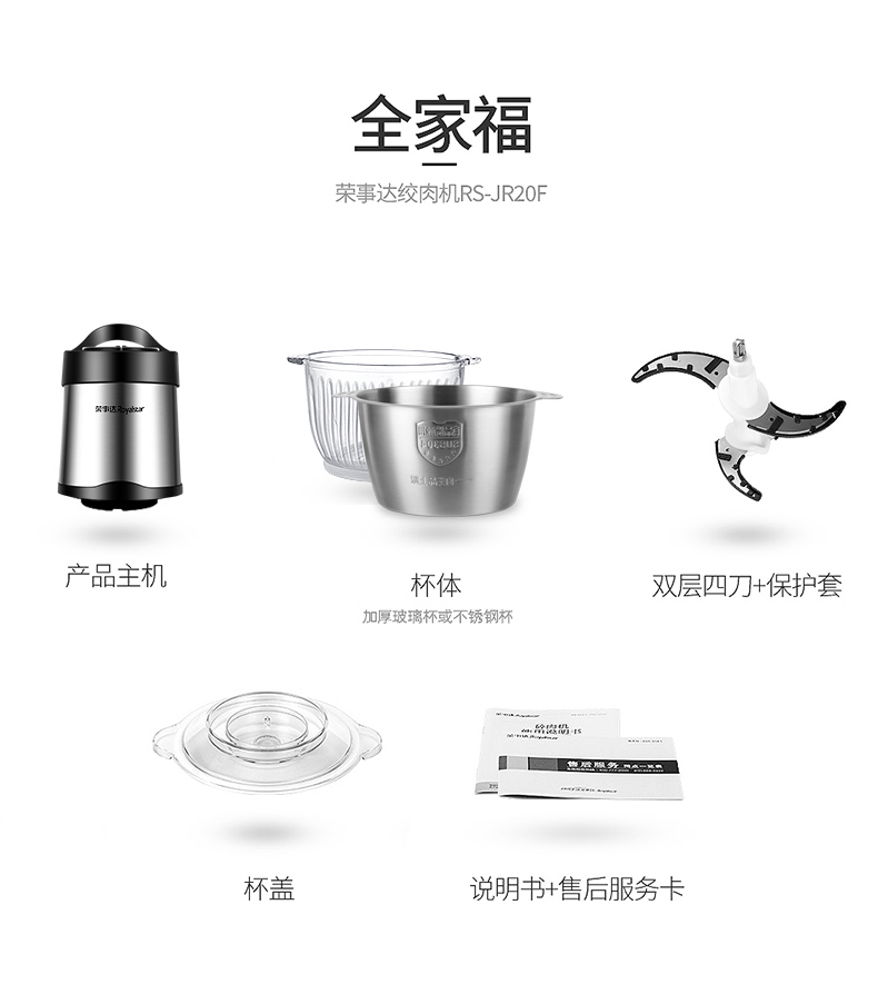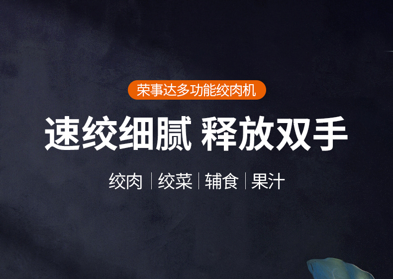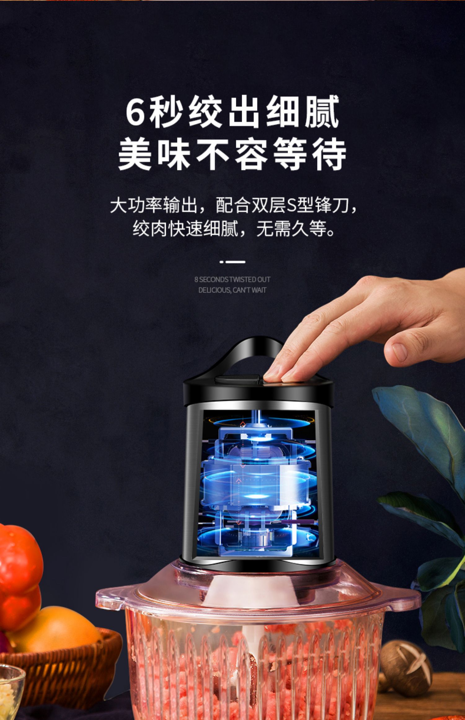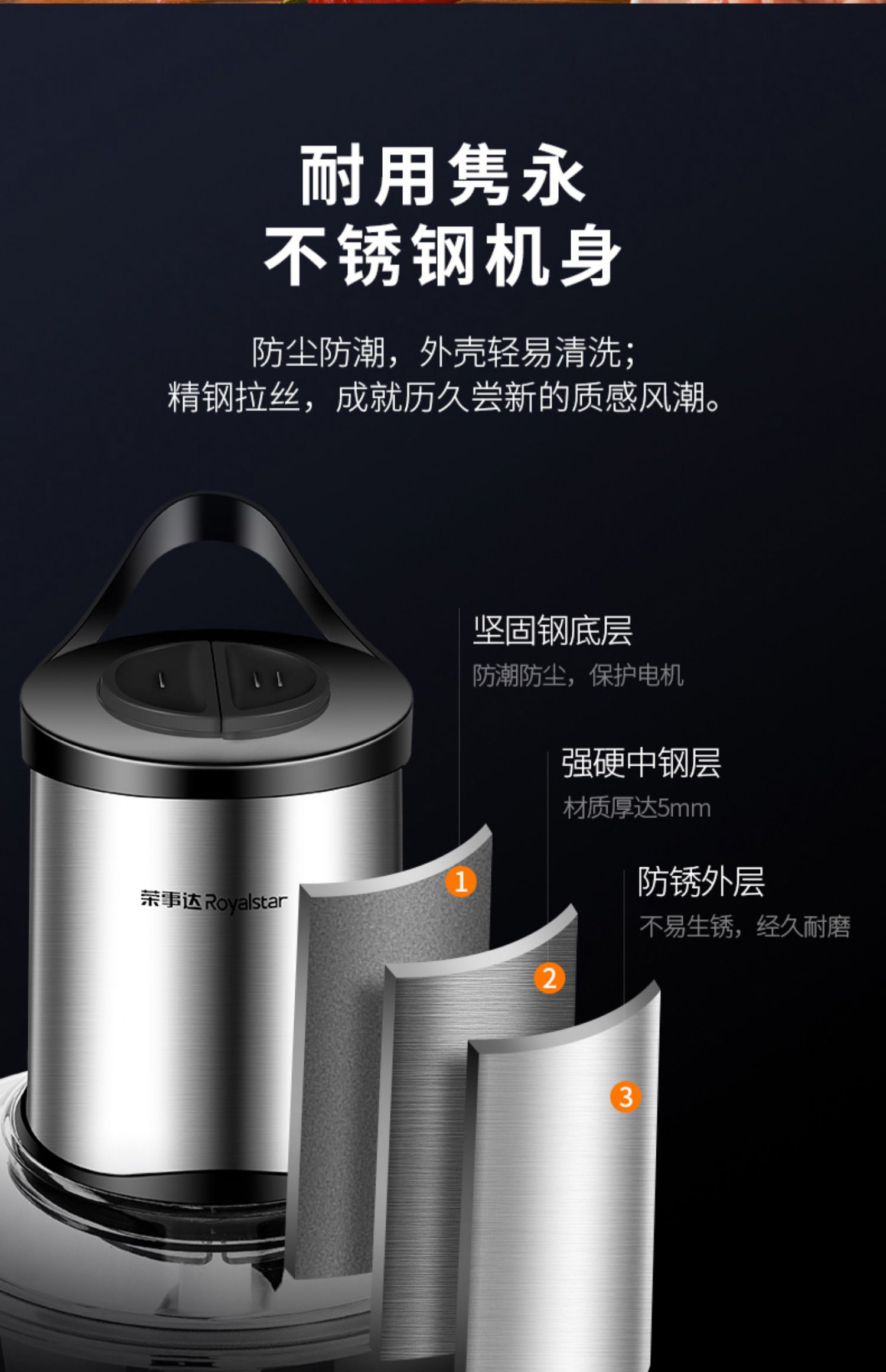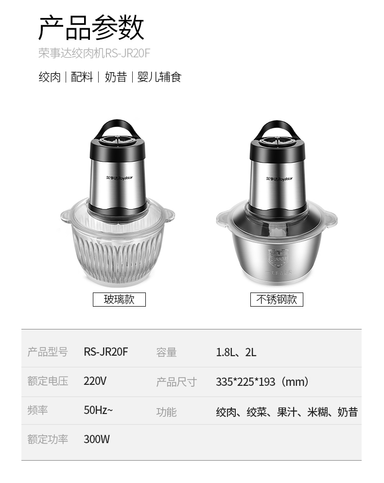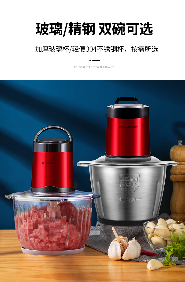 【荣事达家用多功能绞肉机】67年老牌国货,双刀双层立体S型锋刀,360°快速均匀搅拌,6秒绞出细腻,可拆卸清洗,一冲即净,ABS材质上盖,304不锈钢主机,底部安全童锁,防滑便携手提设计,解放双手。