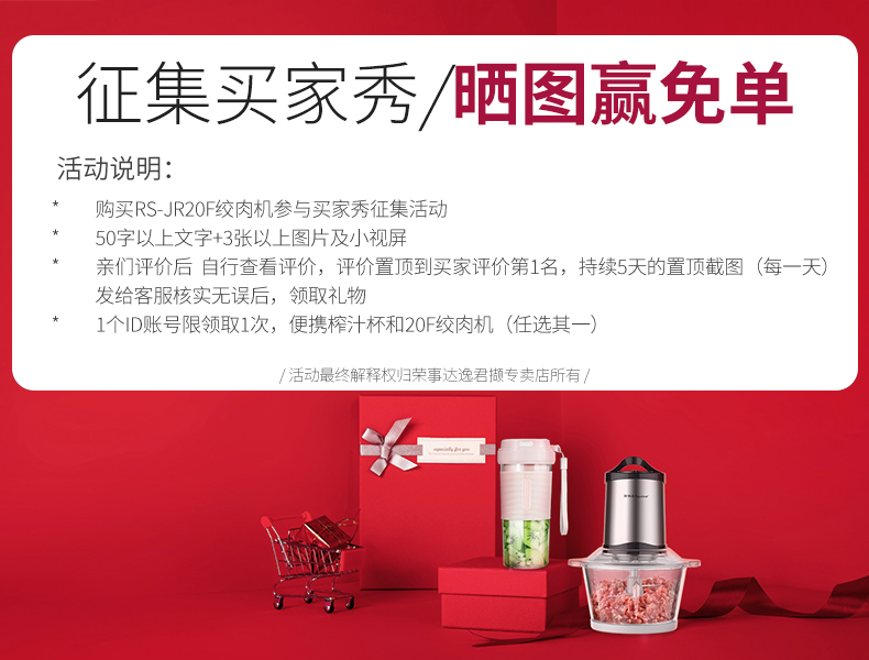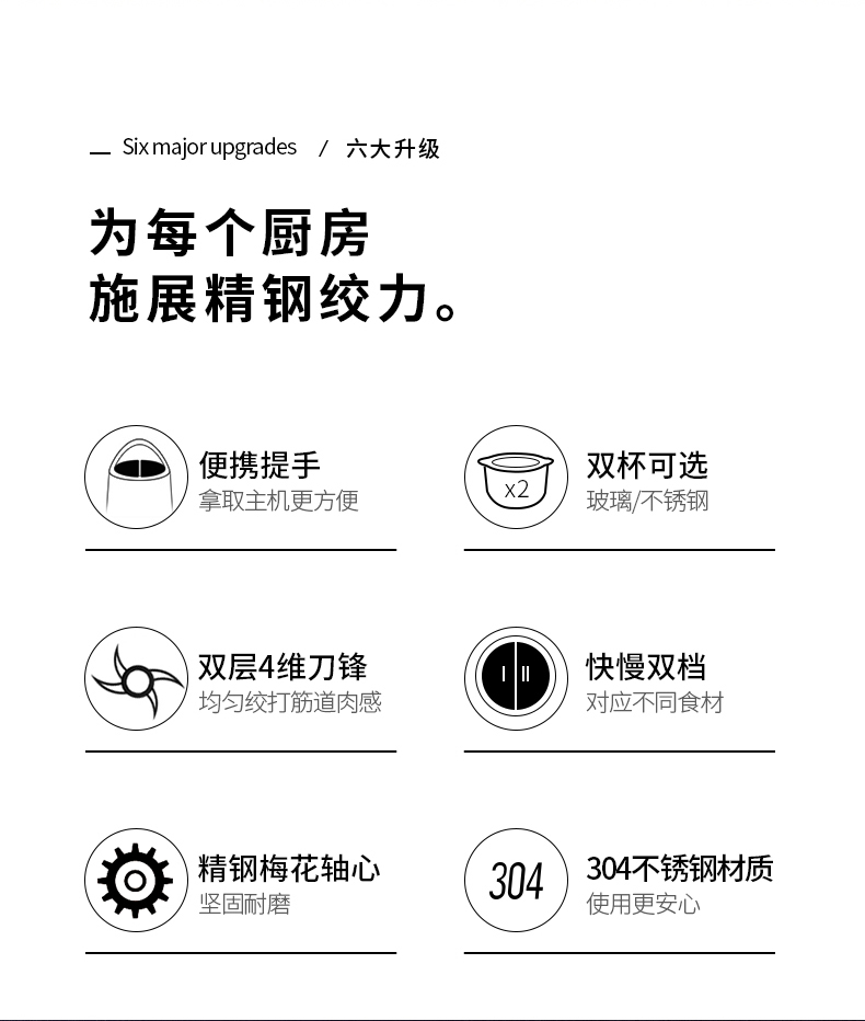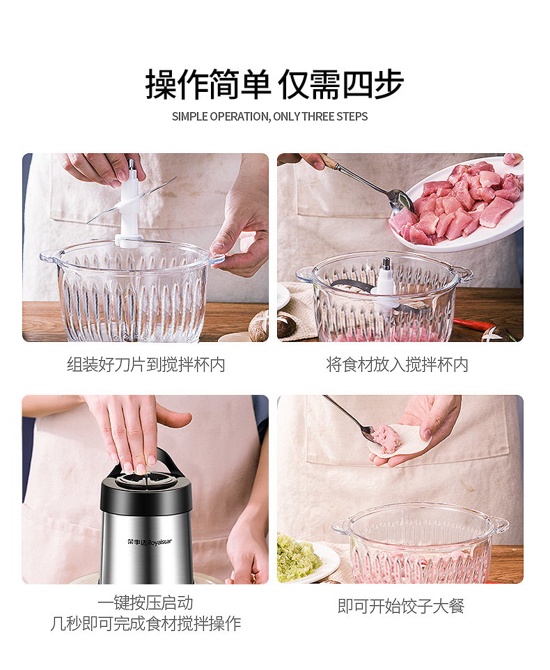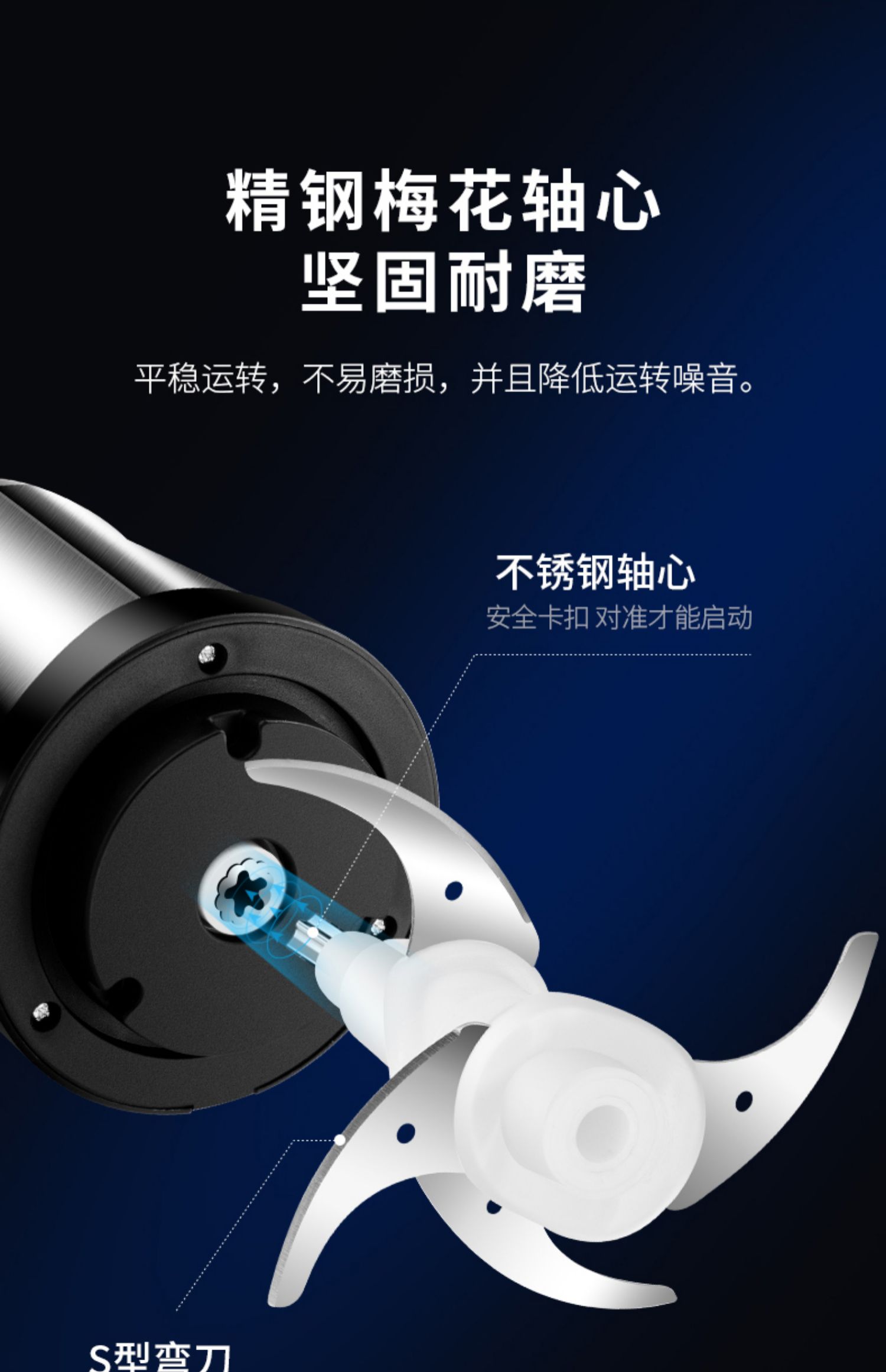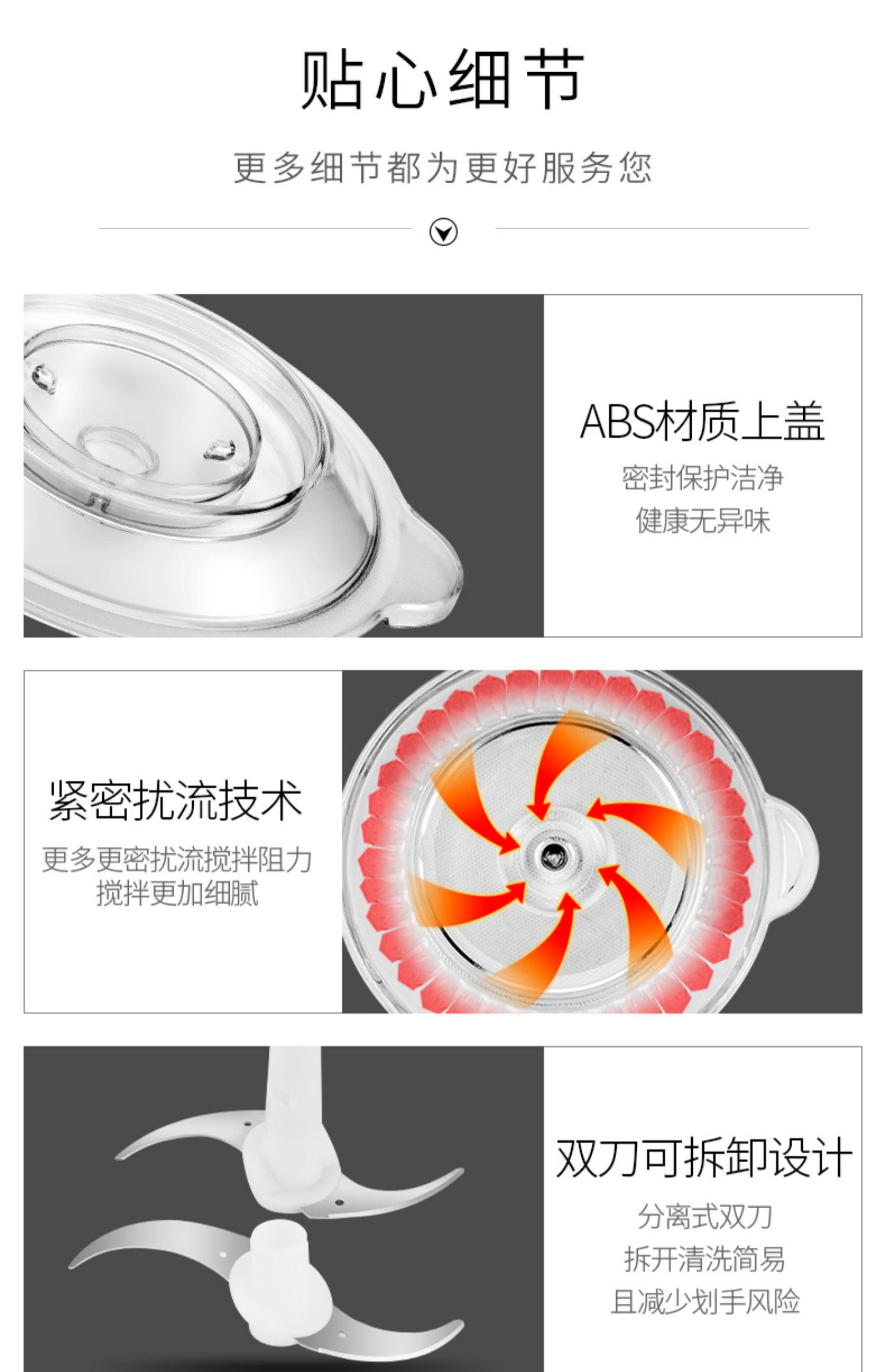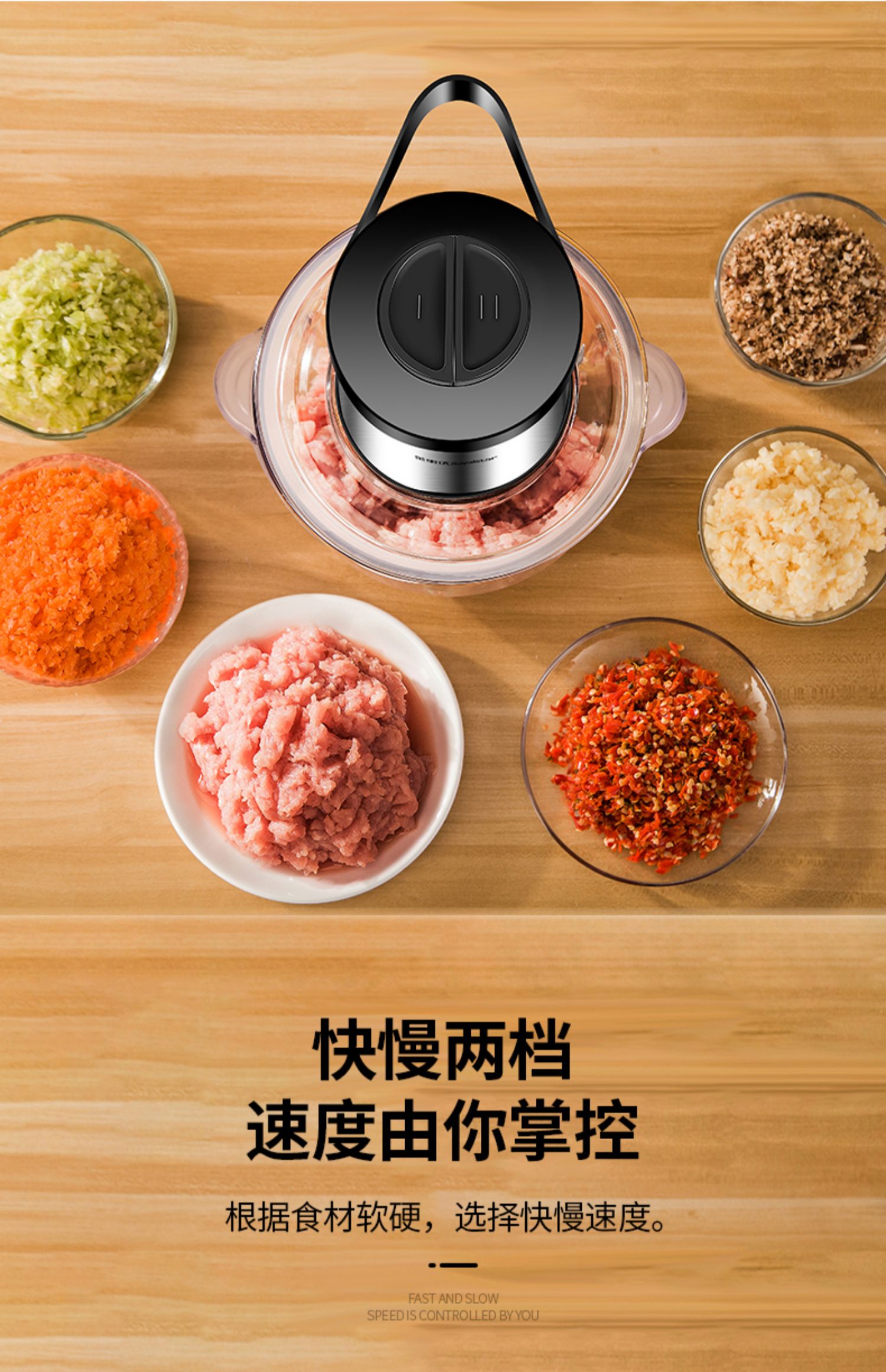 【荣事达家用多功能绞肉机】67年老牌国货,双刀双层立体S型锋刀,360°快速均匀搅拌,6秒绞出细腻,可拆卸清洗,一冲即净,ABS材质上盖,304不锈钢主机,底部安全童锁,防滑便携手提设计,解放双手。