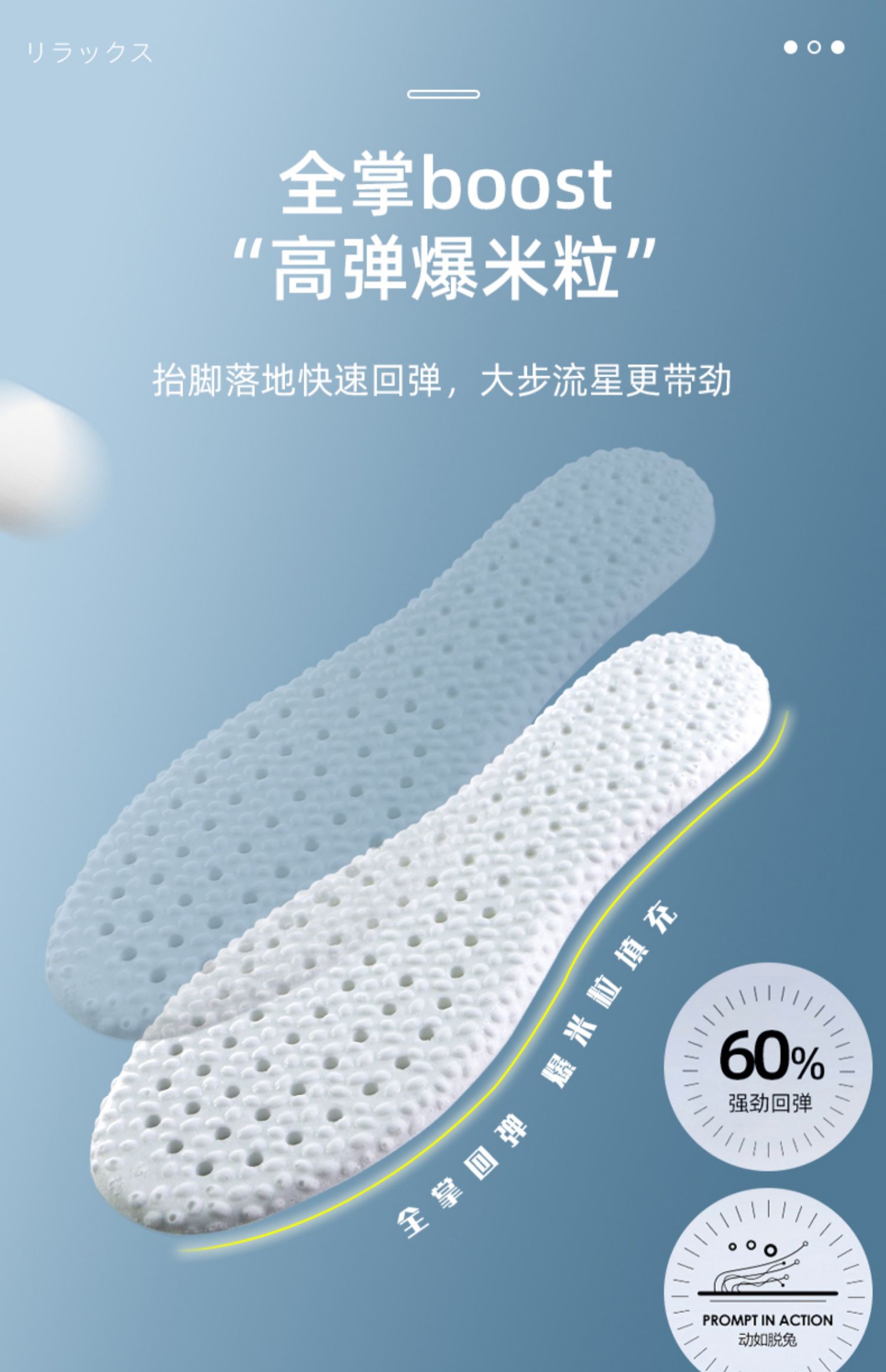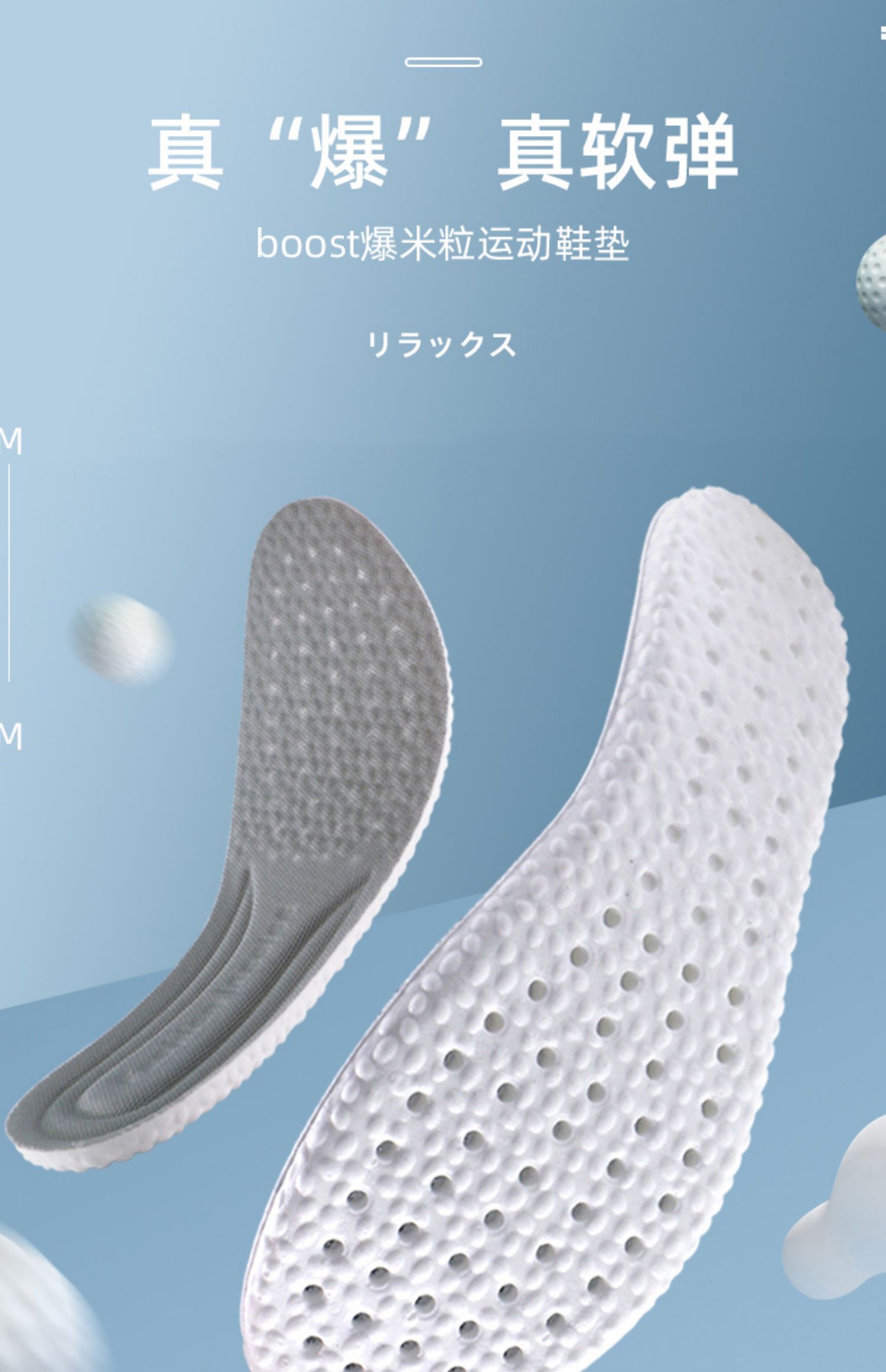 踩屎感boost运动鞋垫,全掌boost高弹爆米粒:60%以上回弹,上脚就能感受到满满踩屎感,透气网眼:内外空气循环,深U跟杯:人体工学设计,专为护踝护膝。