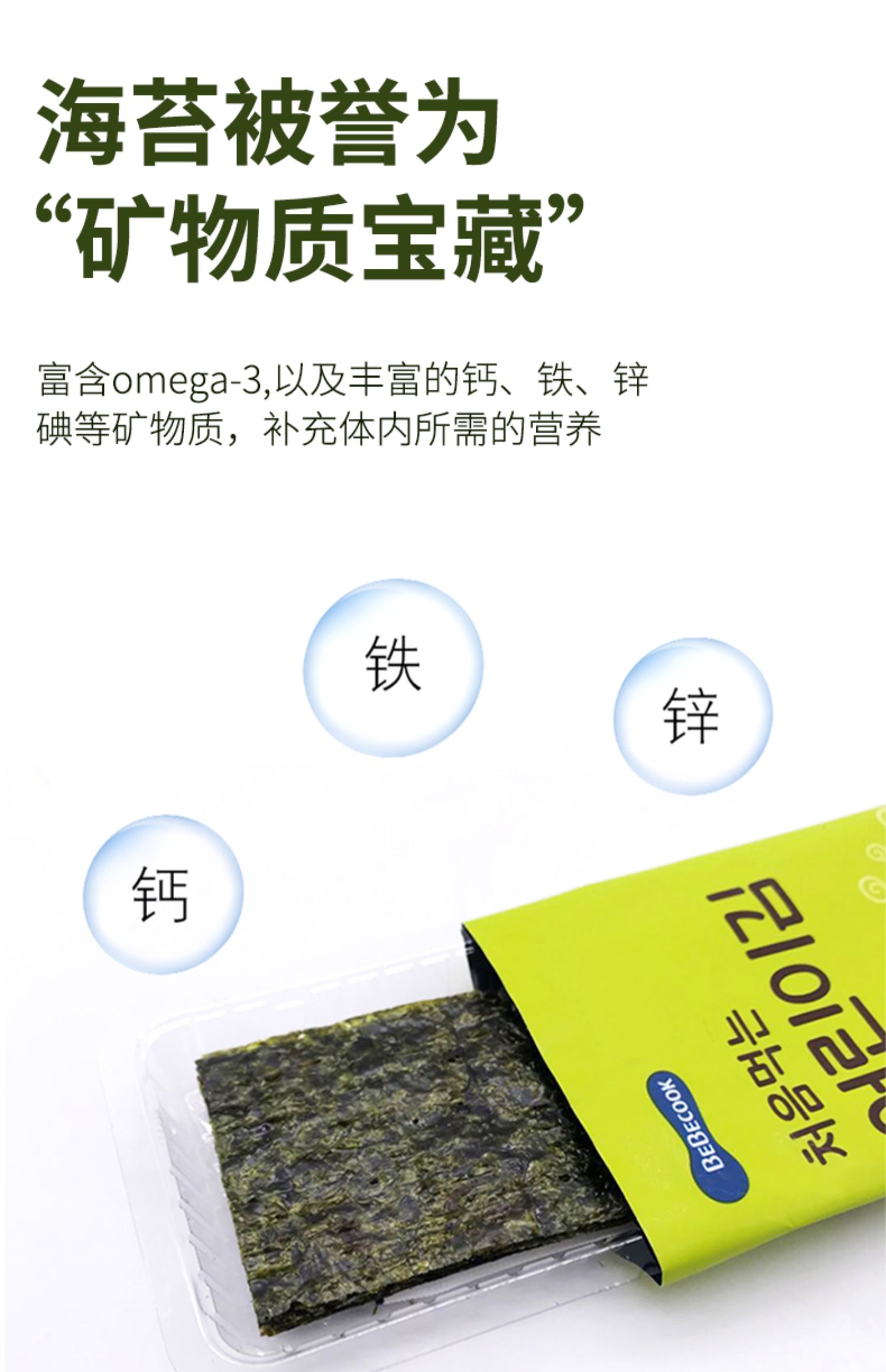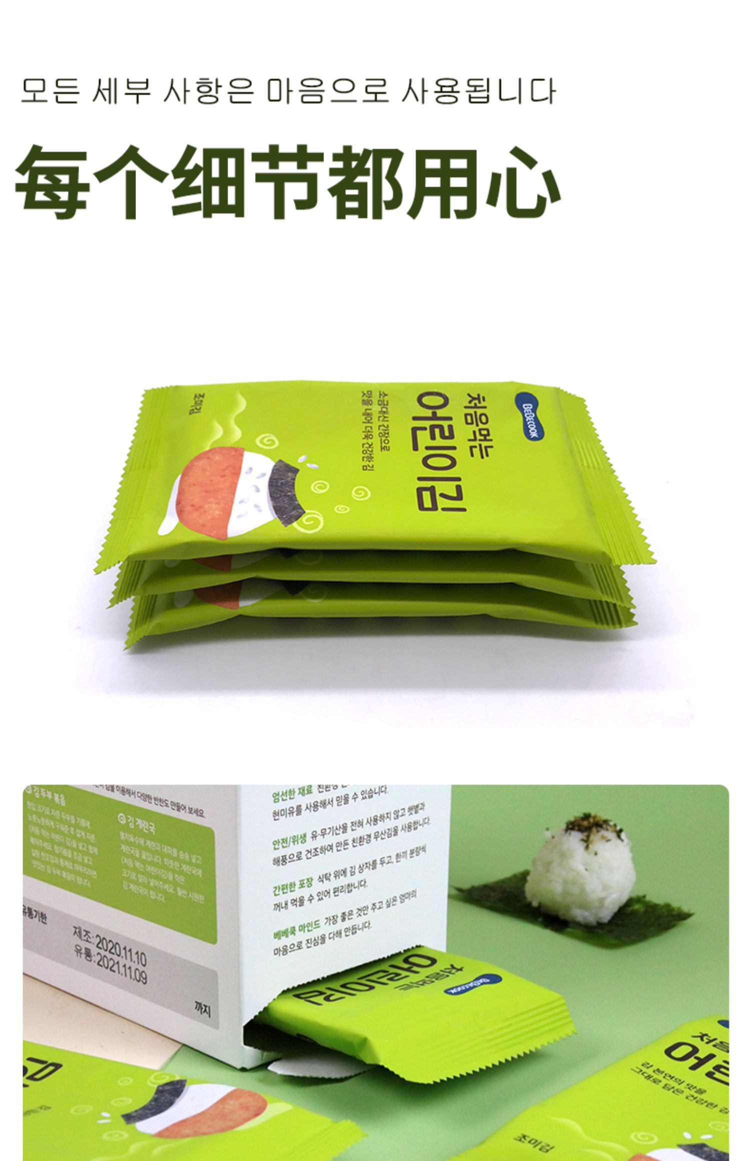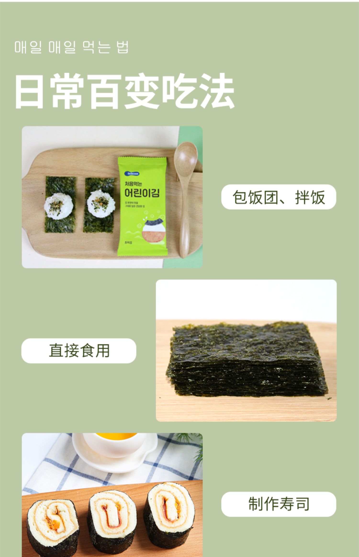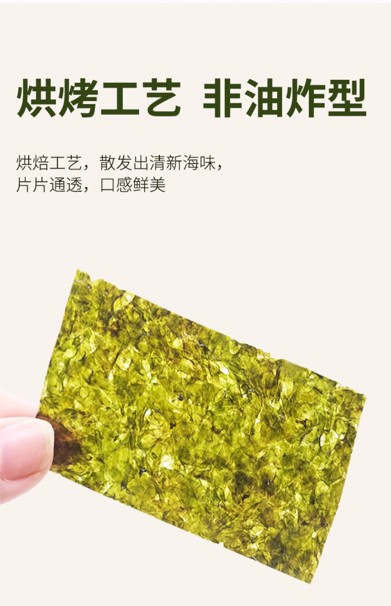 韩国有机海苔,无酸性处理,自然晾晒风干,烘焙工艺,非油炸型,散发清新海味,片片通透,口感鲜美,不添加盐,无添加剂