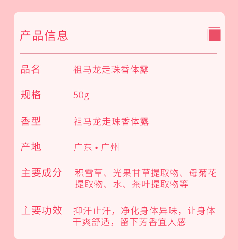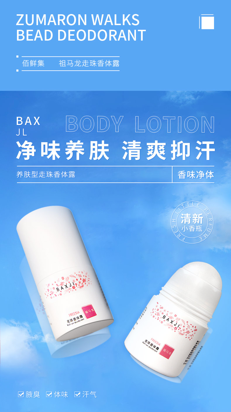 各大网红都在用的爆款单品,芳香怡人,香味持久,水润易推,夏天神仙单品,佰鲜集!祖马龙走珠香体露,香体净味,远离尴尬,抑汗止汗,让身体干爽舒适,快来抢购吧!