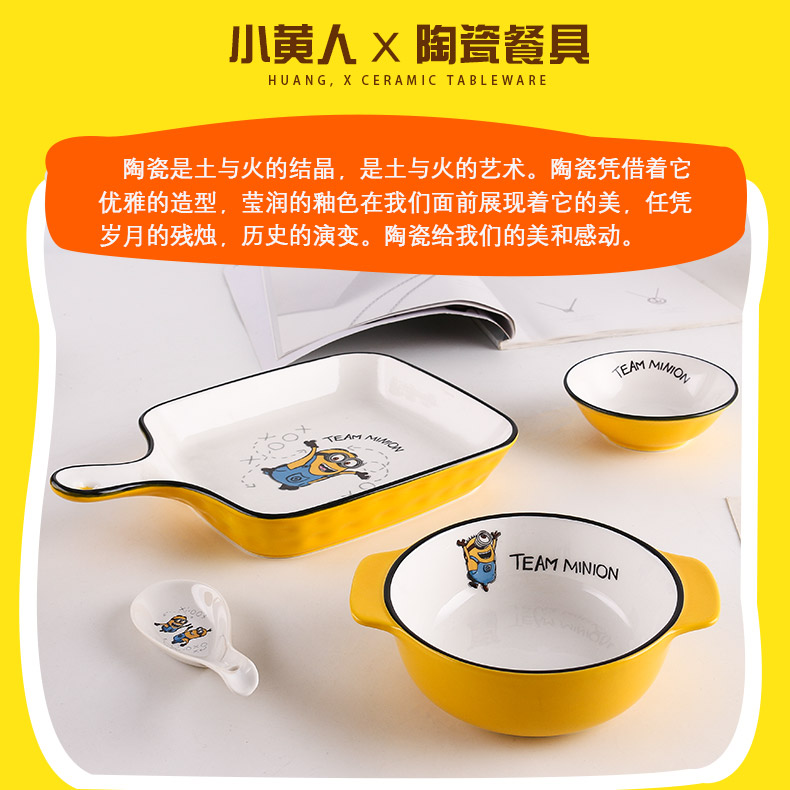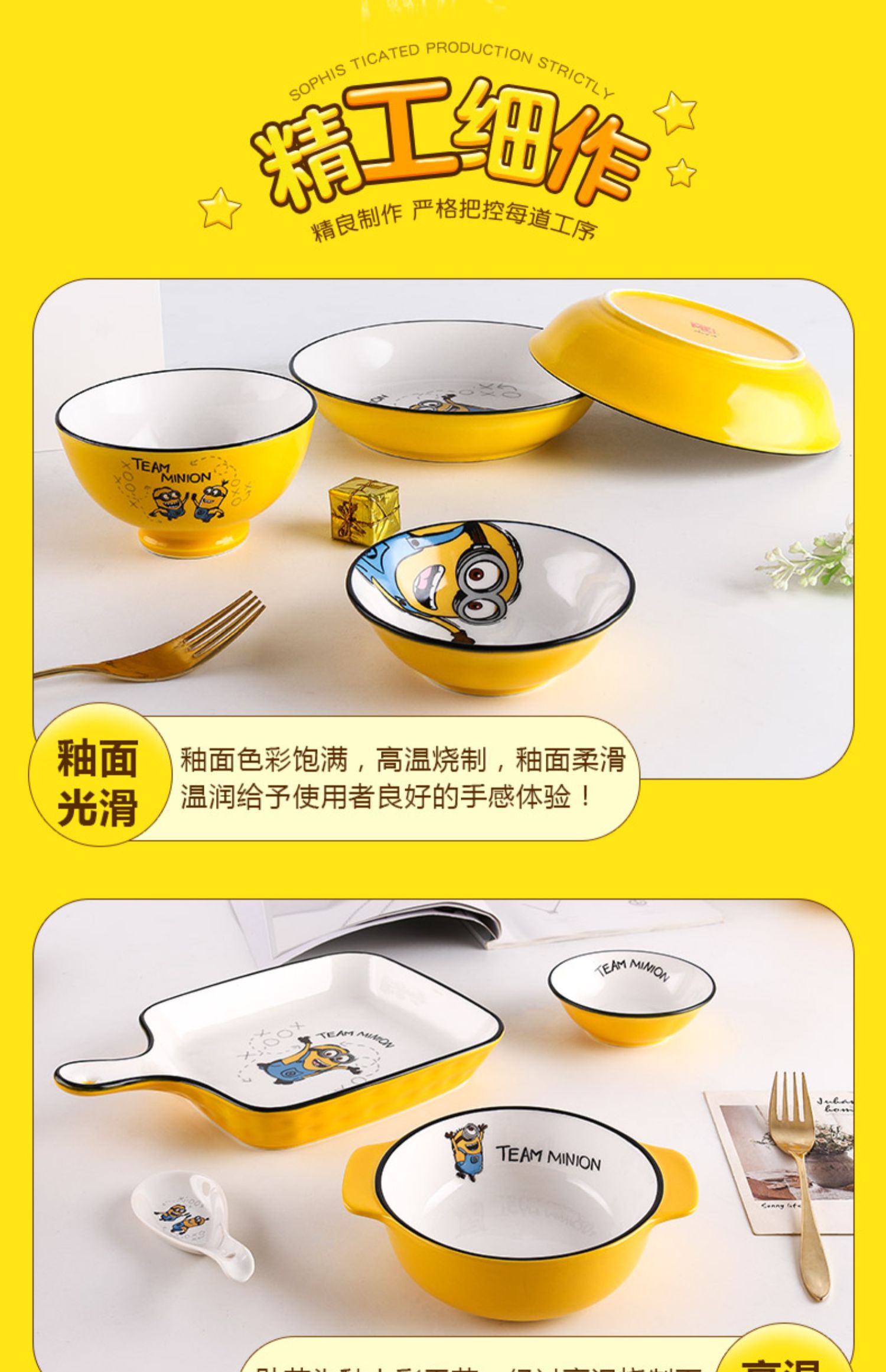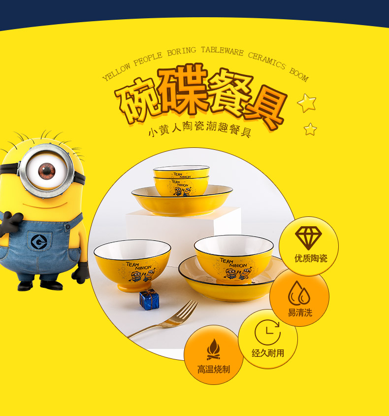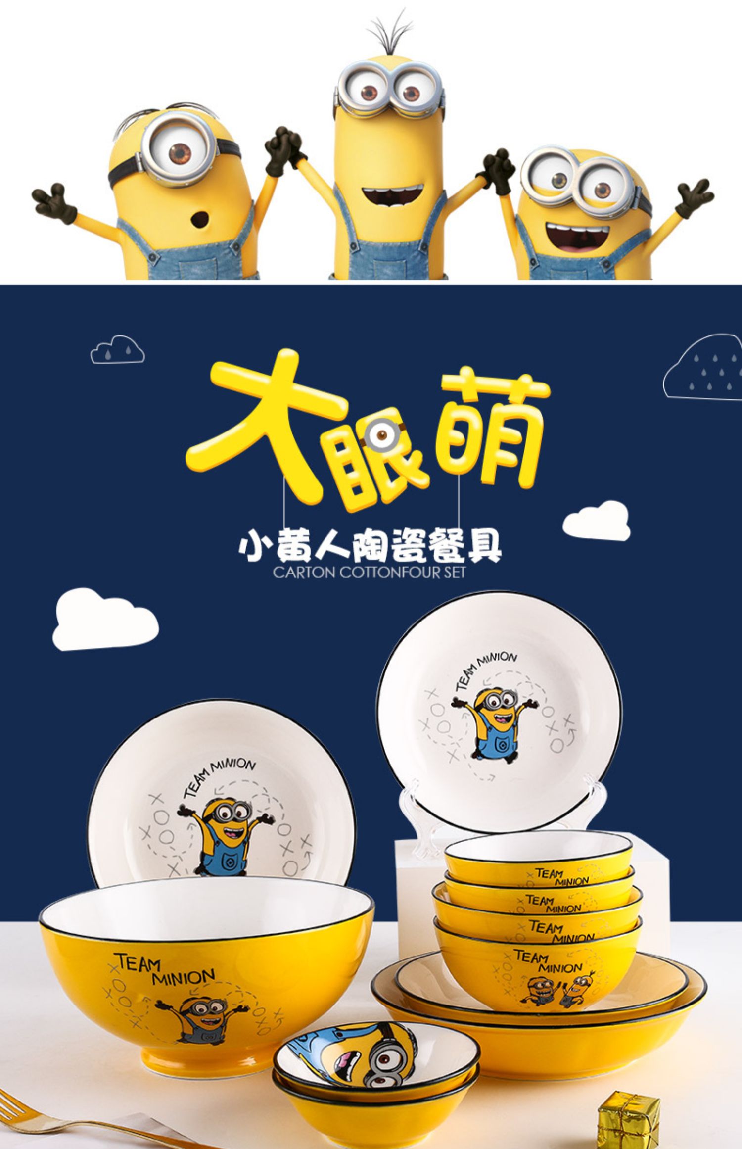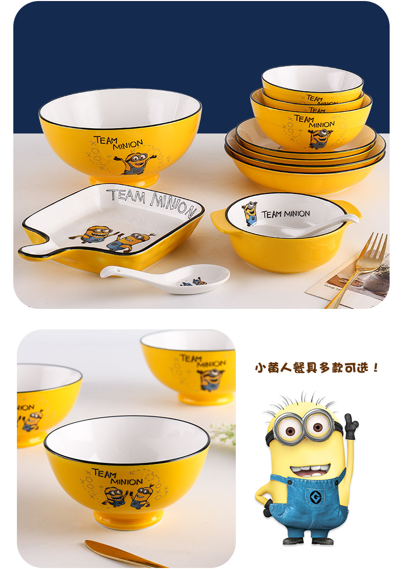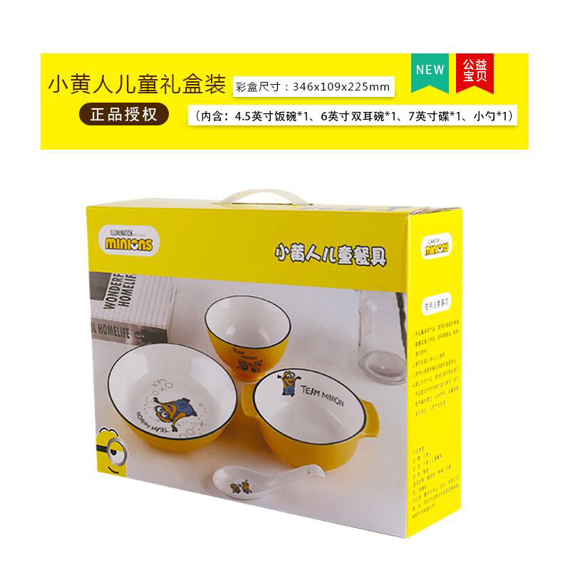 小黄人陶瓷儿童餐具,质地坚硬,无铅无镉,安全食品级材质,轻盈薄透,质如美玉,精致花纹。经过高温烧制,哟花而清晰不易掉落。隔热防烫,呵护你的双手哟!!