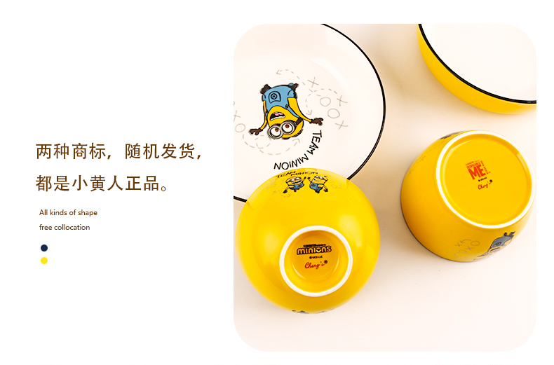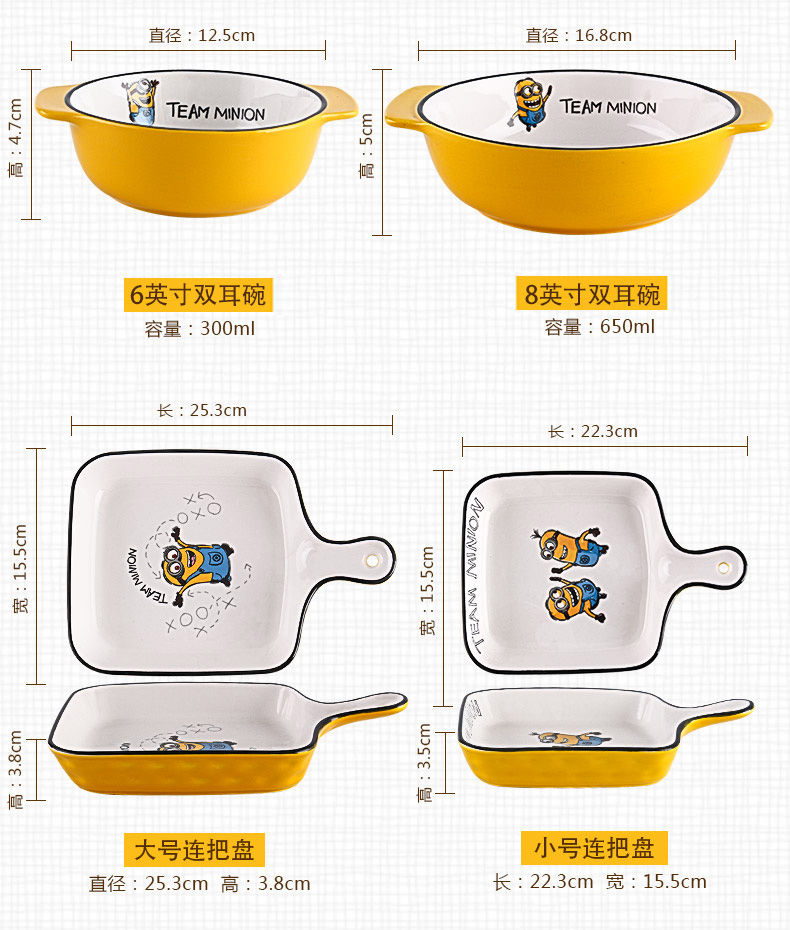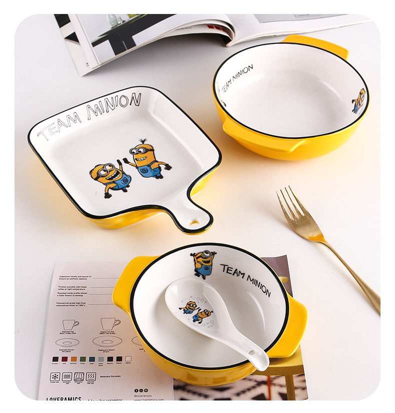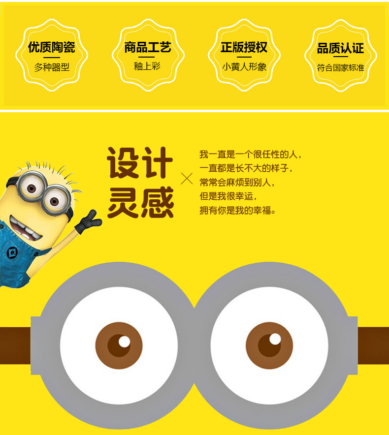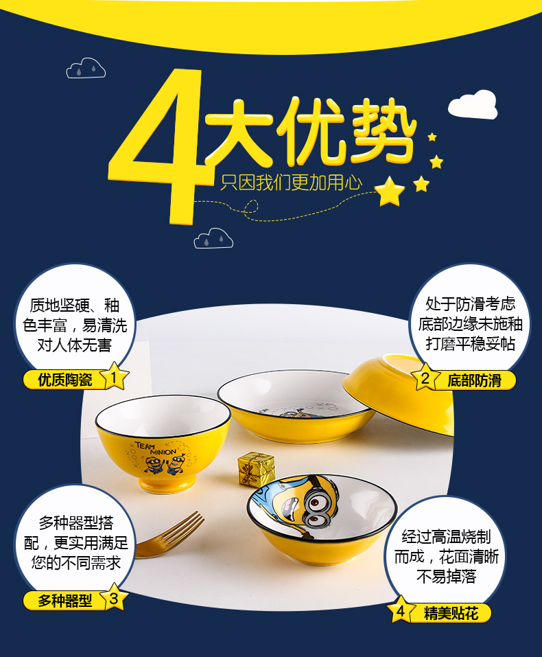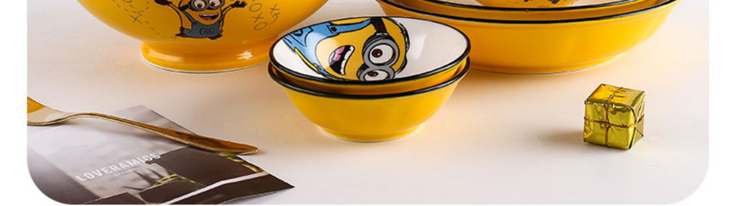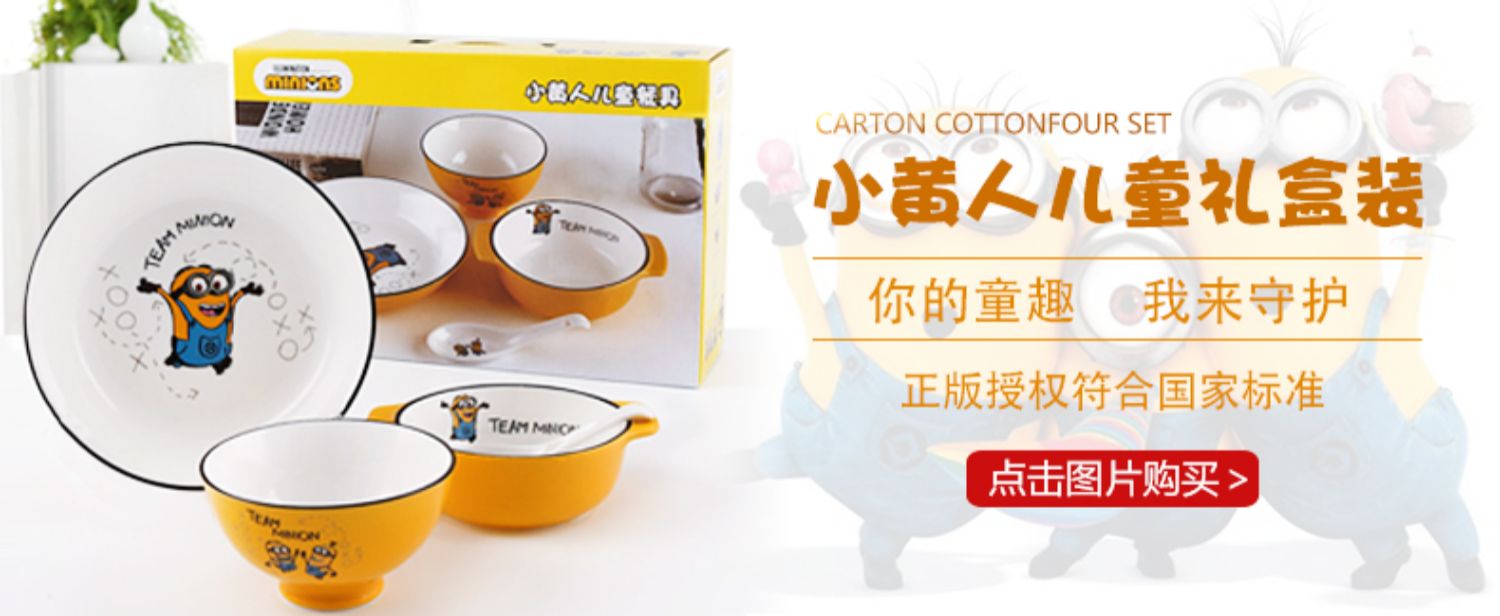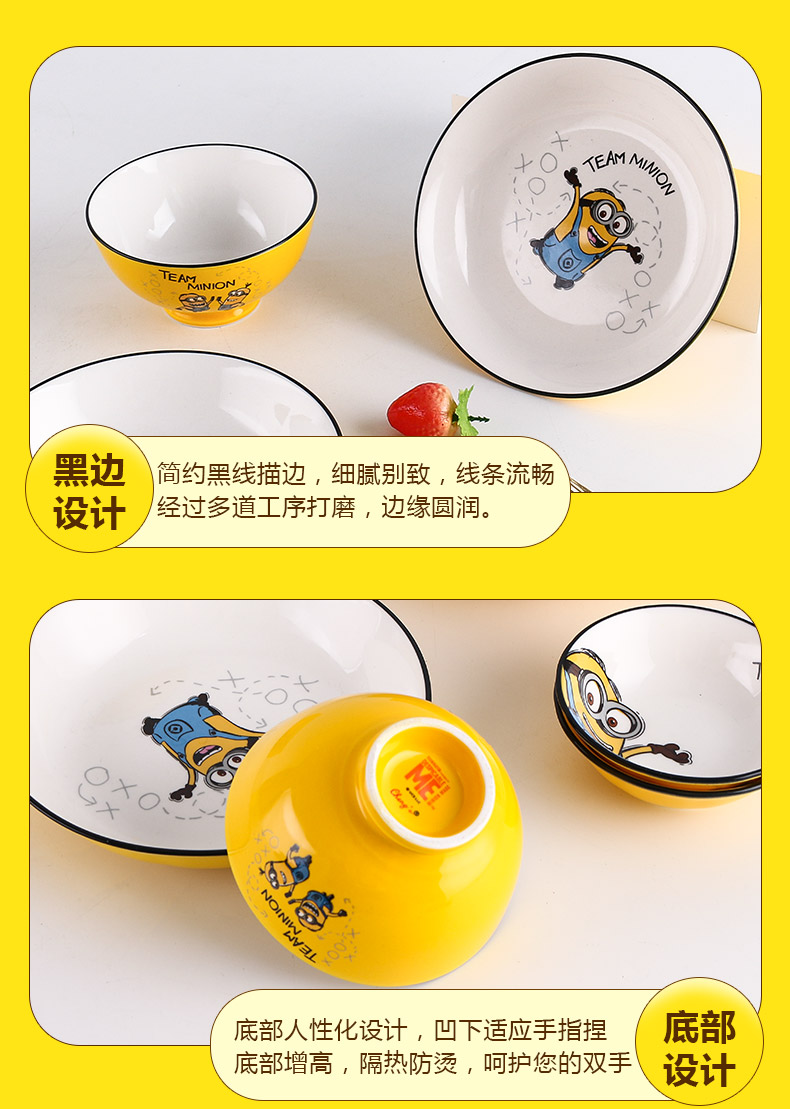 小黄人陶瓷儿童餐具,质地坚硬,无铅无镉,安全食品级材质,轻盈薄透,质如美玉,精致花纹。经过高温烧制,哟花而清晰不易掉落。隔热防烫,呵护你的双手哟!!