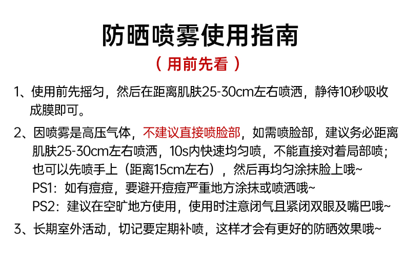 高倍防御,肌肤晒不黑物化合一,双重防晒~高姿改良泵头,小分子雾状,