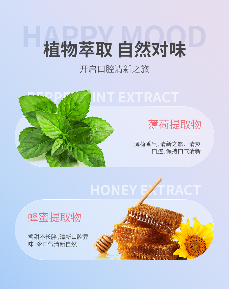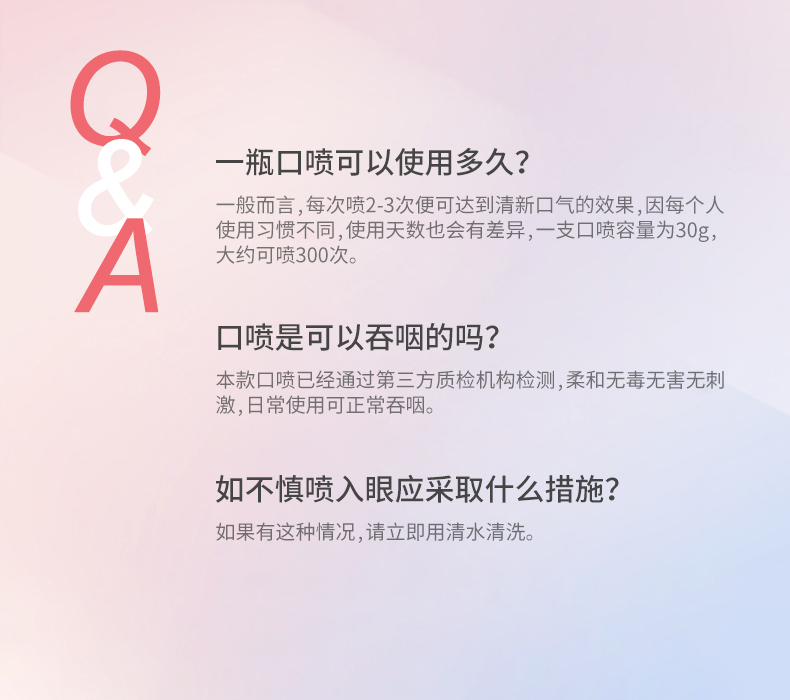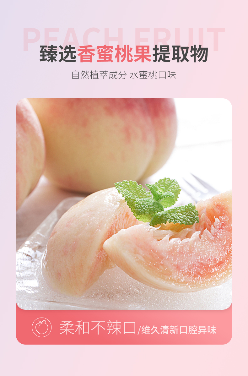 0酒精不刺激,蜜桃和蓝莓2种口味,采用植物萃取,添加薄荷提取物和蜂蜜提取物!添加维C和维E,还能补充维他命!纯净配方柔和不辣口,打造清新好口气!让你笑容充满自信,避免聚会,约会尴尬!