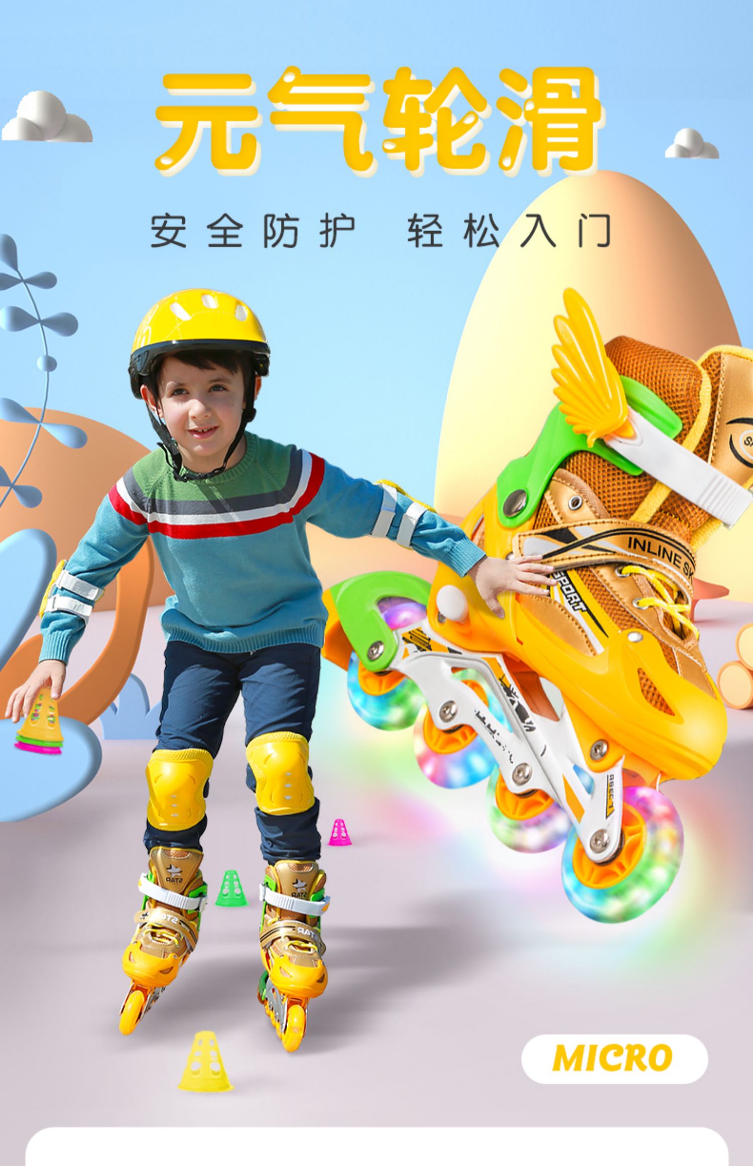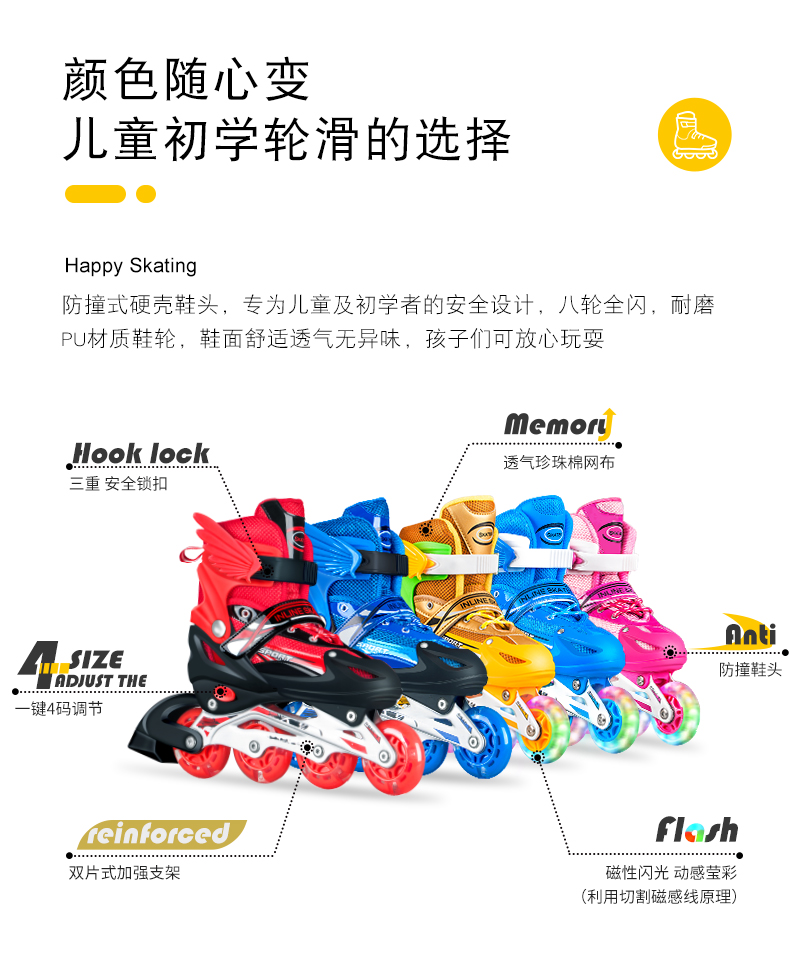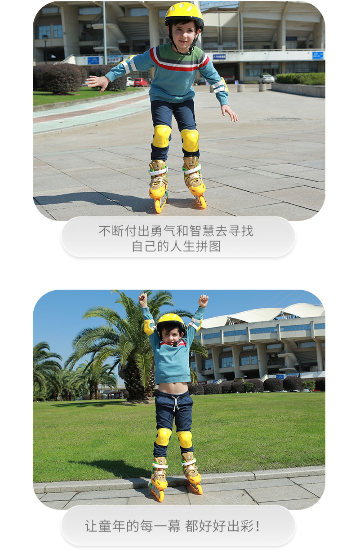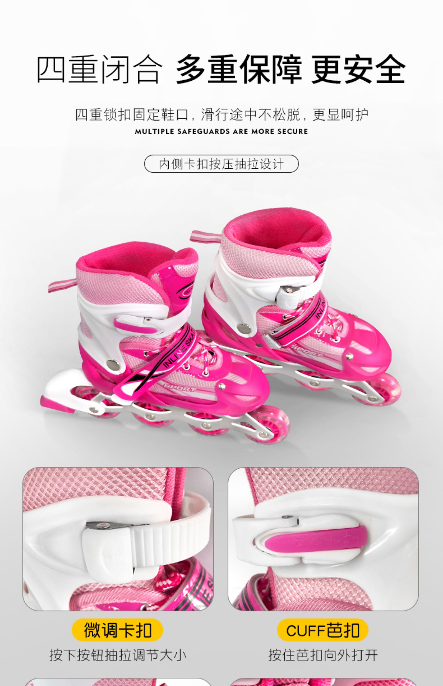 高颜值高品质轮滑。加厚稳固骨架,立体卡通鞋面,静音8轮全闪,四档调节,高弹抓地性强,灵活专业配置,耐磨减震,安全舒适,让孩子远离手机爱上运动纵享童年!