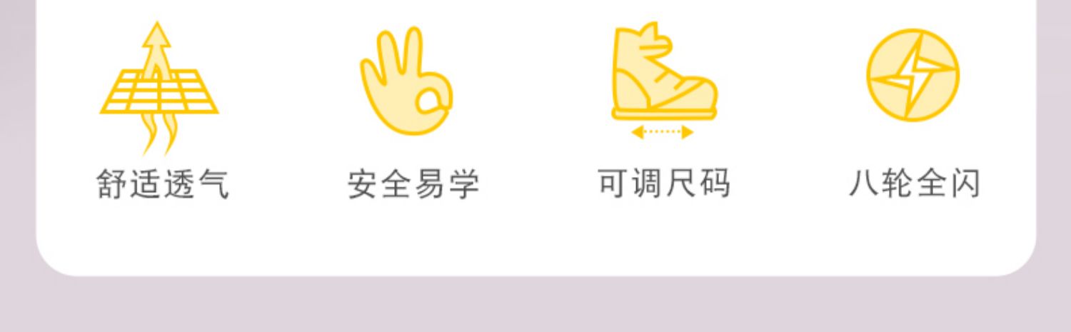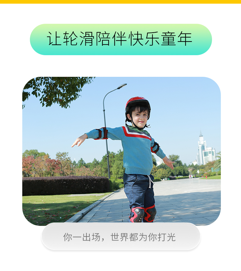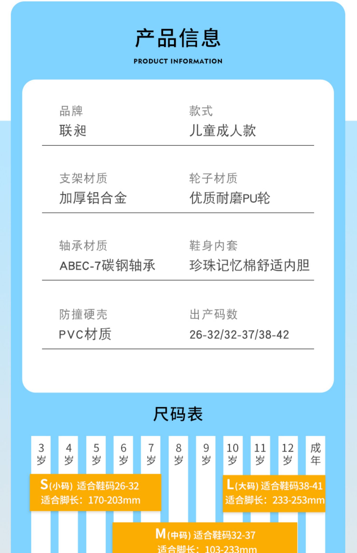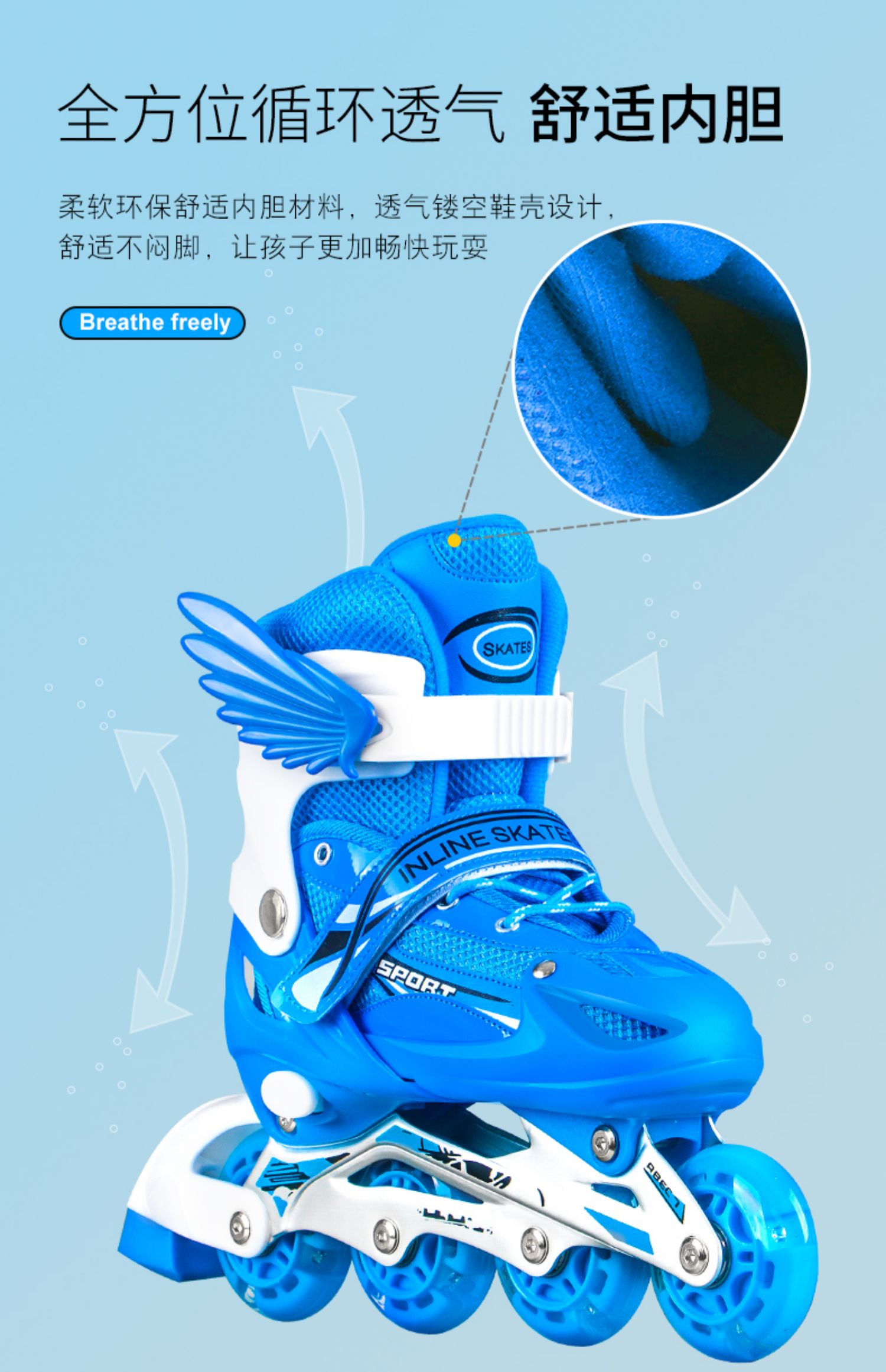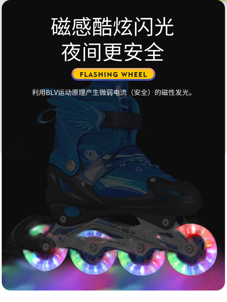 高颜值高品质轮滑。加厚稳固骨架,立体卡通鞋面,静音8轮全闪,四档调节,高弹抓地性强,灵活专业配置,耐磨减震,安全舒适,让孩子远离手机爱上运动纵享童年!