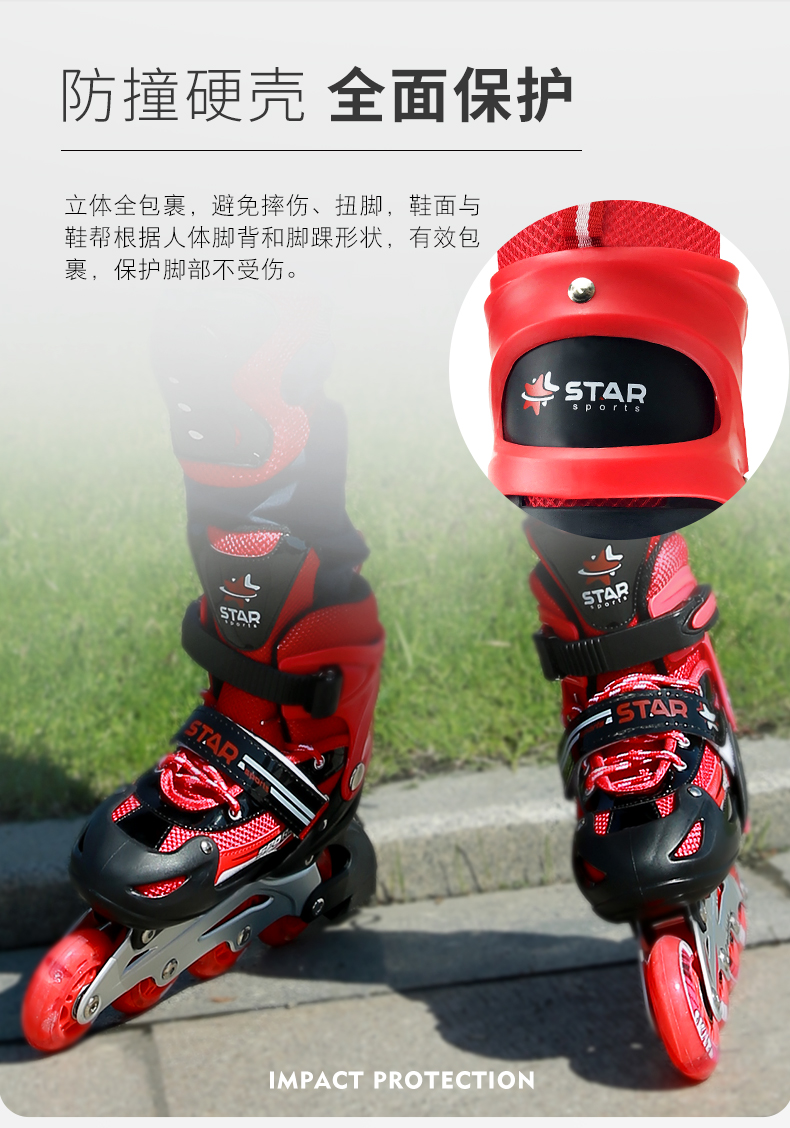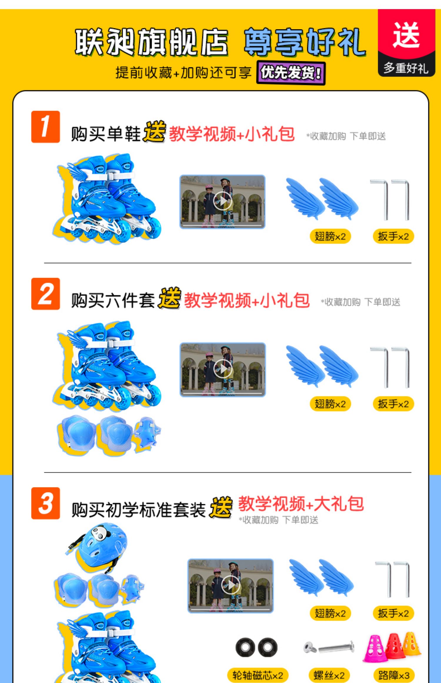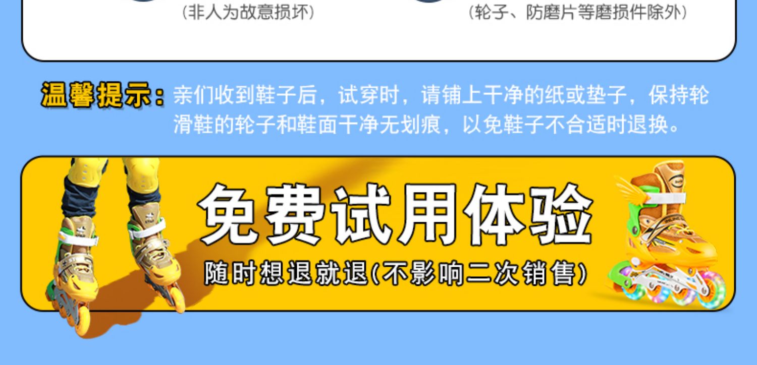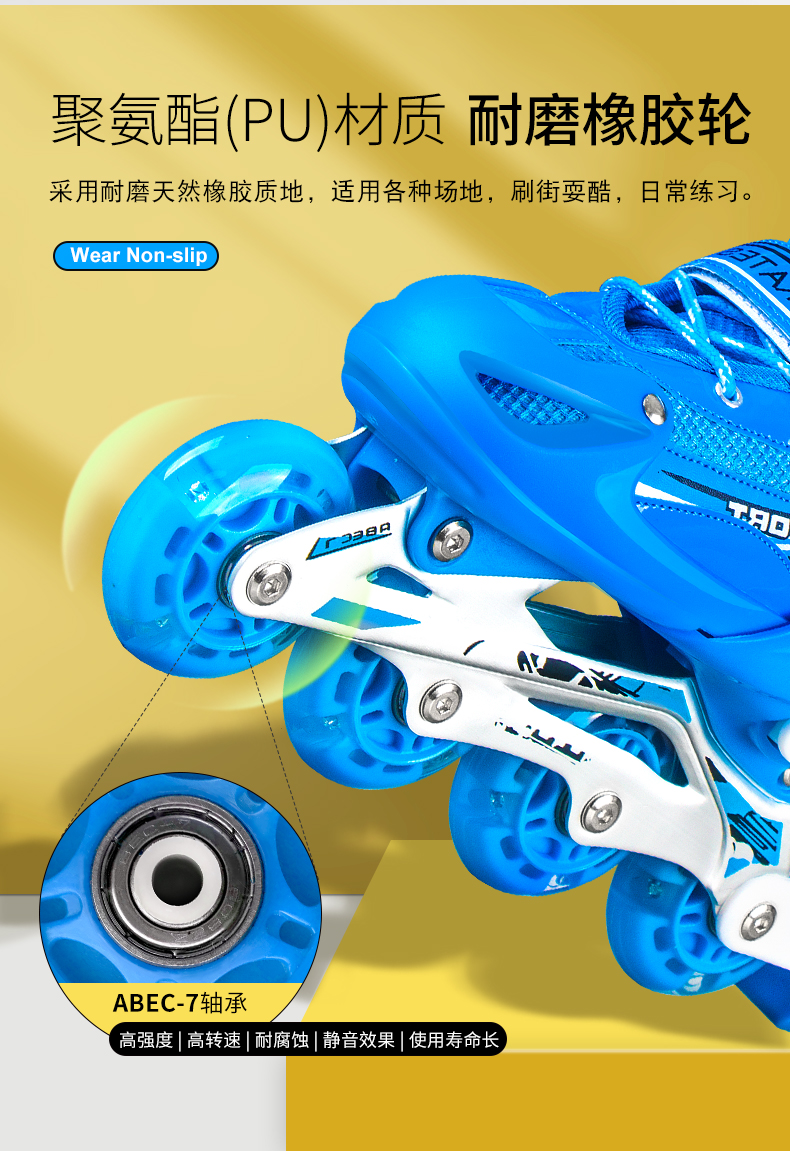 高颜值高品质轮滑。加厚稳固骨架,立体卡通鞋面,静音8轮全闪,四档调节,高弹抓地性强,灵活专业配置,耐磨减震,安全舒适,让孩子远离手机爱上运动纵享童年!