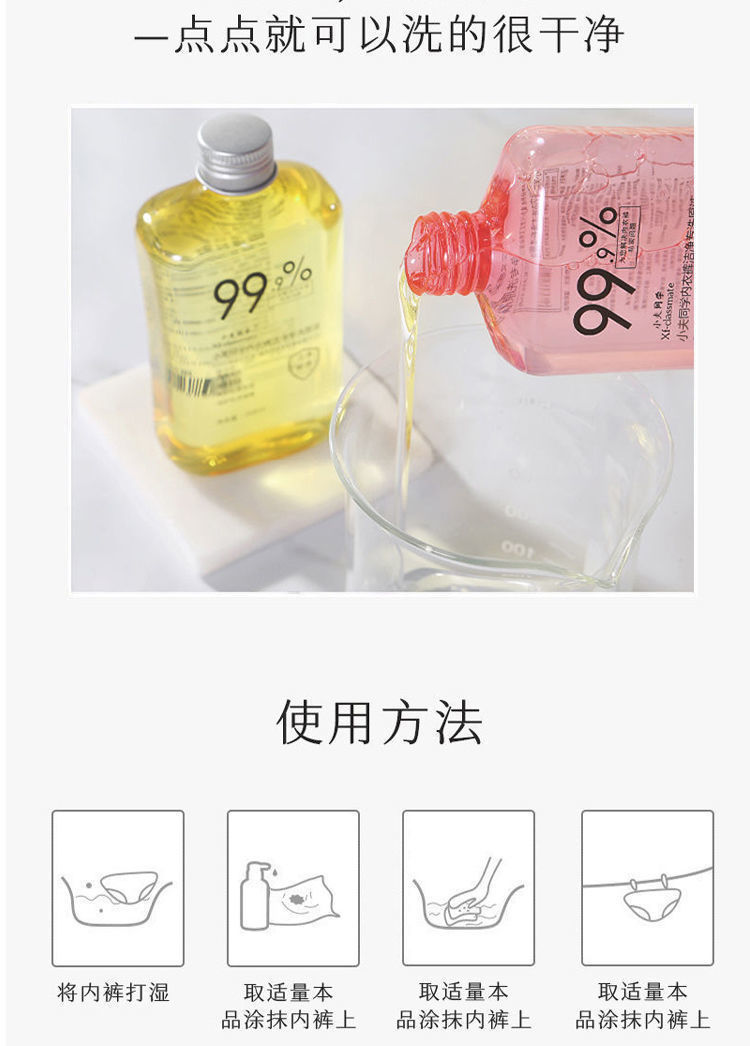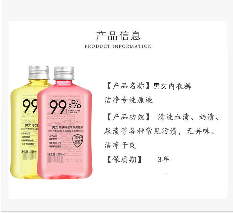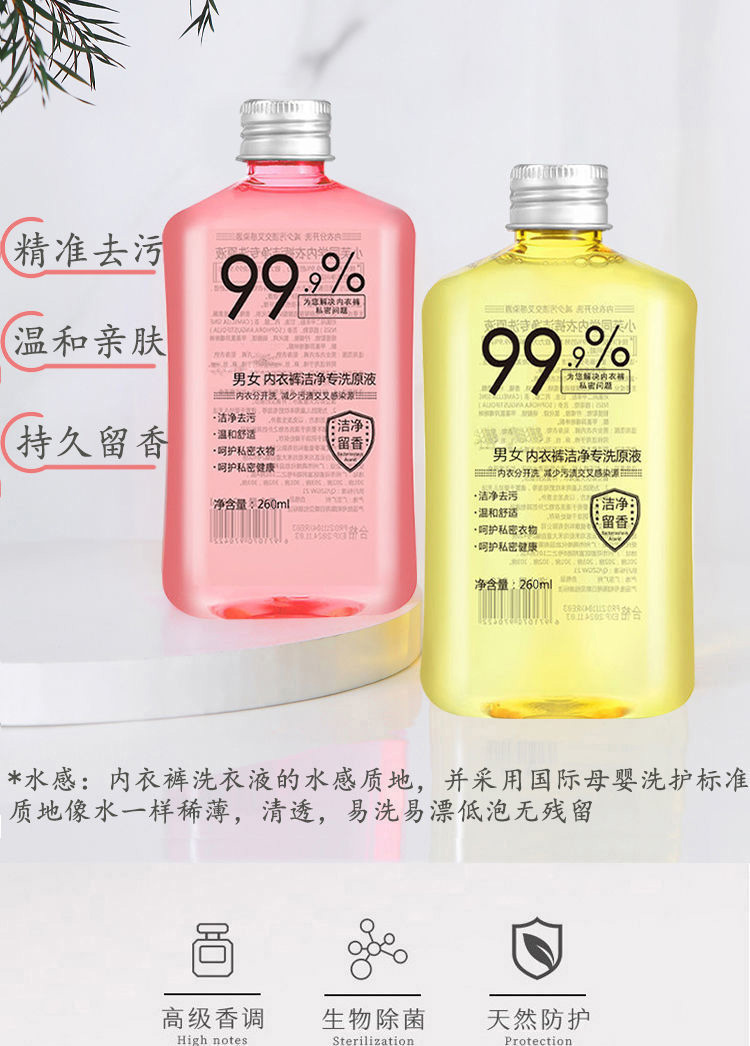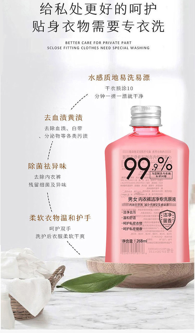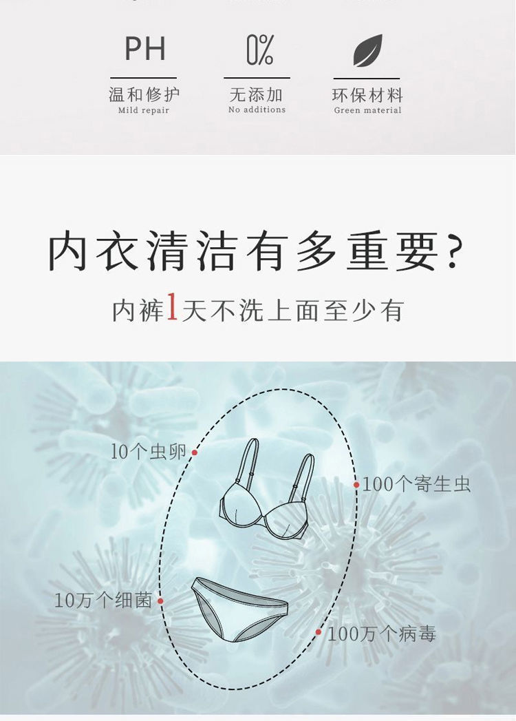 抑菌洁净,专注私处健康!抑杀看不到的脏。萃取植物精华,专洗内裤,抑菌除螨去污去血渍,深层清洁,保持内裤无痕本色无异味!全家可用,呵护一家健康!