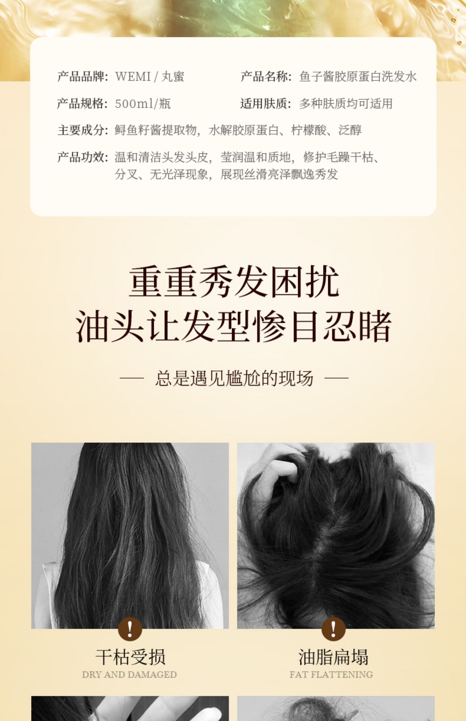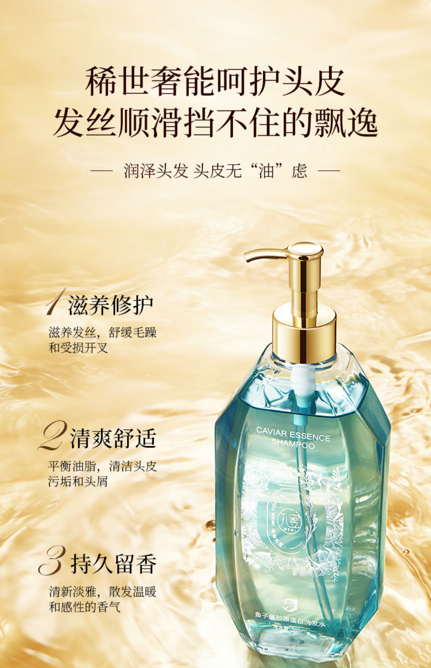 500ml大容量家庭装,拍两件!让秀发做一次轻奢享受,丸蜜鱼子酱洗发水!萃取深海鲟鱼子精华,有效控油去屑,修护毛躁,滋润发质,泡沫丰富易冲洗,持久留香,让秀发亮泽柔顺!