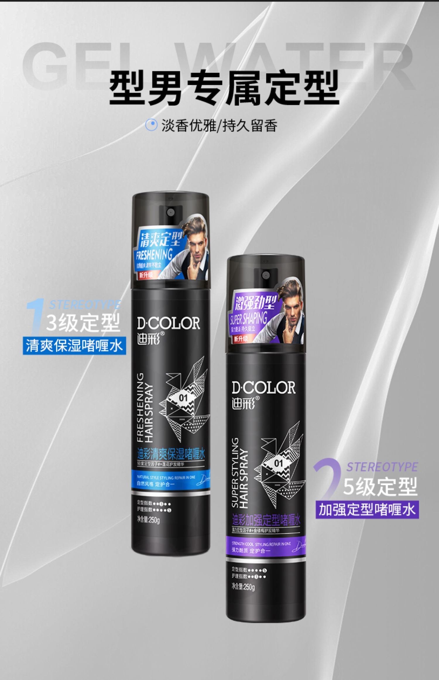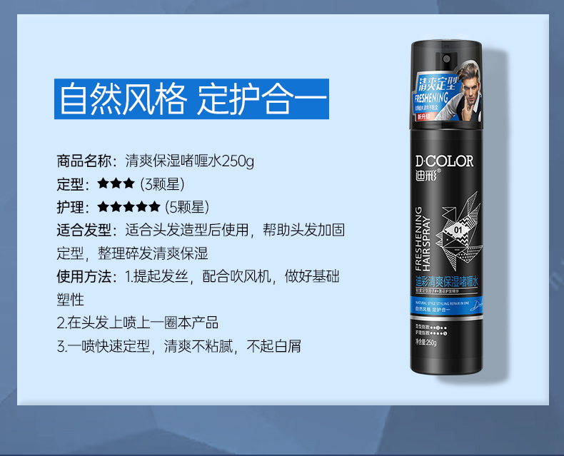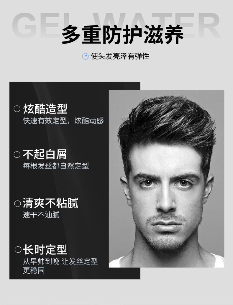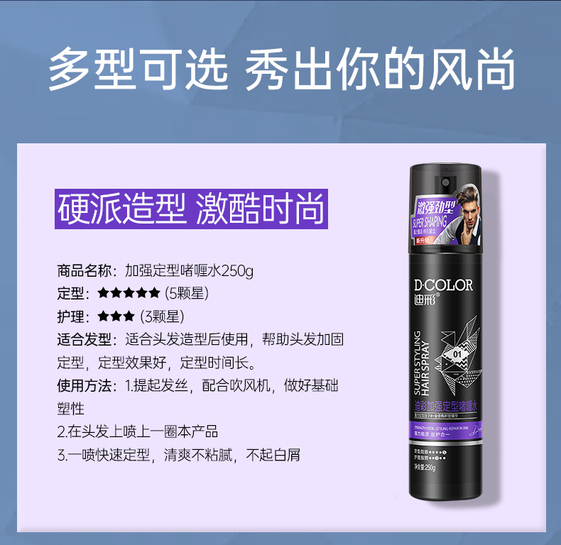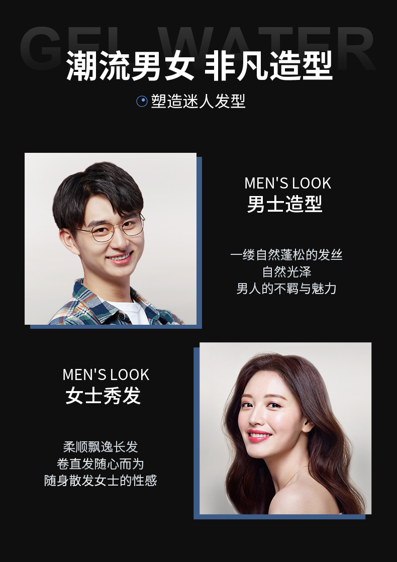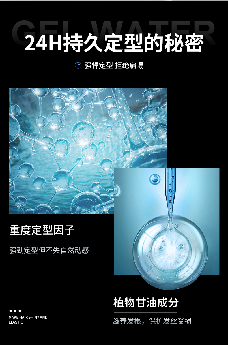 内养外护,持久定型,一瓶解决所有造型问题,水基配方易清洗,快速成膜,清爽速干不黏腻,24小时持久定型,3D塑性,淡香优雅持久留香。