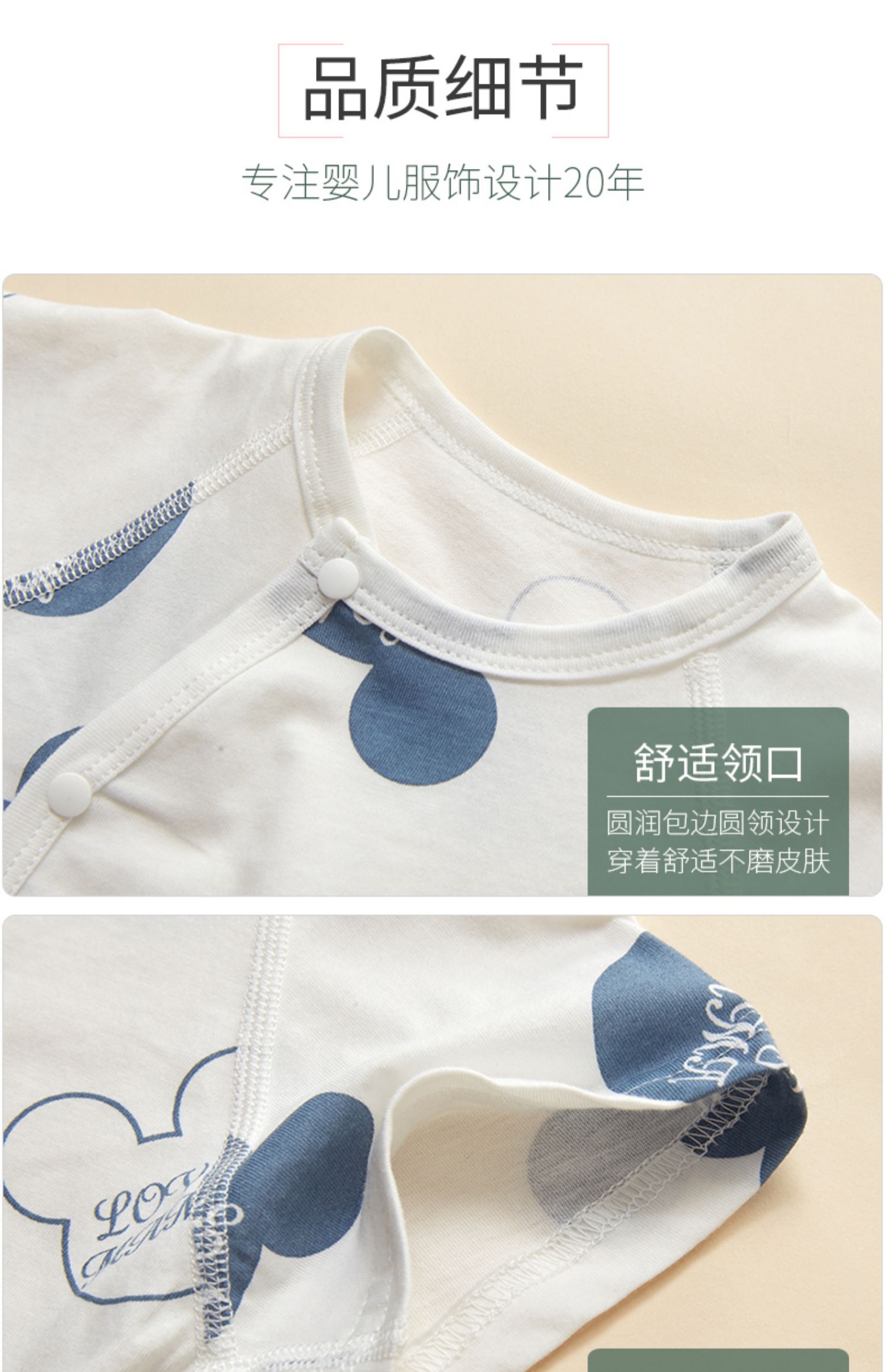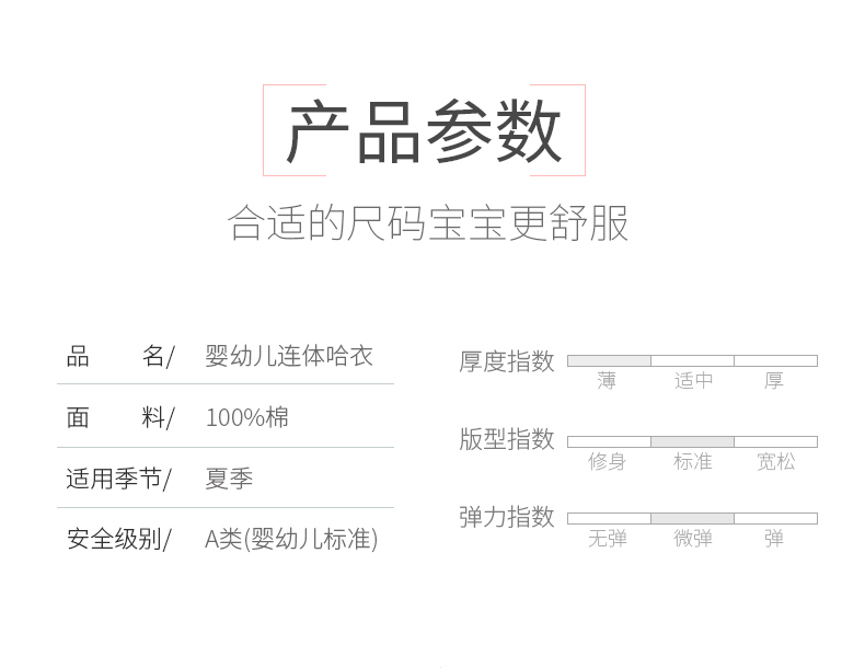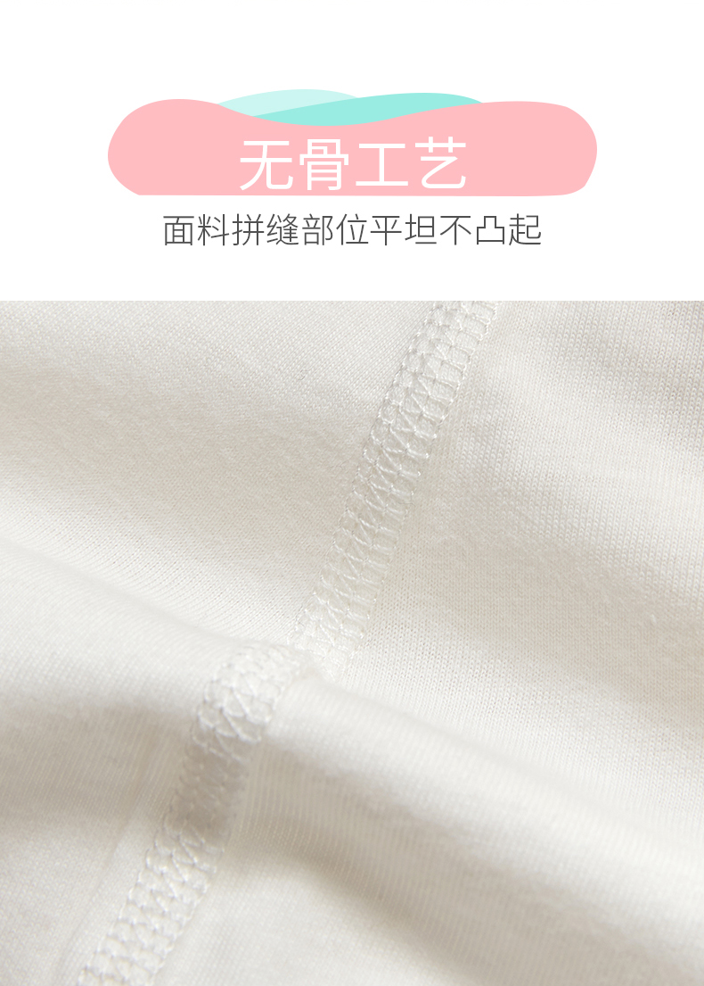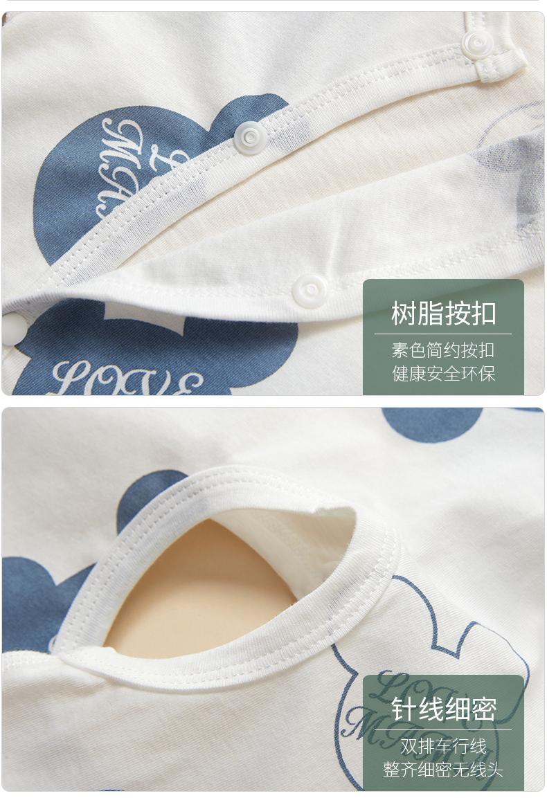 婴幼儿A类标准,采用优质纯棉,无荧光剂,不掉色,柔软舒适,亲肤透气。穿脱便捷,舒适贴肤,裆部按钮设计,方便更换尿不湿。让宝宝穿的舒适安全,是我们永远的追求~
