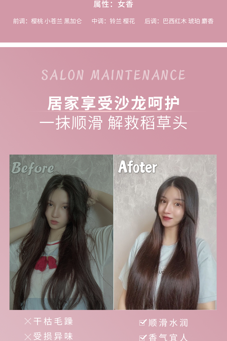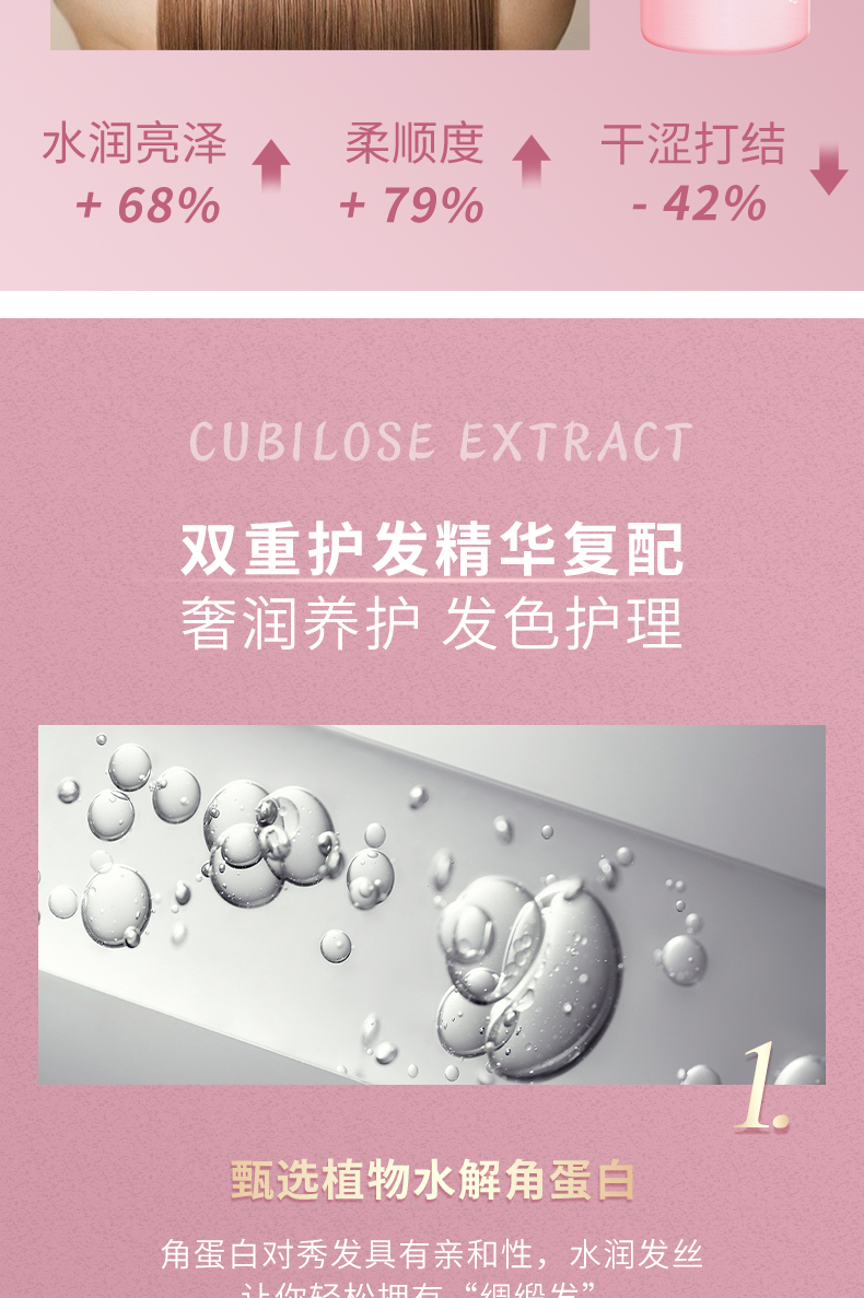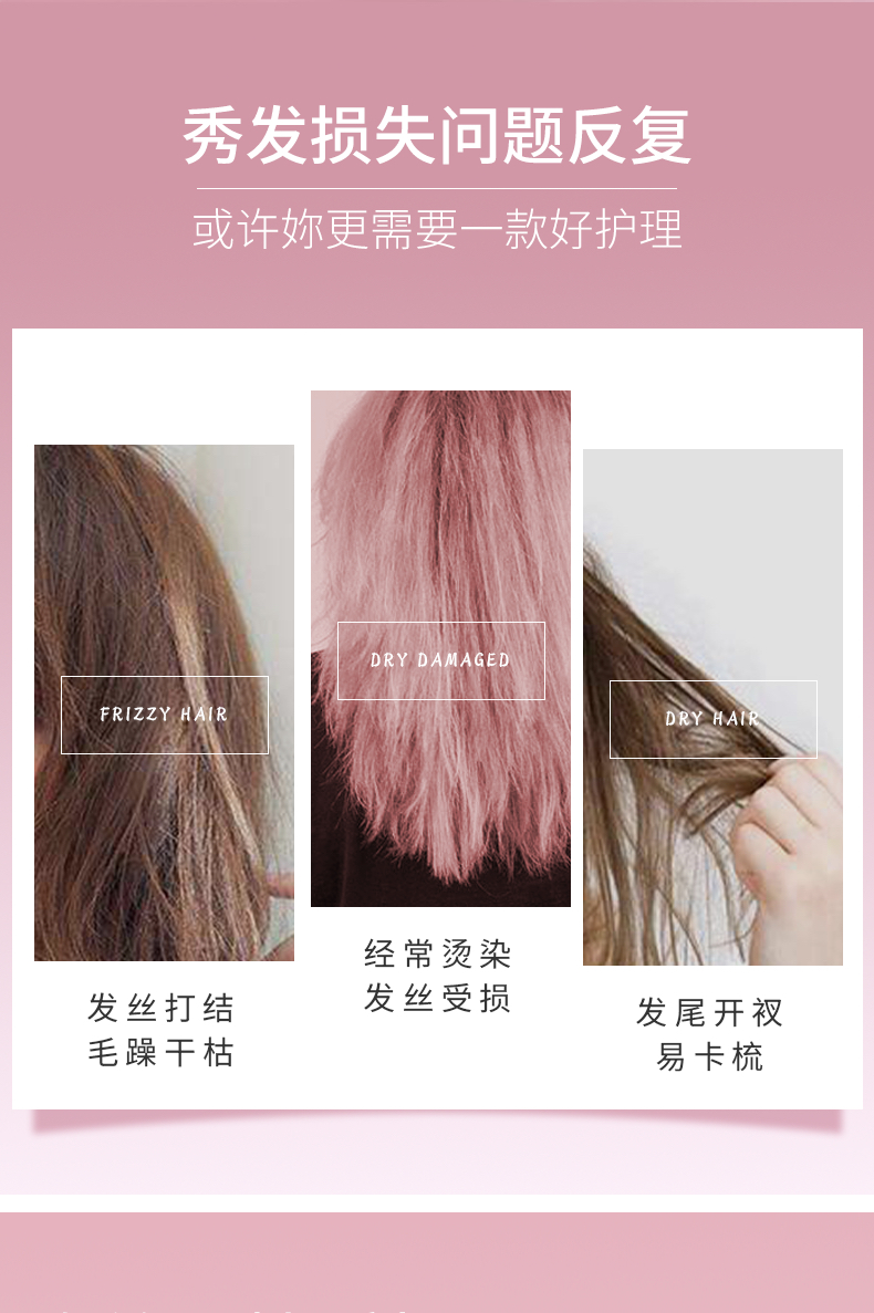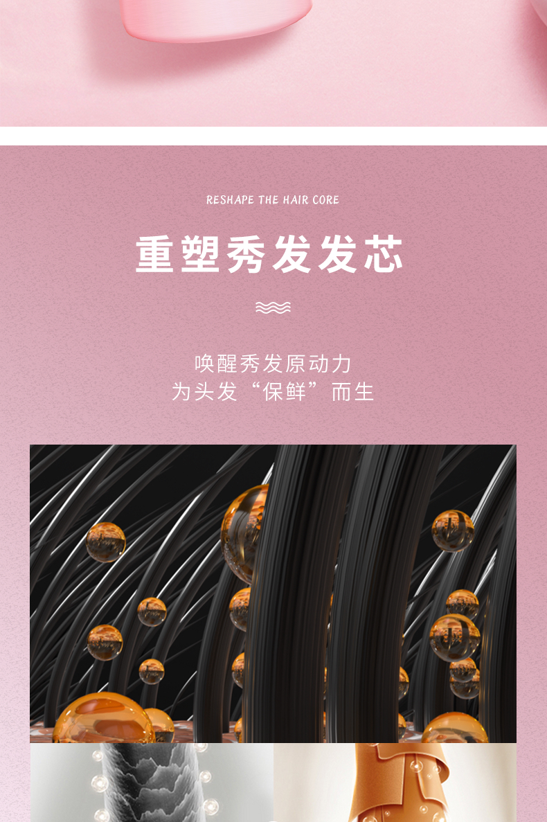 秀发营养补给站,深层修护,丝丝柔顺,一梳到底。内滋养,外修护,提升光泽,修护损伤,抚顺毛躁,丝滑触感!