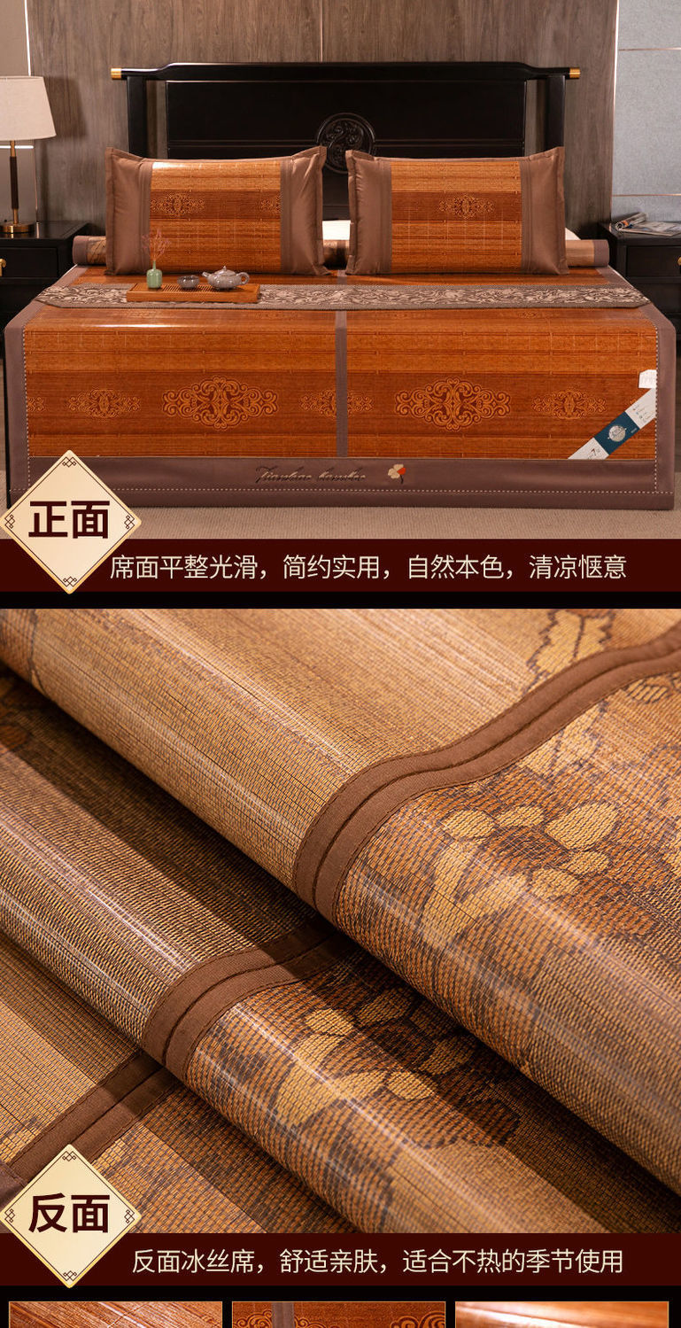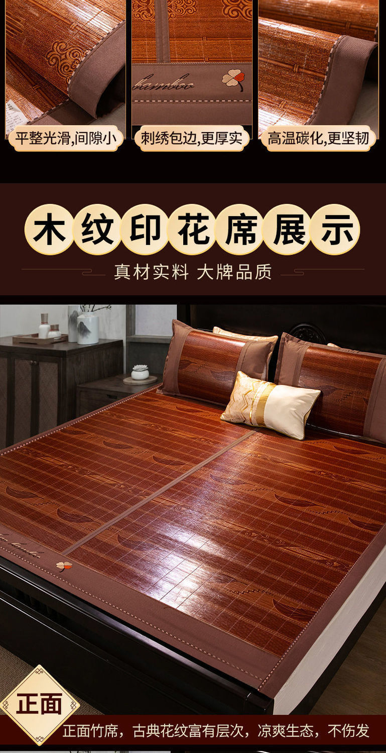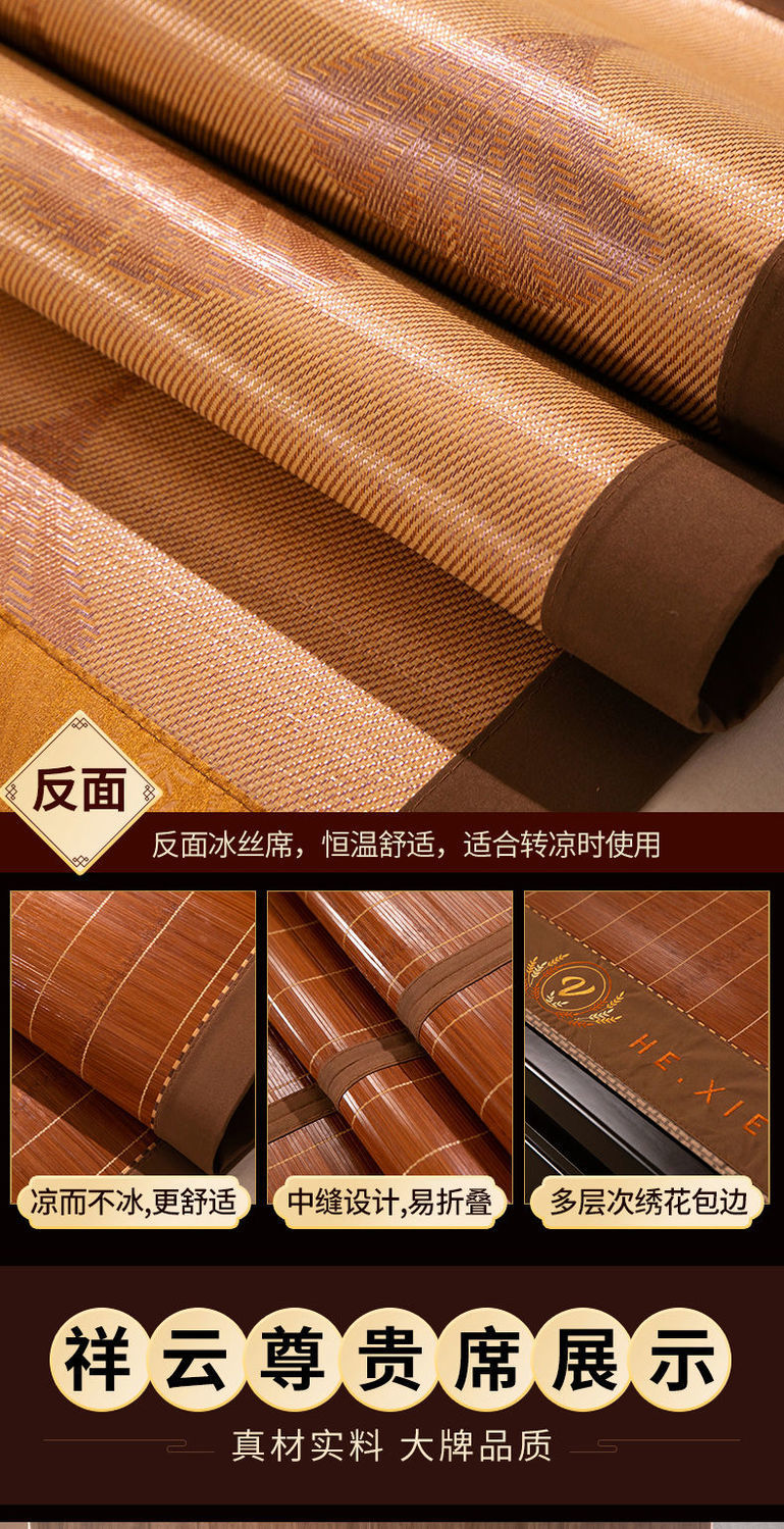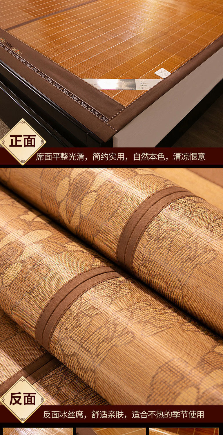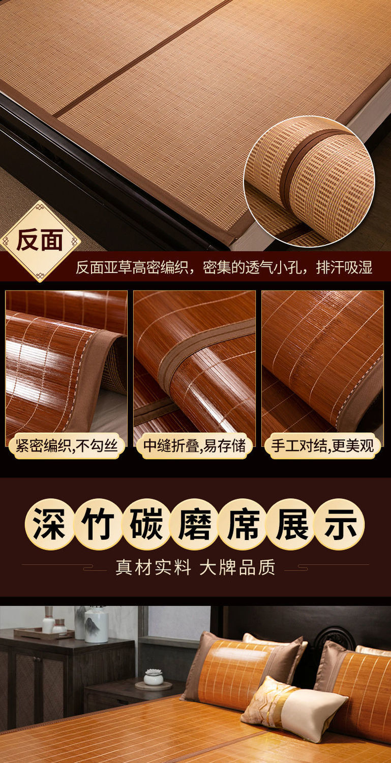 甄选高氧深山老竹为原材,原色碳化,席面光滑无毛刺,反面高密度丝席制作,环保原材不染色,吸湿透气,舒适亲肤,双面可睡,一席两用。精致包边耐磨耐用~(赠运费险)