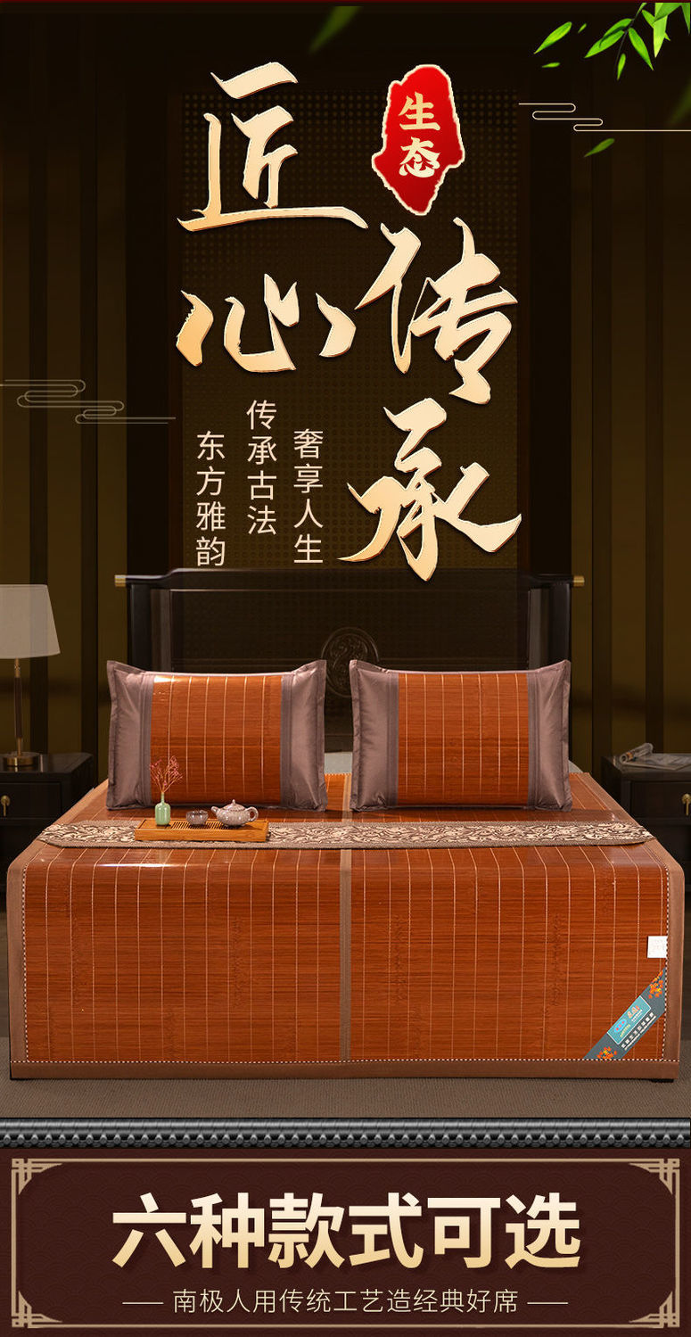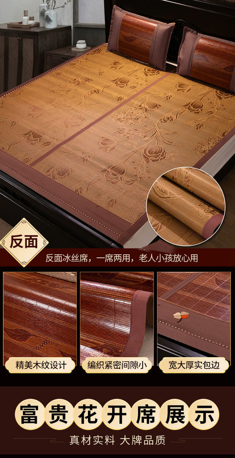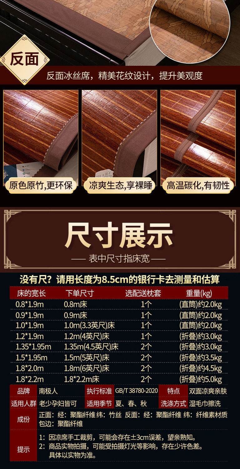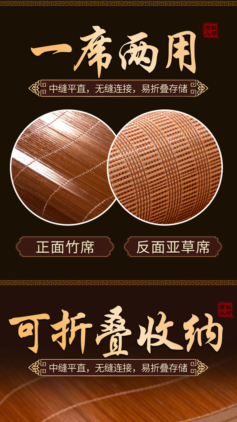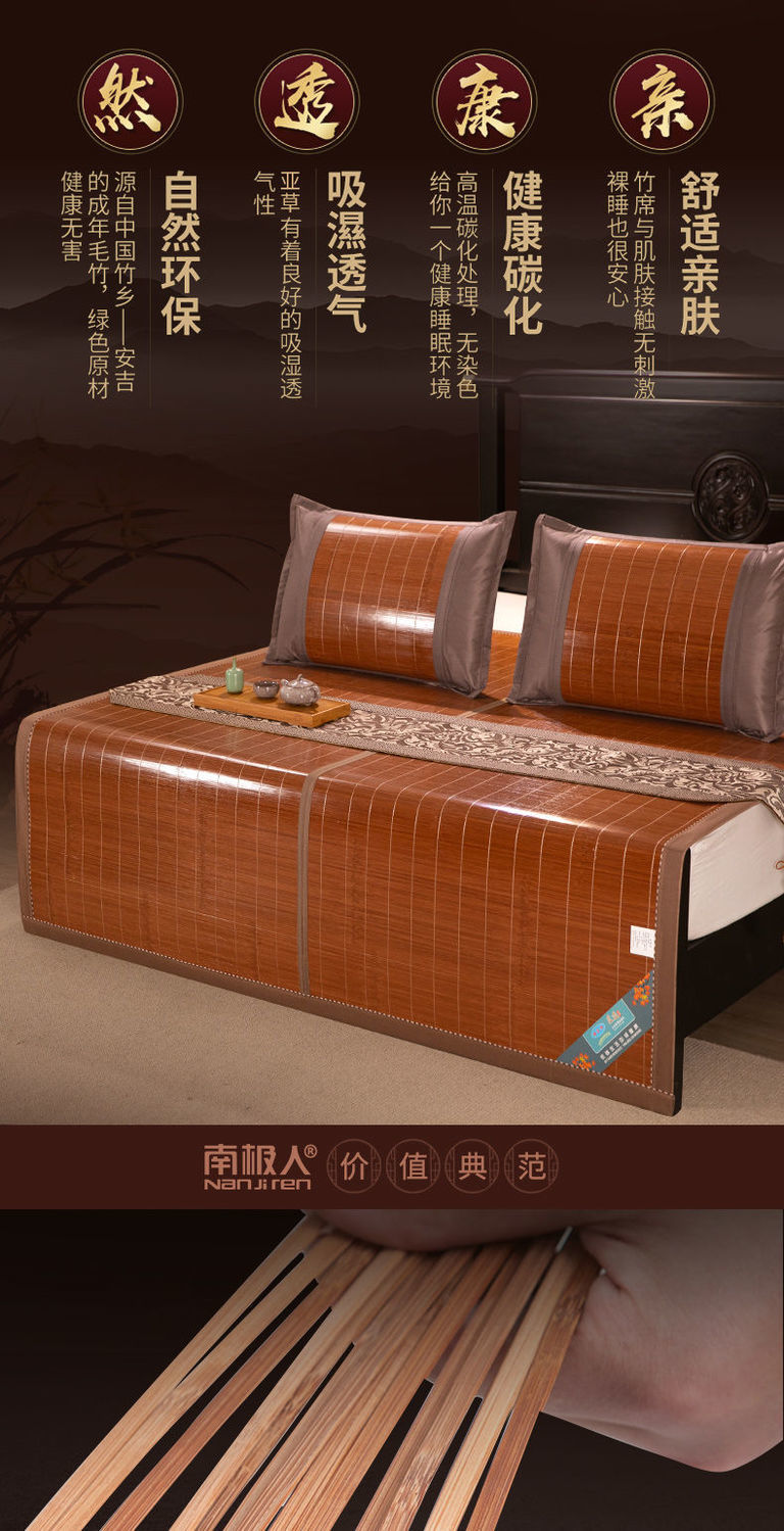 甄选高氧深山老竹为原材,原色碳化,席面光滑无毛刺,反面高密度丝席制作,环保原材不染色,吸湿透气,舒适亲肤,双面可睡,一席两用。精致包边耐磨耐用~(赠运费险)