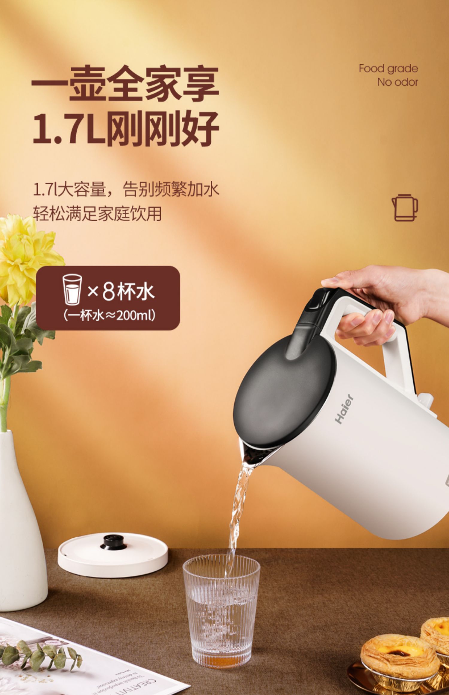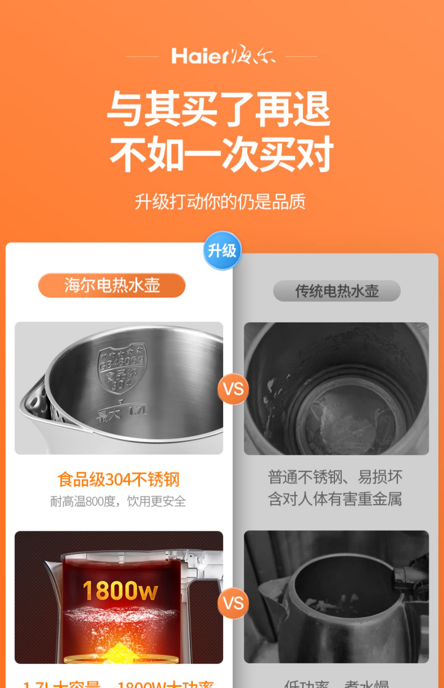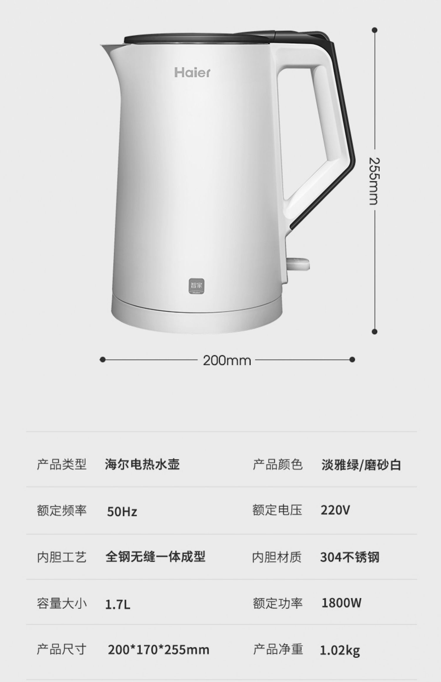 【收到货嗮图,F3元红包,拍1.5默认发1.7L!】海尔大牌!保温一体不锈钢!小清新极简风格,颜值在线,双层壶身,防烫又保温,呵护你的双手!无缝内胆大瓶口易清洁,304不锈钢,食品级材质!【赠运费险】