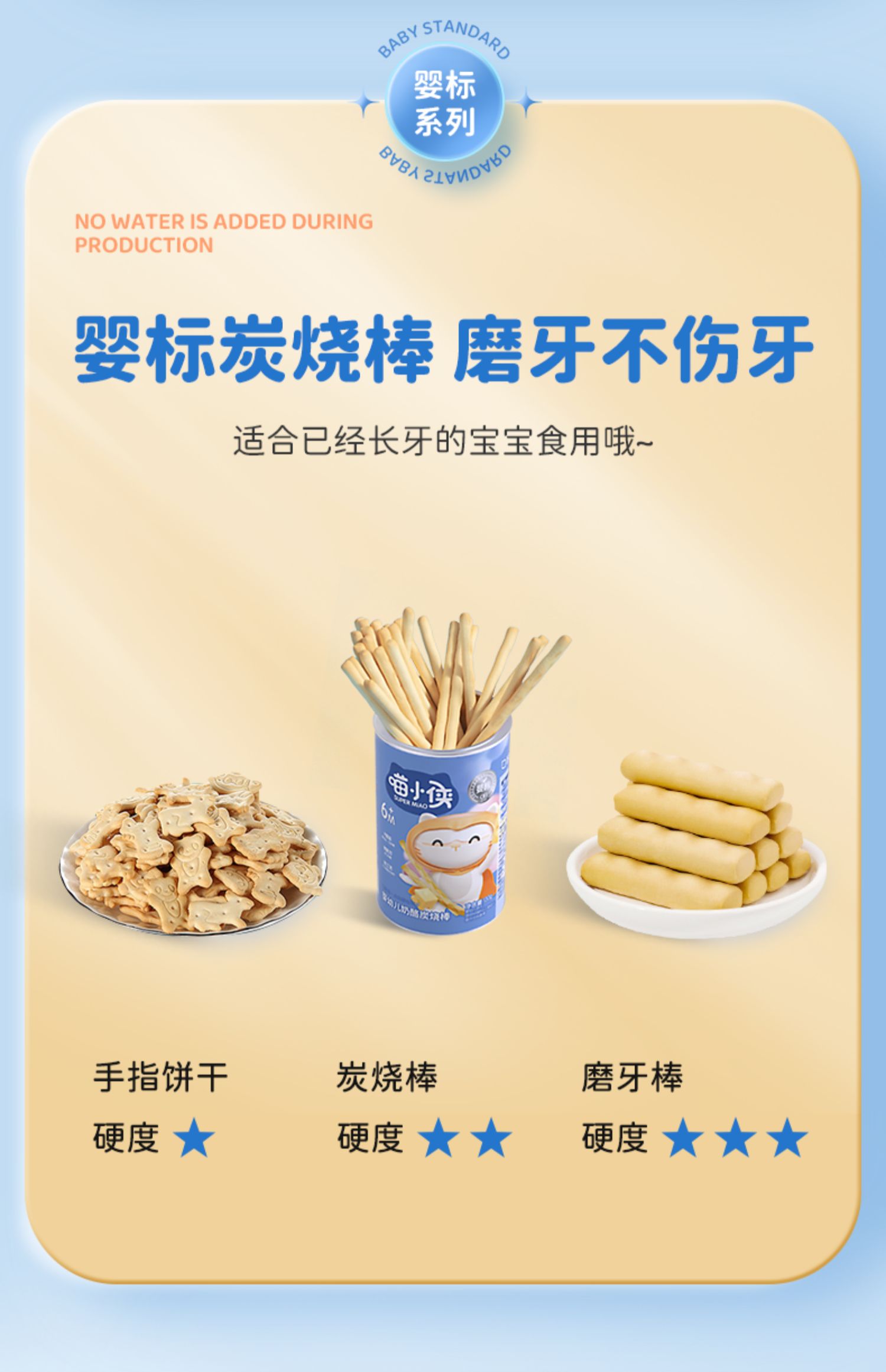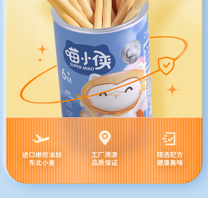 【拍两件】喵小侠婴幼儿奶酪炭烧棒,一次买了两罐炭烧棒,宝宝很爱吃这款饼干,一罐有70根左右份量很足。这款是婴标产品,没有添加剂和糖买的放心。