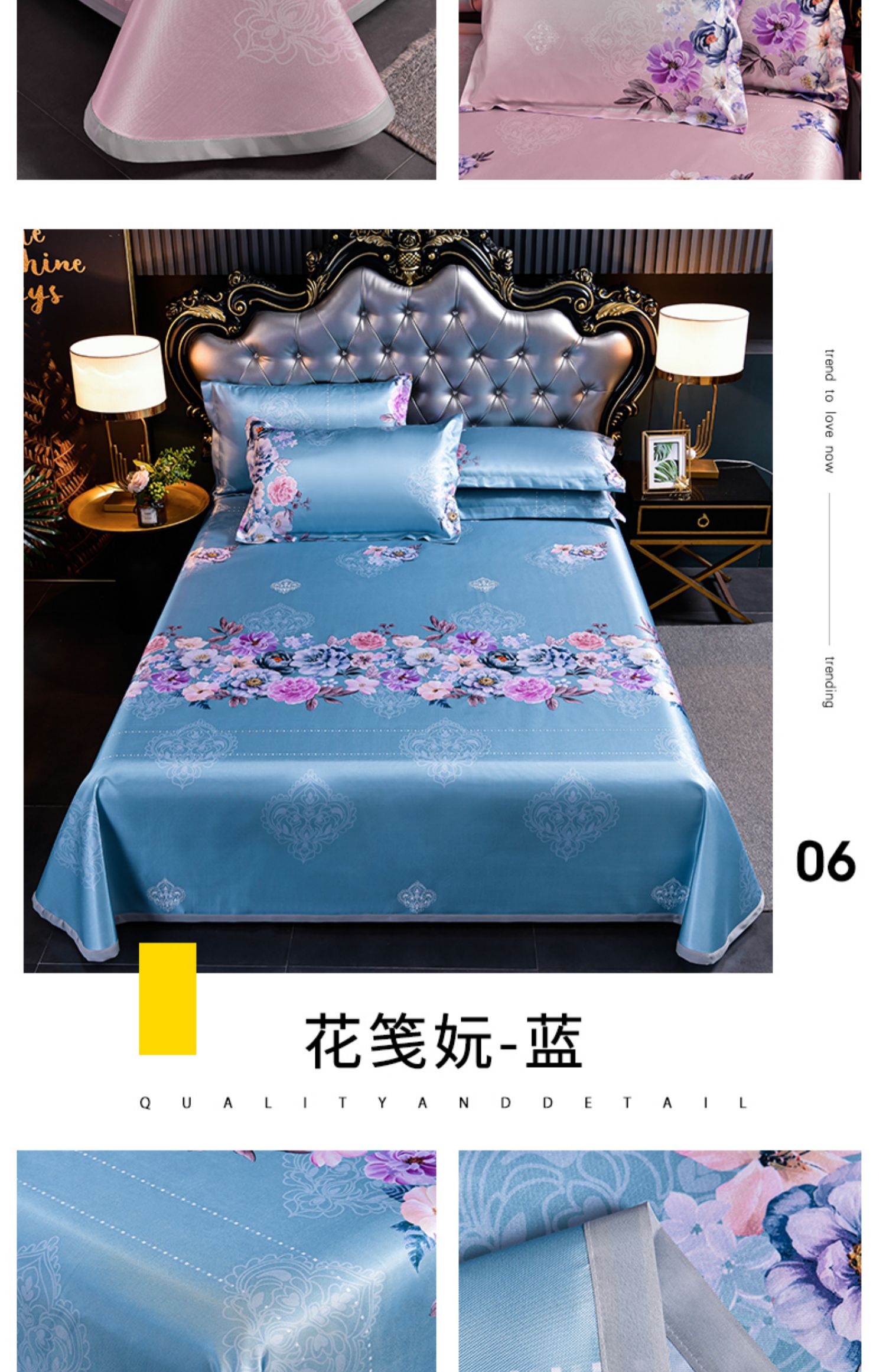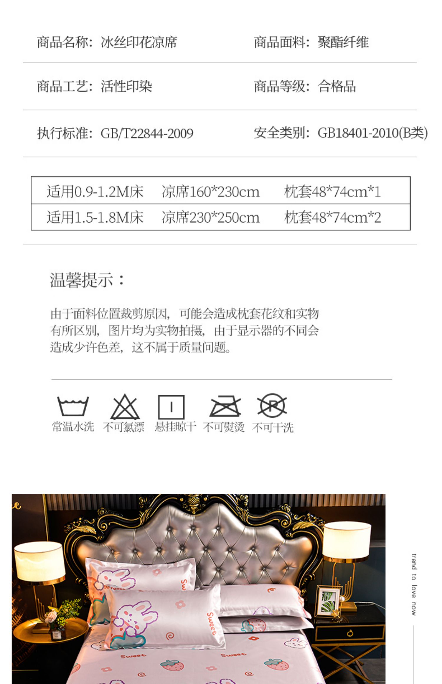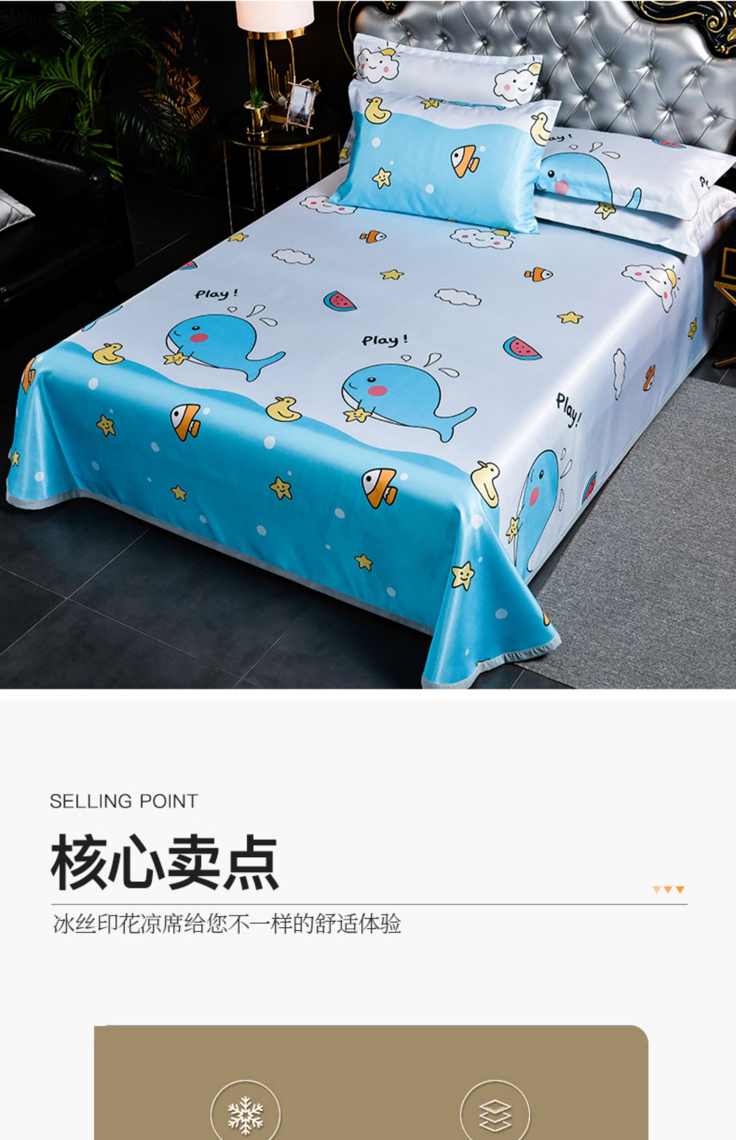 凉感冰丝印花凉席。享盛夏清凉时光,凉感冰丝面料制作,将冰丝的柔软与清凉带到卧室里,感受一丝的凉爽很惬意,轻柔触感带来好睡眠。【赠运费险】