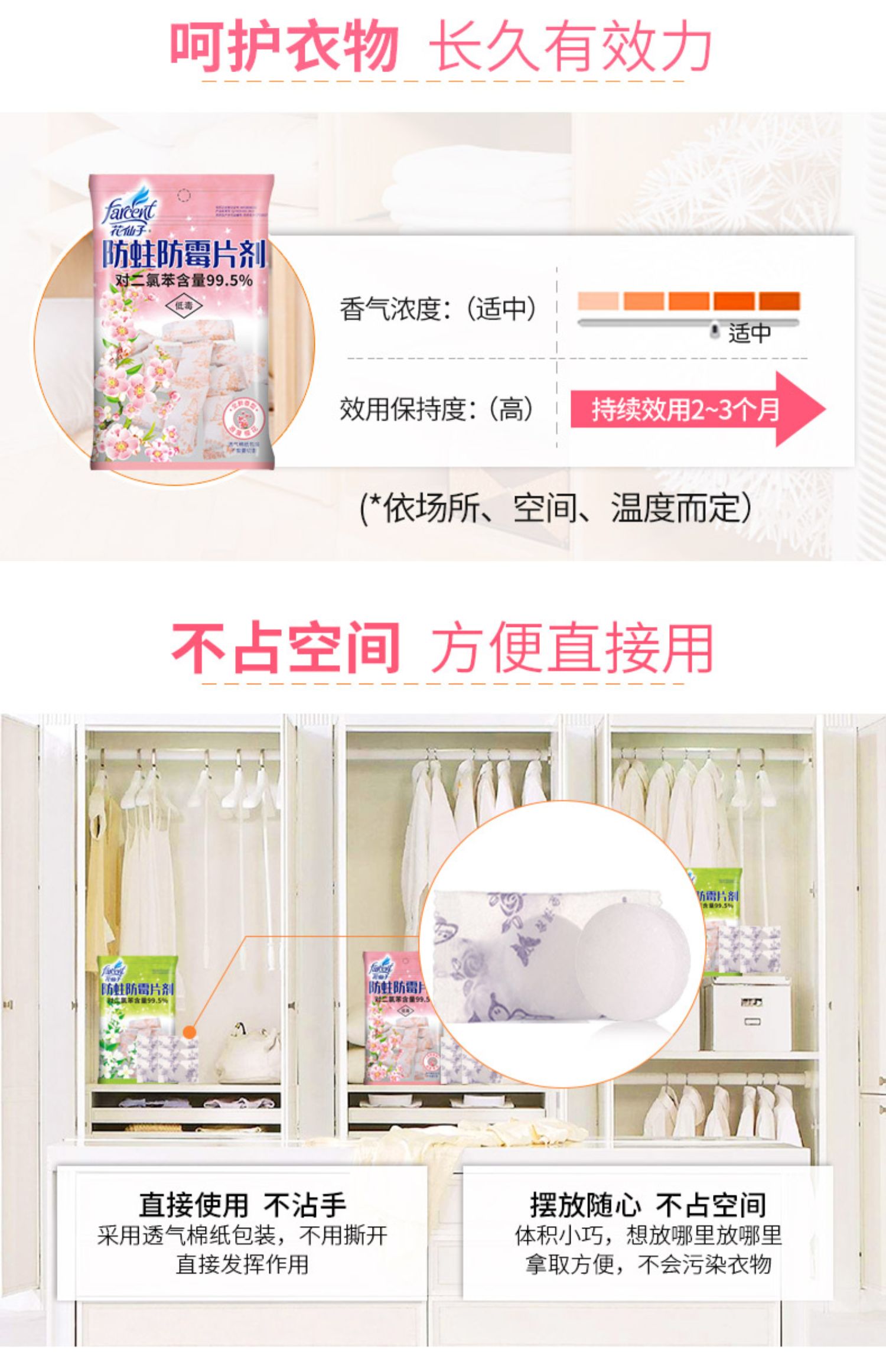 居家常备,花仙子品牌,薰衣草樱花防霉防蛀剂!缓释控制技术,长效防蛀,安心品质,天然芳香,让你“霉”烦恼,衣柜、抽屉、鞋柜等均可适用,阴雨季防霉防蛀必备!