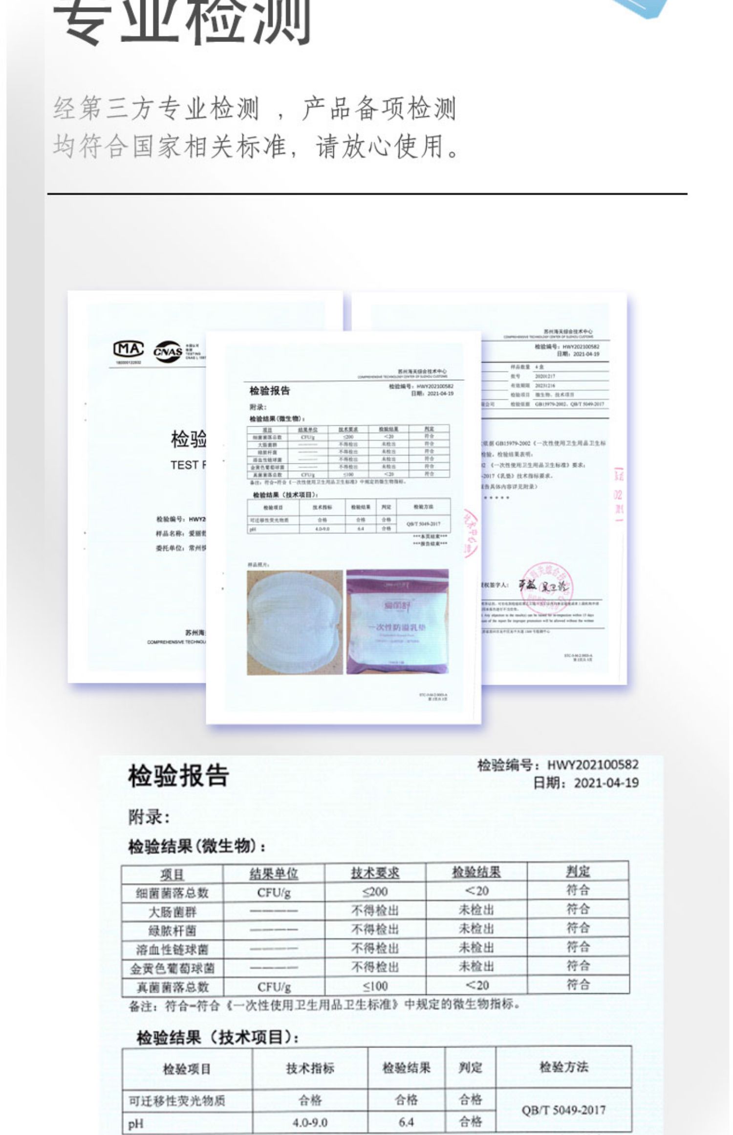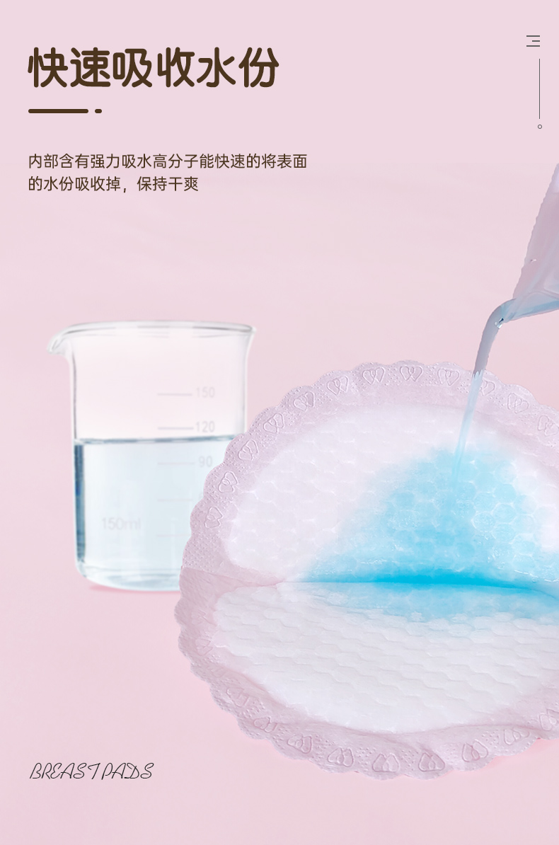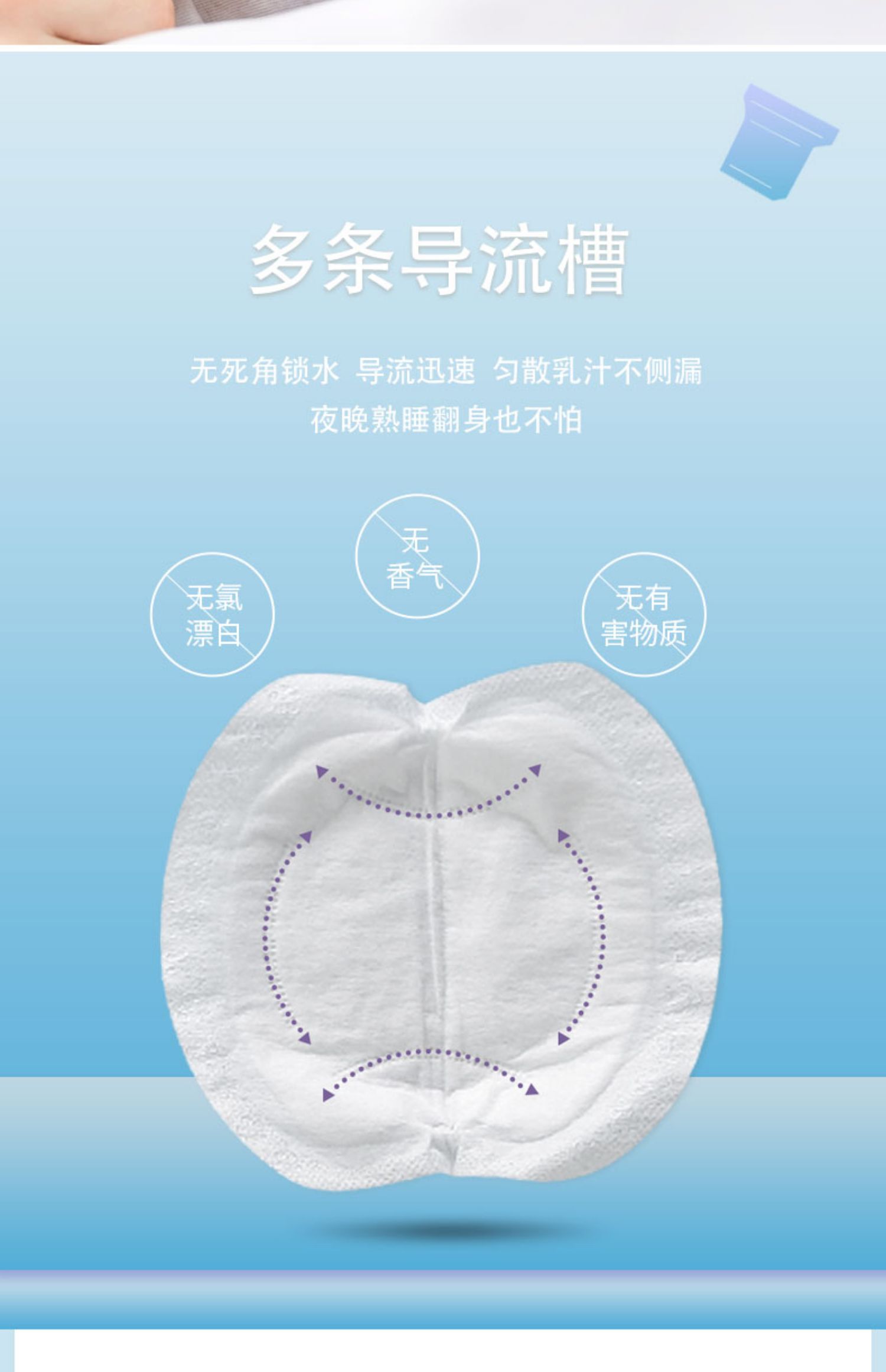 弹力收缩,柔软舒适,透气性好,强力锁水,独立包装,多条导流槽,无死角锁水导流迅速均散乳汁不侧漏,双层背胶,更好的贴合在内衣上,内部强力吸水高分子,快速吸收溢出的奶汁,无荧光剂,给您自然纯粹的贴心呵护~
