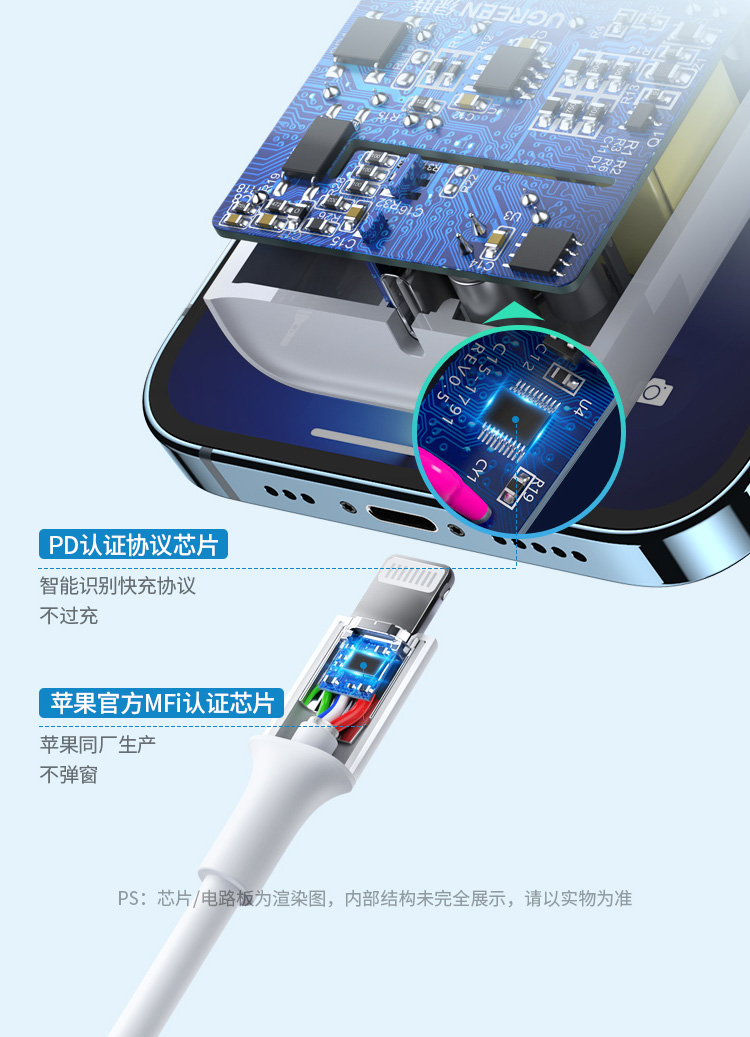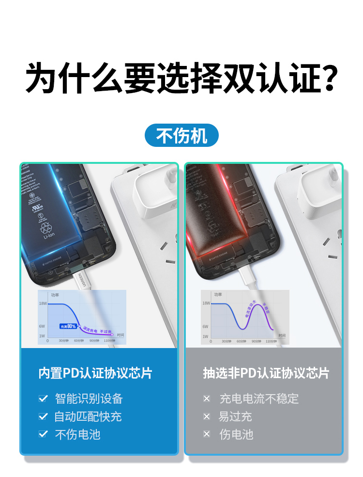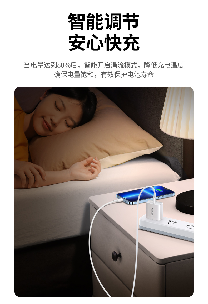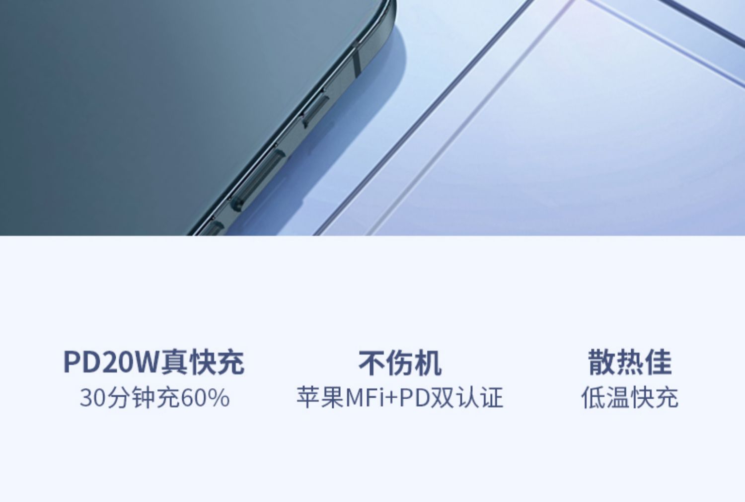 【绿联】值得信赖的大牌,苹果MFI认证外加PD认证双重认证,有证可循,更不伤机,PD真快充,半小时充满60%。PD快充时,当电量充到80%后,智能启动涓流模式降低充电温度,确保电量饱和度,延长电池寿命