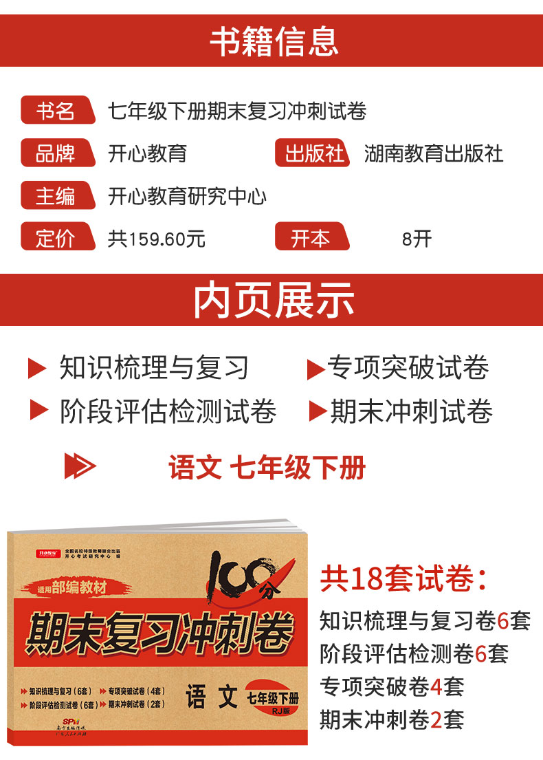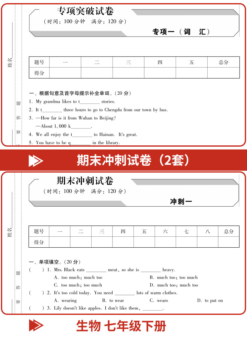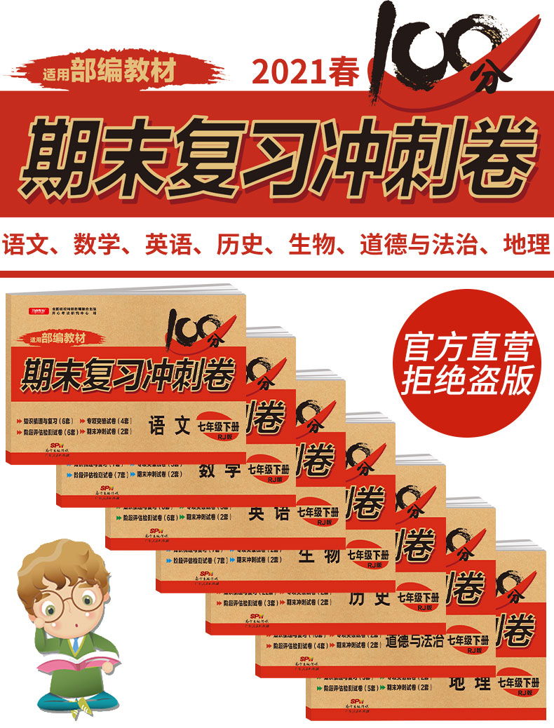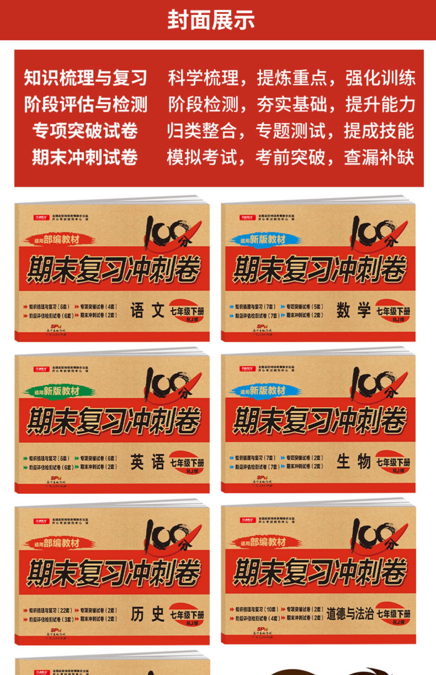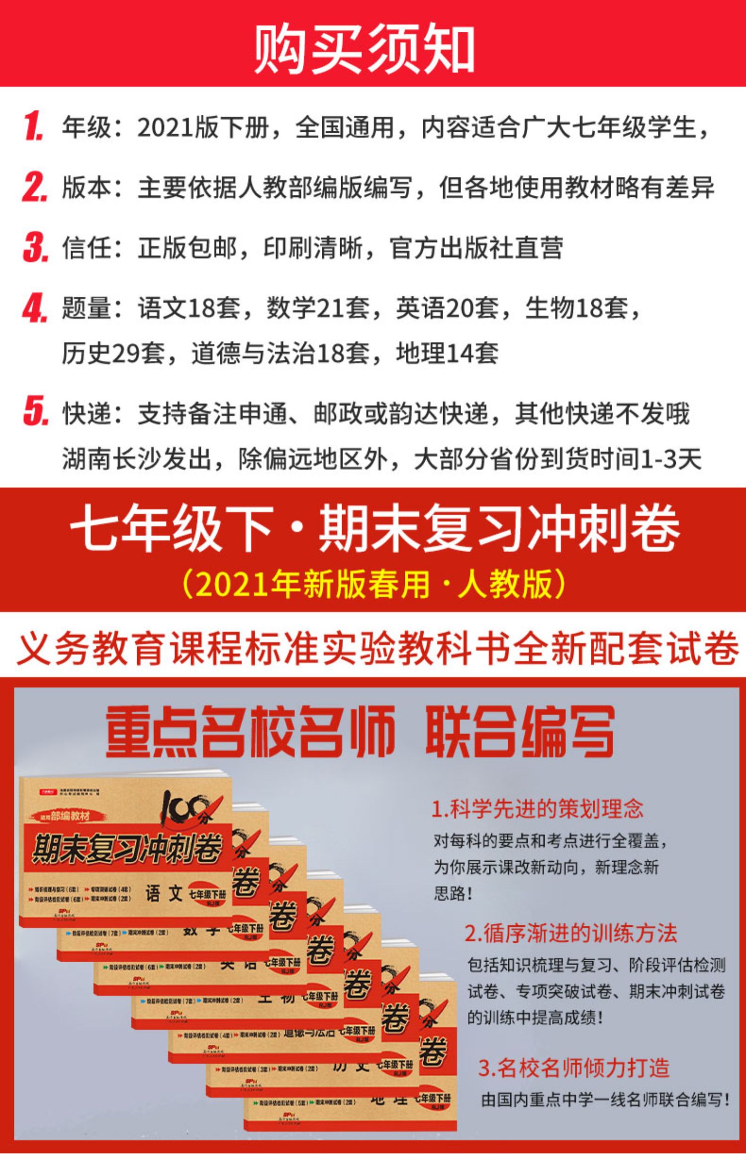 【首单秒杀】初中七八年级下册试卷测试卷期末冲刺100分,语+数+英全套,大字开本,印刷清晰,巩固知识,梳理重点,题型丰富,内容全面,老师推荐,让孩子轻松考个好成绩!