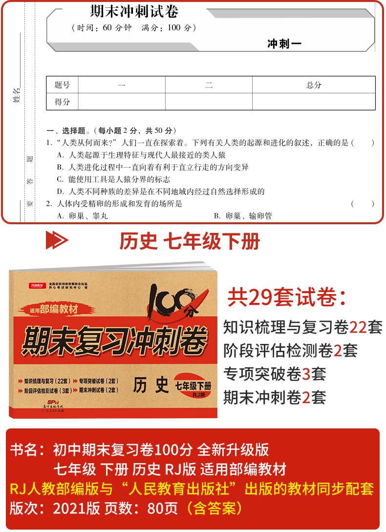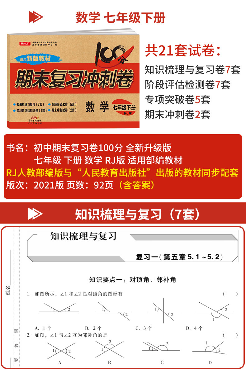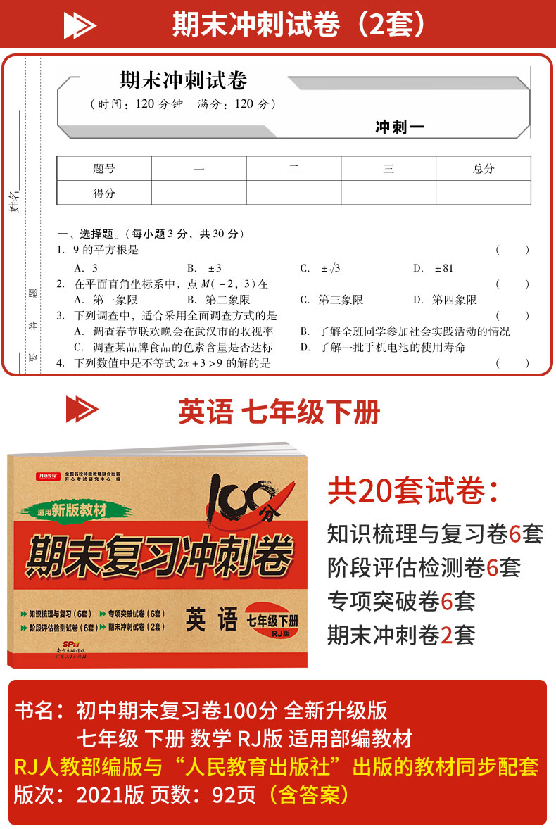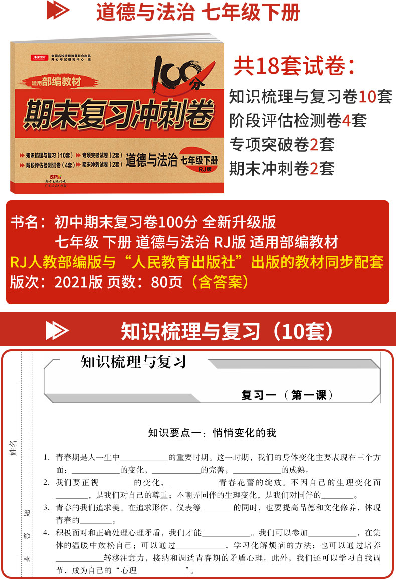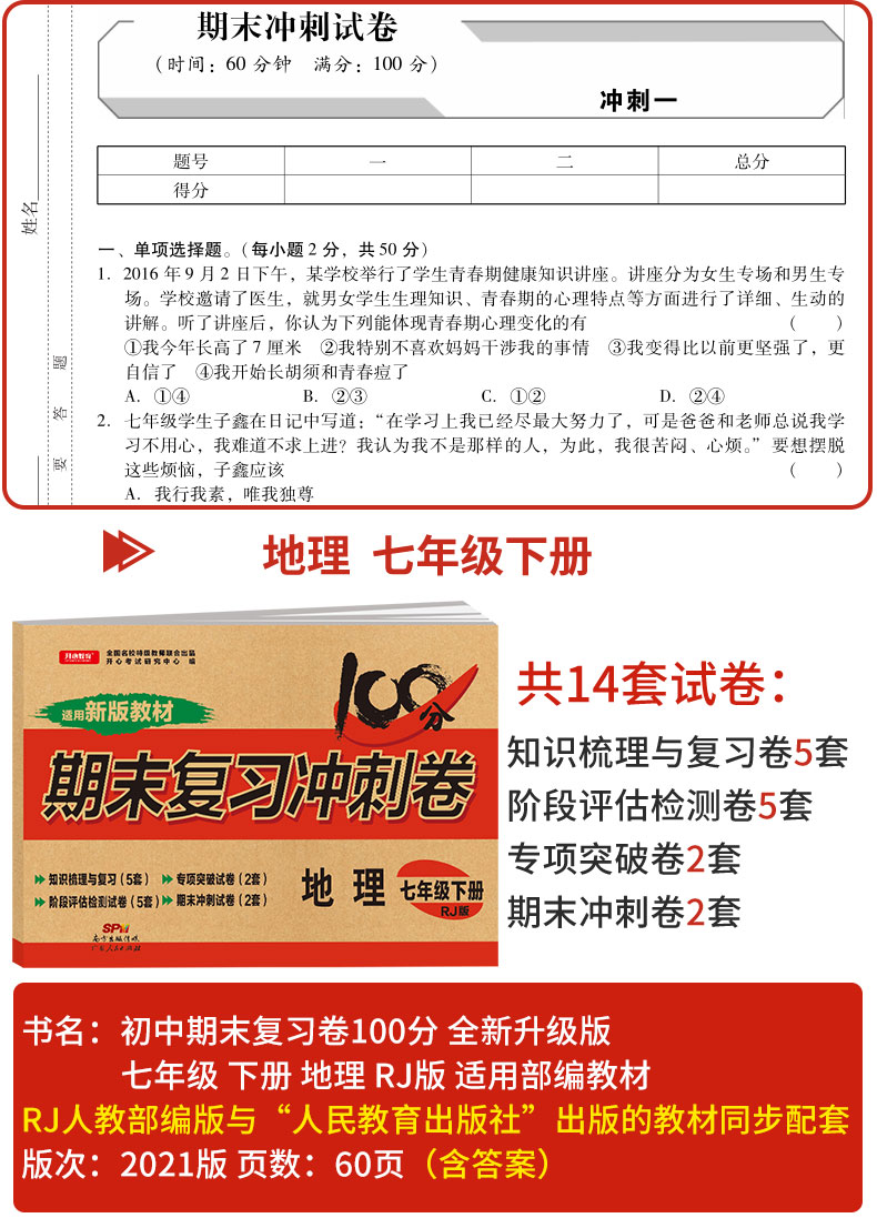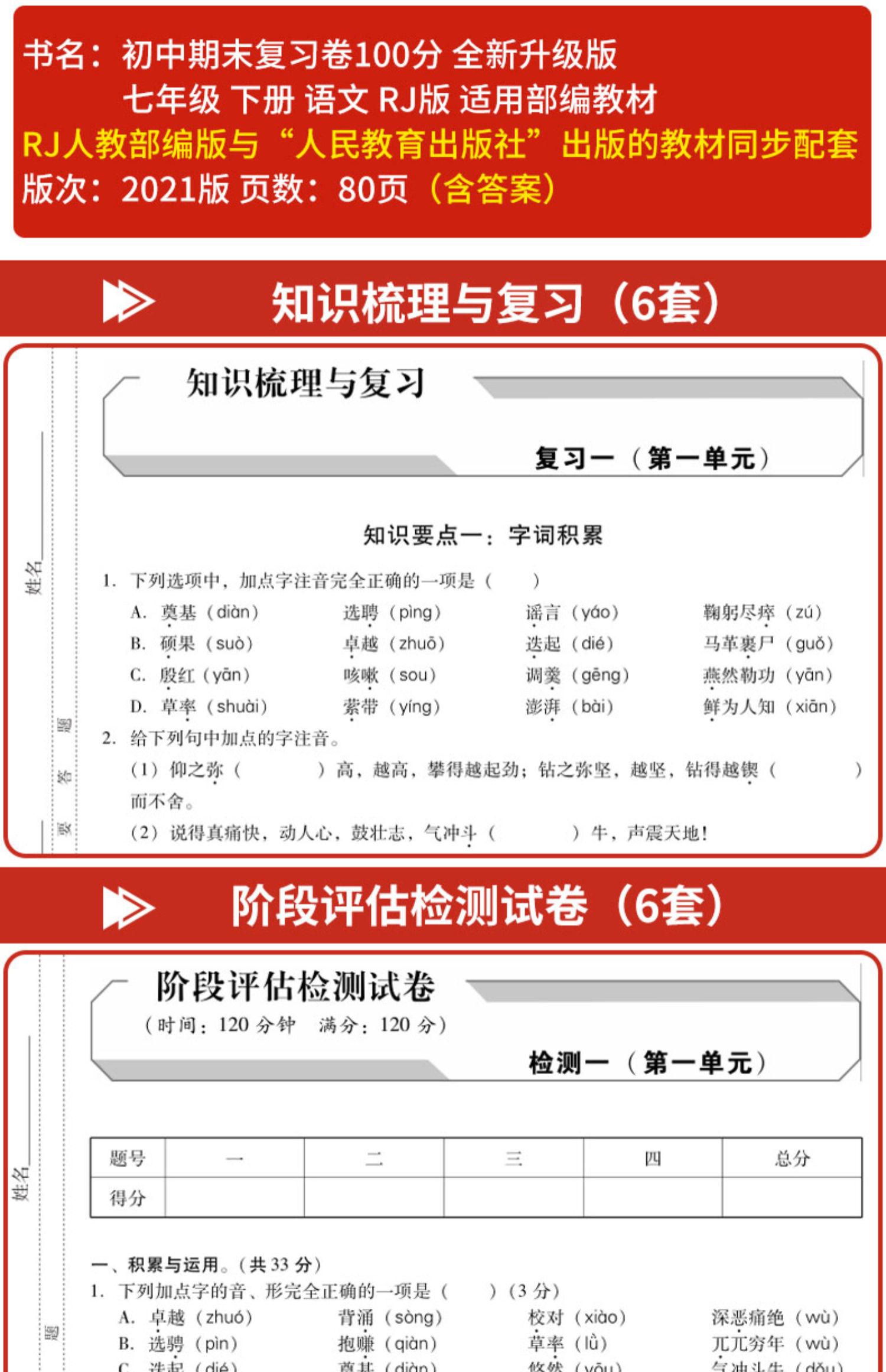 【首单秒杀】初中七八年级下册试卷测试卷期末冲刺100分,语+数+英全套,大字开本,印刷清晰,巩固知识,梳理重点,题型丰富,内容全面,老师推荐,让孩子轻松考个好成绩!
