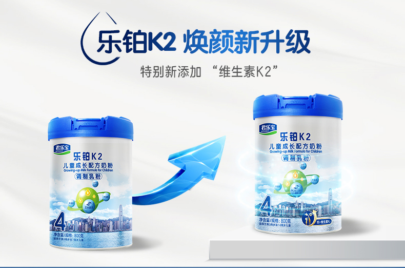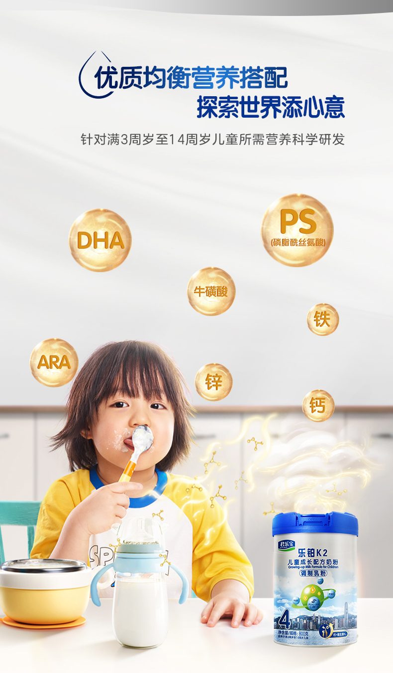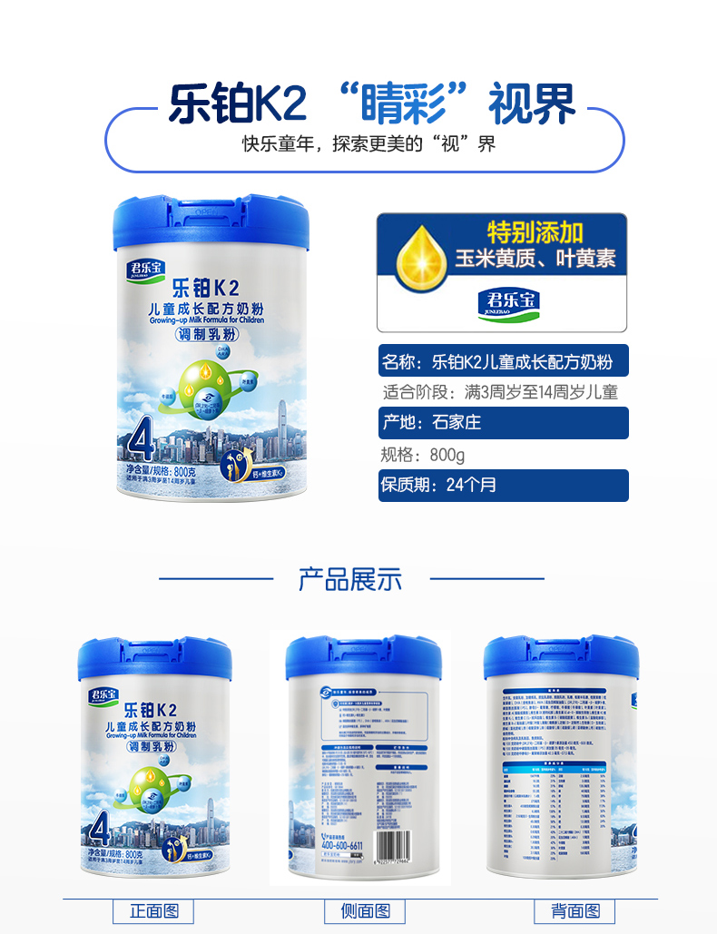 【拍3件返105猫超卡,叠加140-10,到手229元;叠88vip单罐到手70.8元】君乐宝乐铂K2奶粉800g,添加叶黄素&玉米黄质,3-7周岁儿童均衡营养!