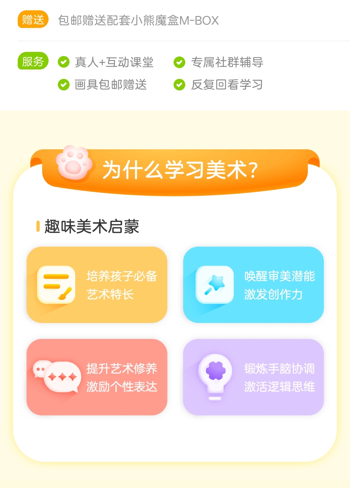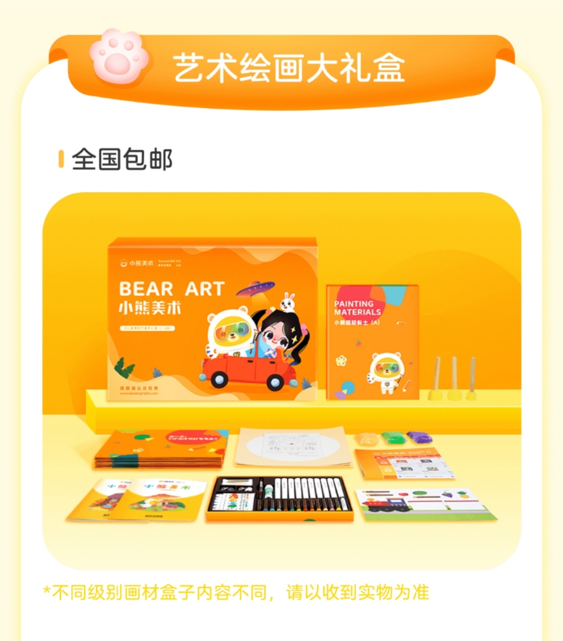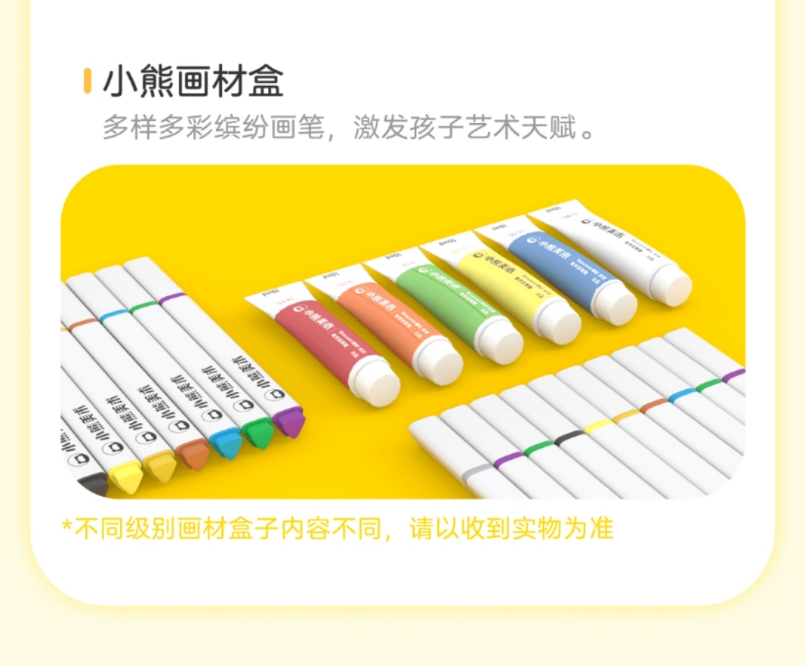 美术宝小熊AI,10节小熊美术课程加魔盒M-box,抓紧入手哈,10节课,五种画笔,手指画+12色马克笔+10色油画棒+海绵笔+勾线笔、轻彩泥,调色盘,一套手作纸。