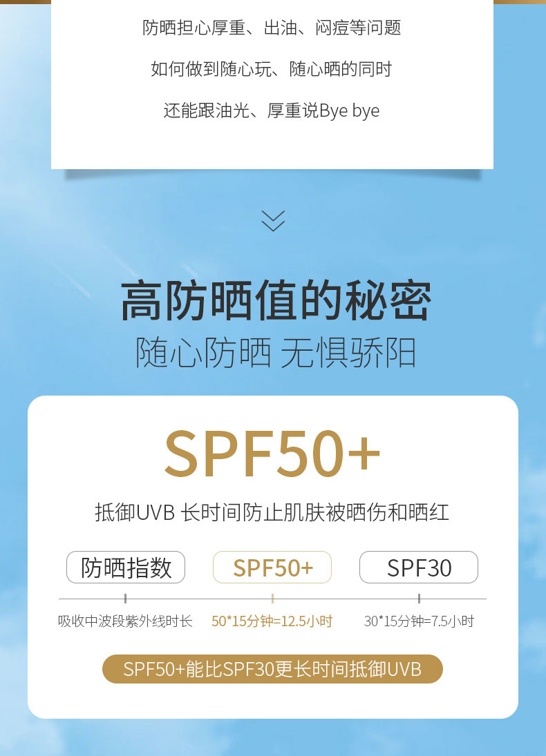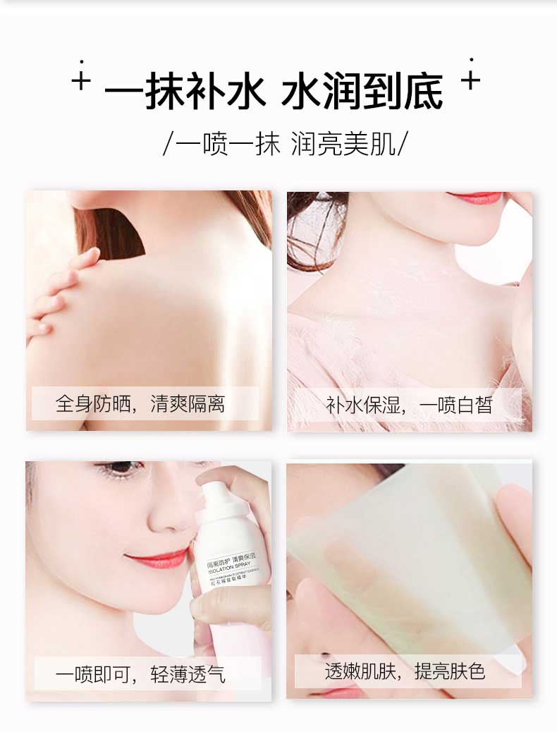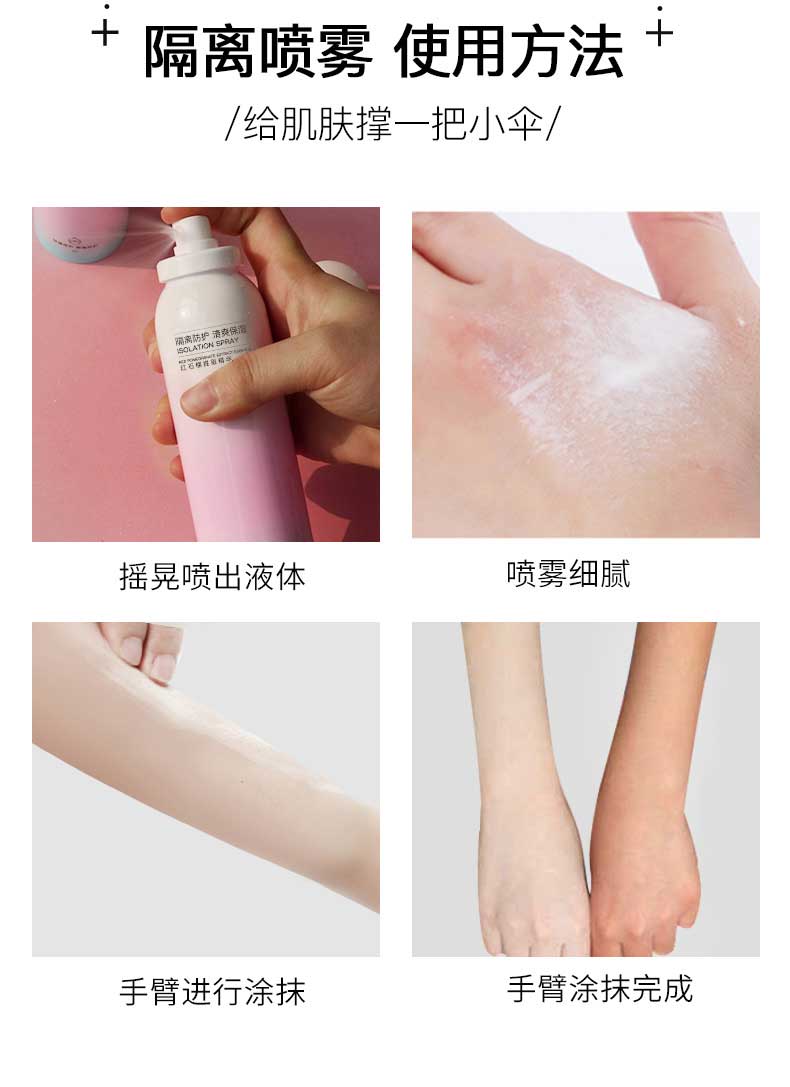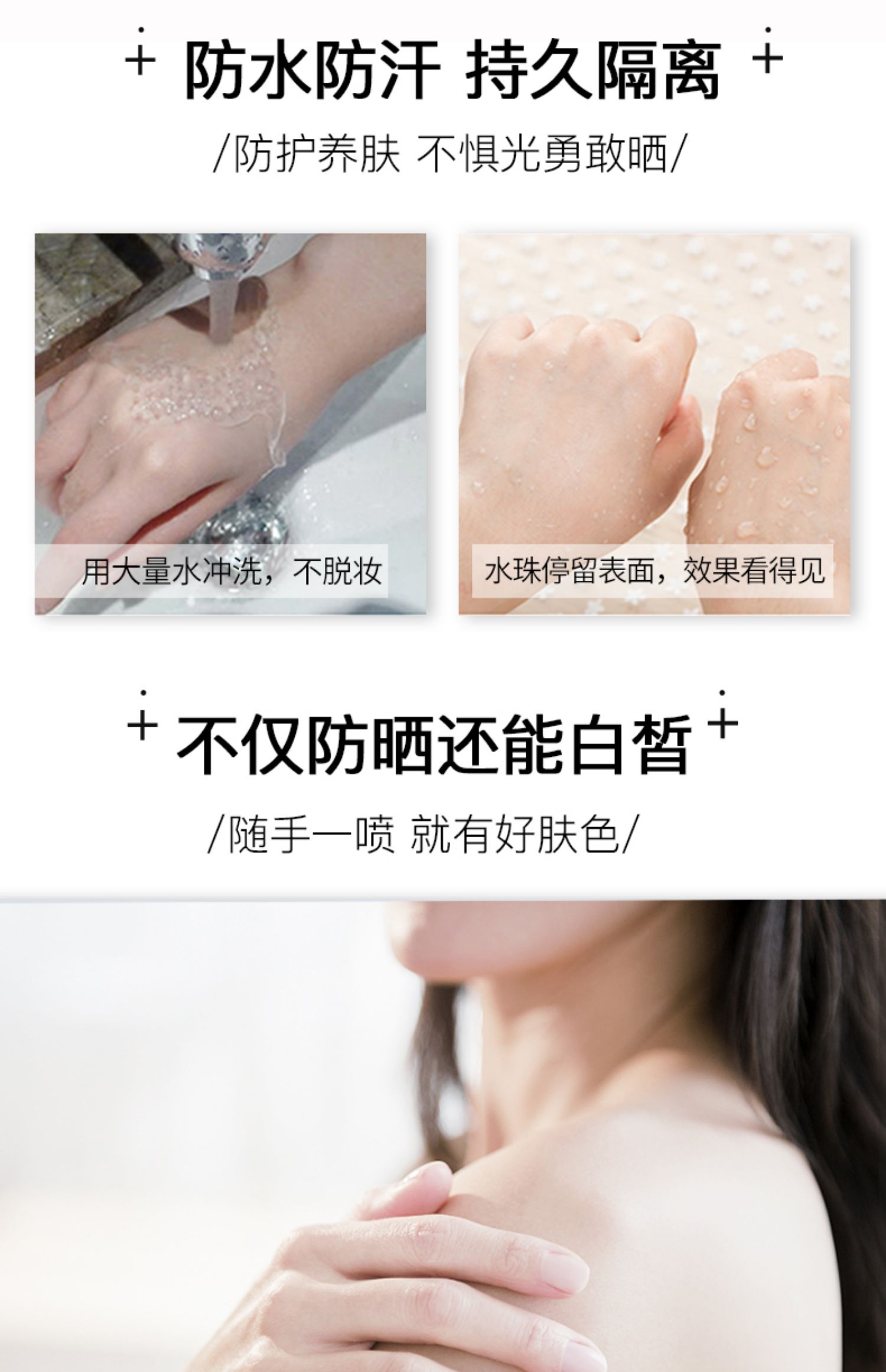 爆款防晒,实力见证,硬核耐晒,实力美白,高倍防御,肌肤晒不黑物化合一,双重防晒~高姿改良泵头,小分子雾状,喷雾更加细密亲肤,SPF50+PA+++,12小时长时防晒