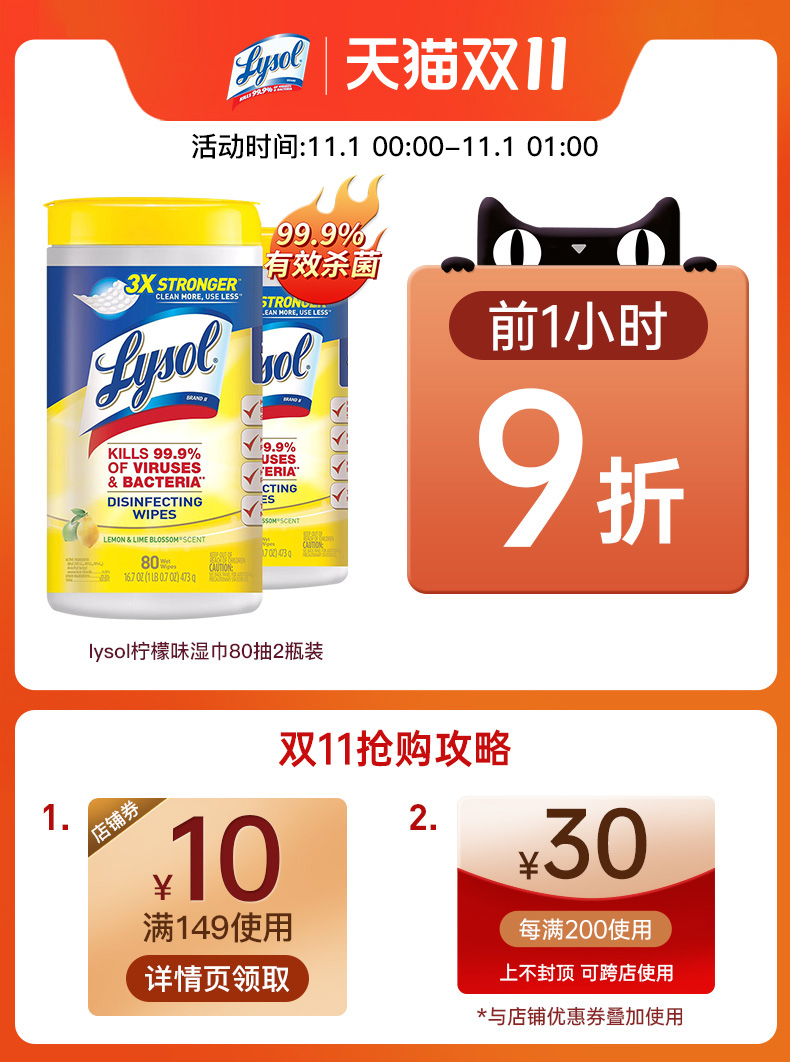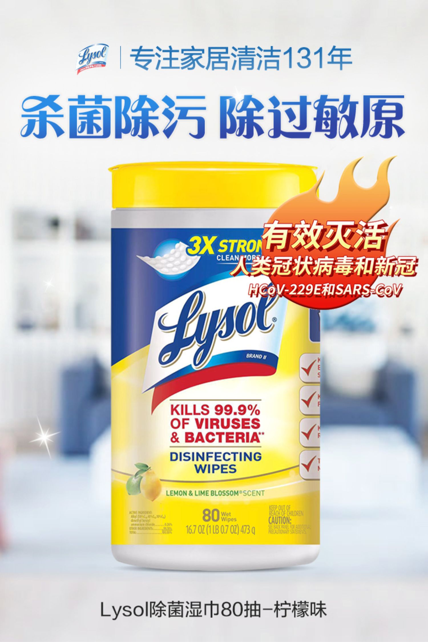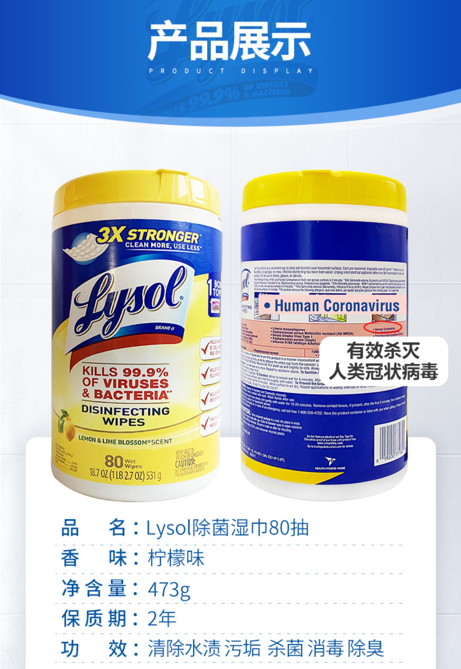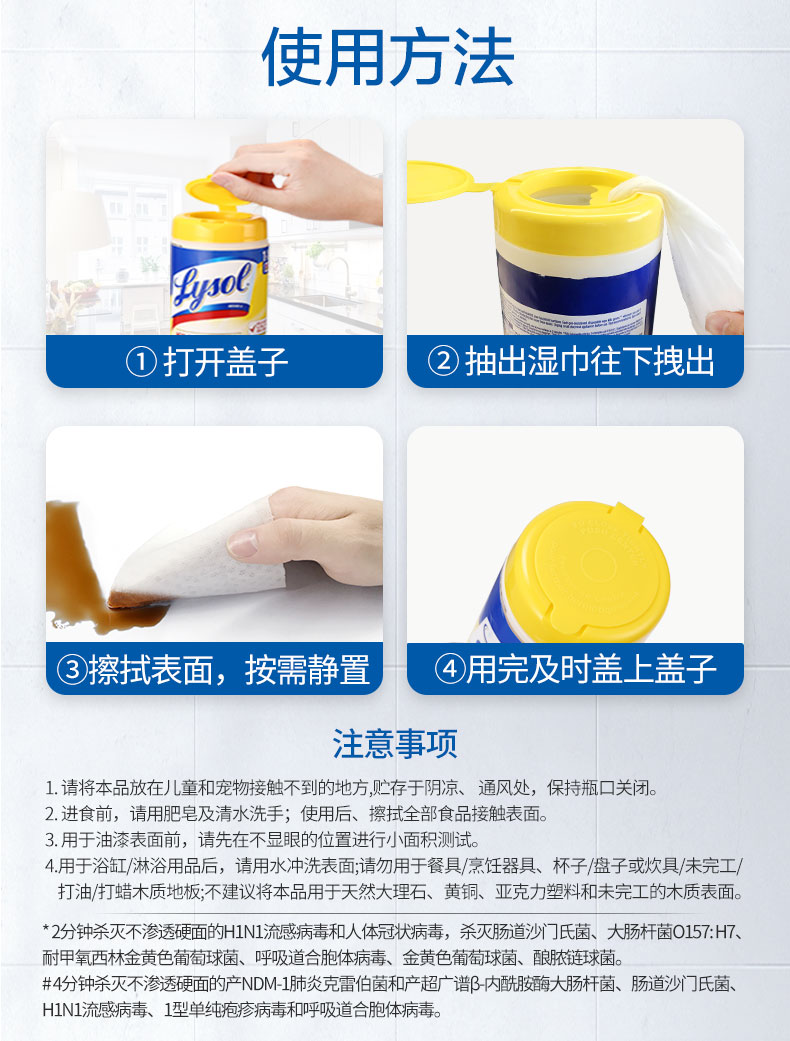 美国Lysol消毒湿巾除菌清洁湿纸巾80抽2瓶