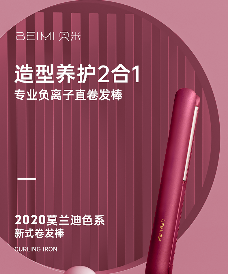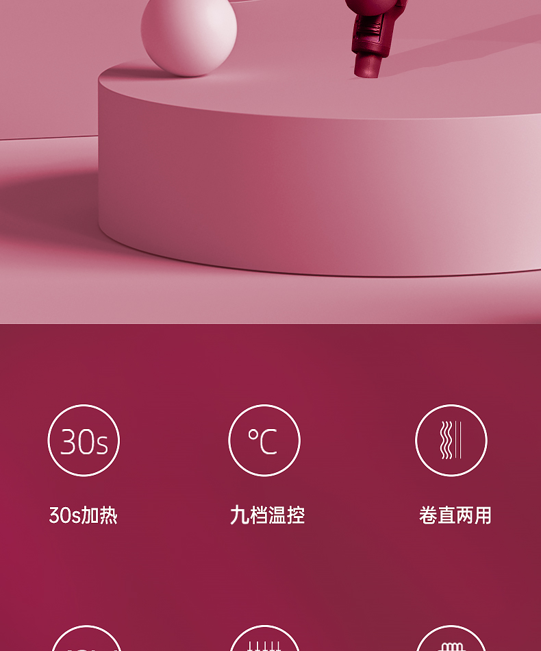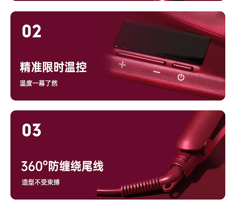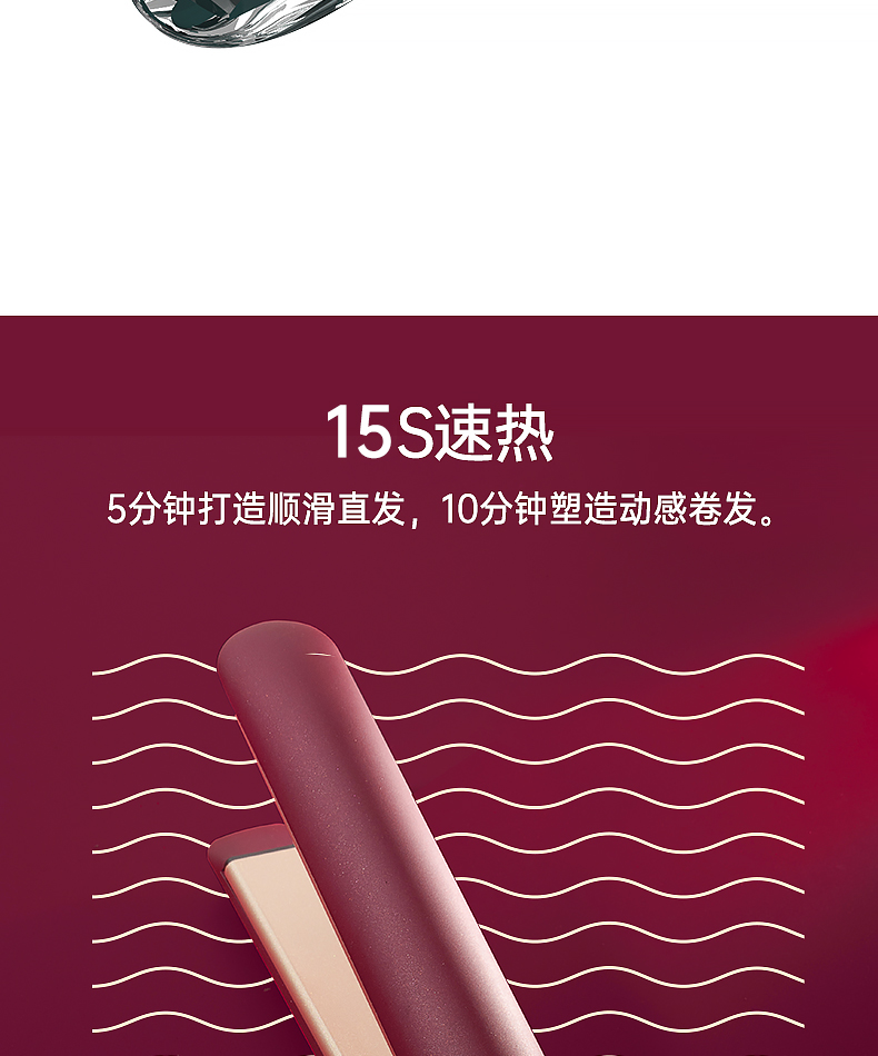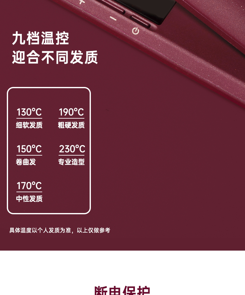 1000万负离子夹板,中和静电减少毛糙~内置九挡只能控温,满足多种发质需求~1小时智能断电,安全守护~