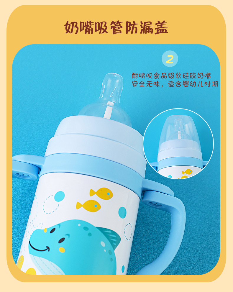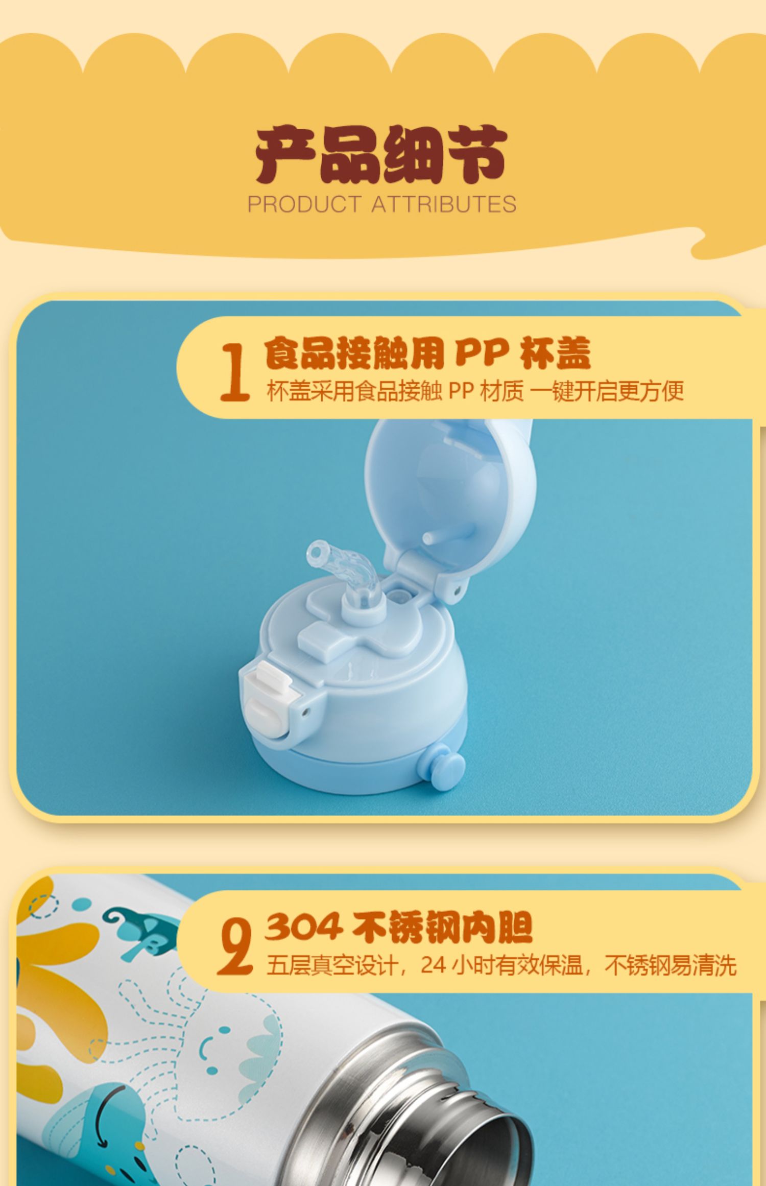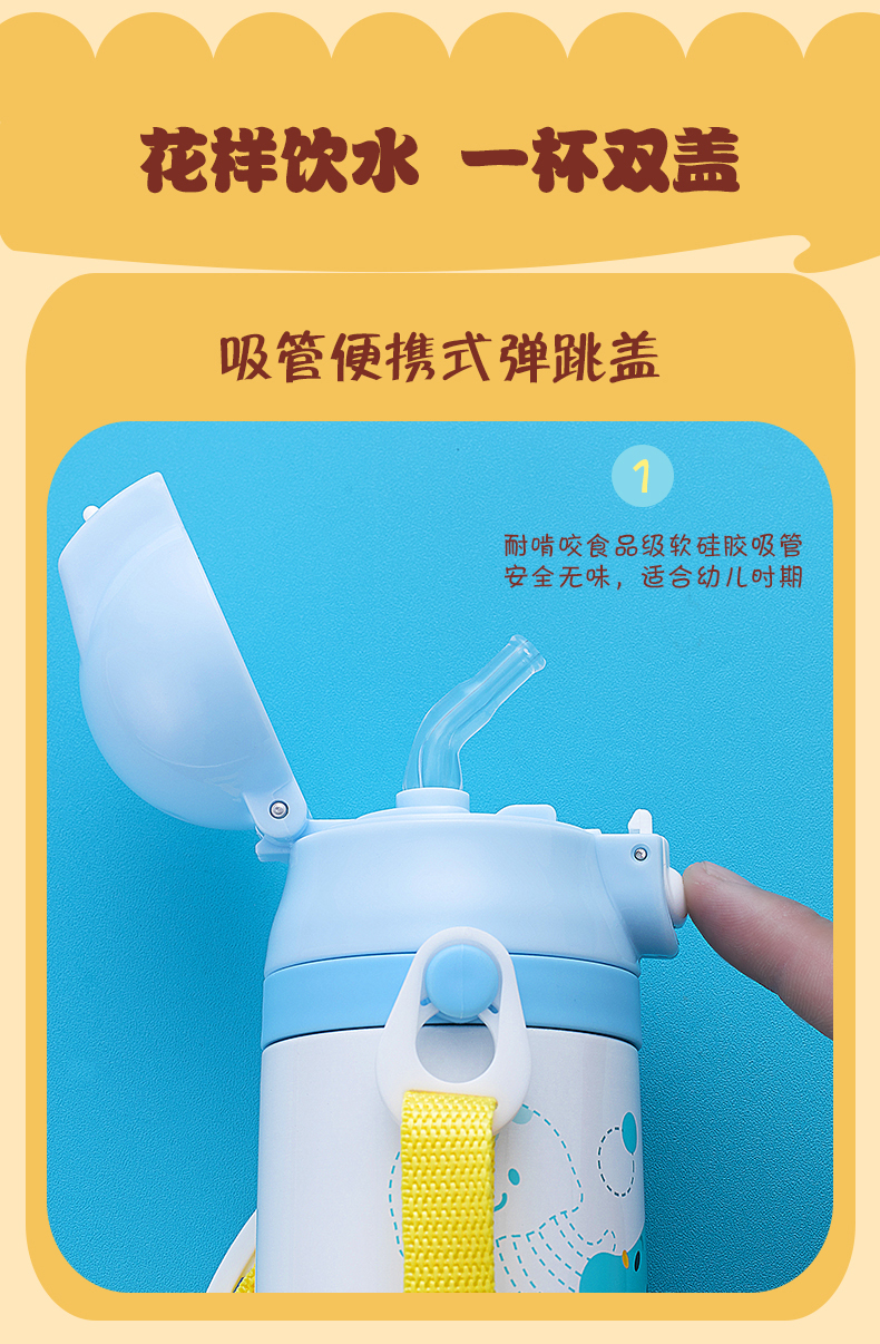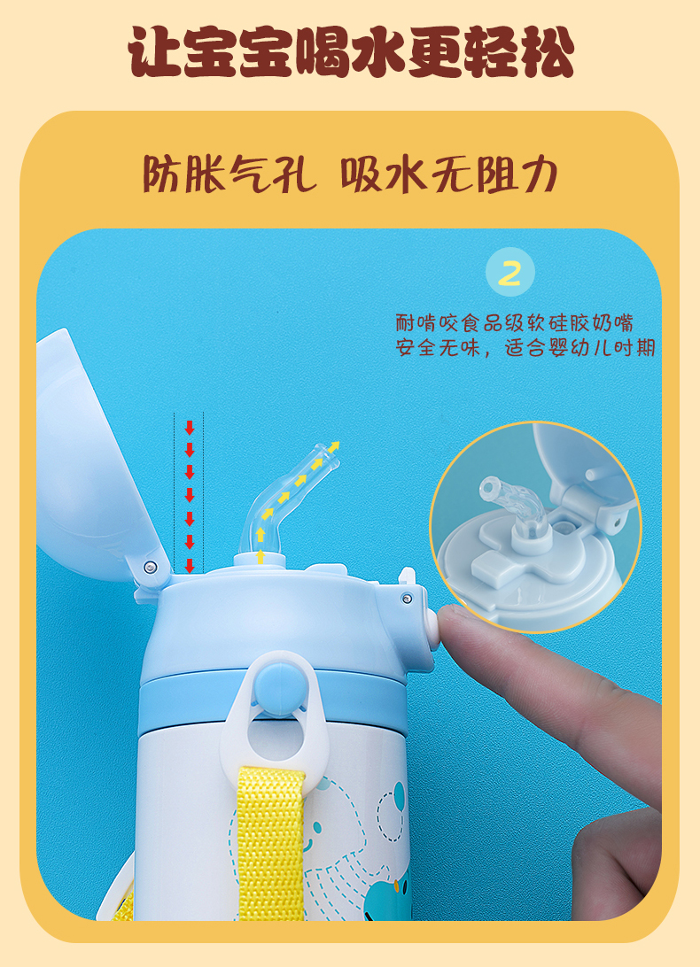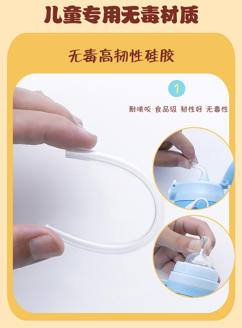 儿童专用无毒材质,食品级软硅胶奶嘴吸管,无毒无味,开盖即吸,双盖8小时持久保温304不锈钢材质,摔了也不怕坏,就是要给宝贝好的选择~