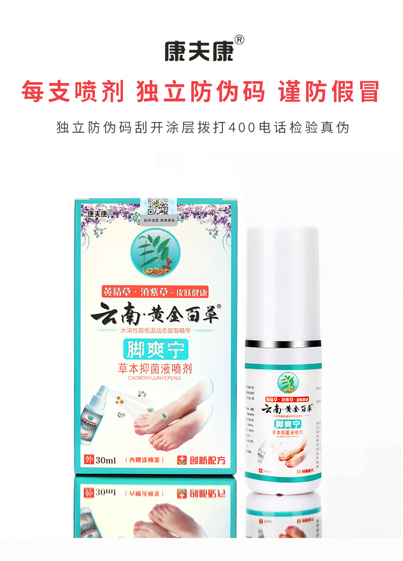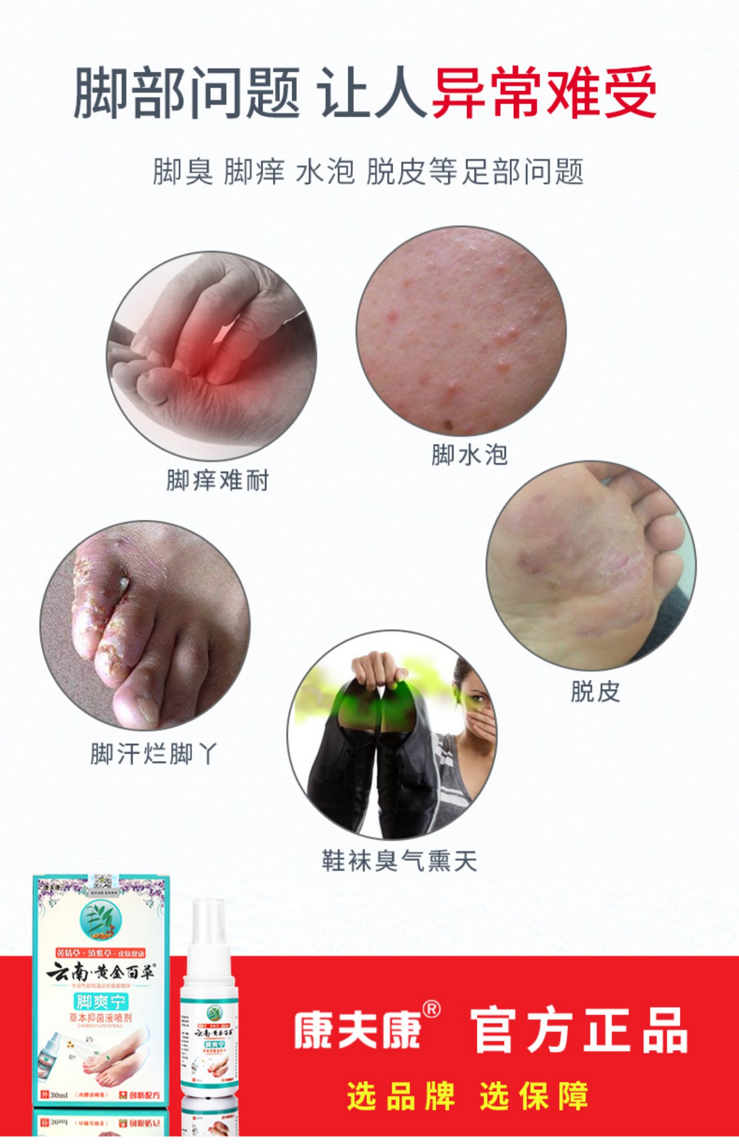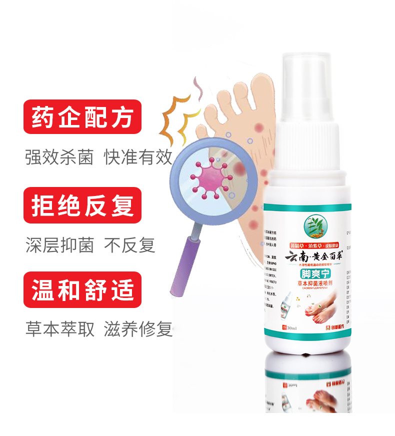 中药草本研制,萃取草本植物,不含激素,抑菌除臭,见效快不复发,脚臭,烂脚丫,一喷一洒,3天见效,轻松解决脚部问题~药效好才是关键!使用它-让您恢复健康双脚。