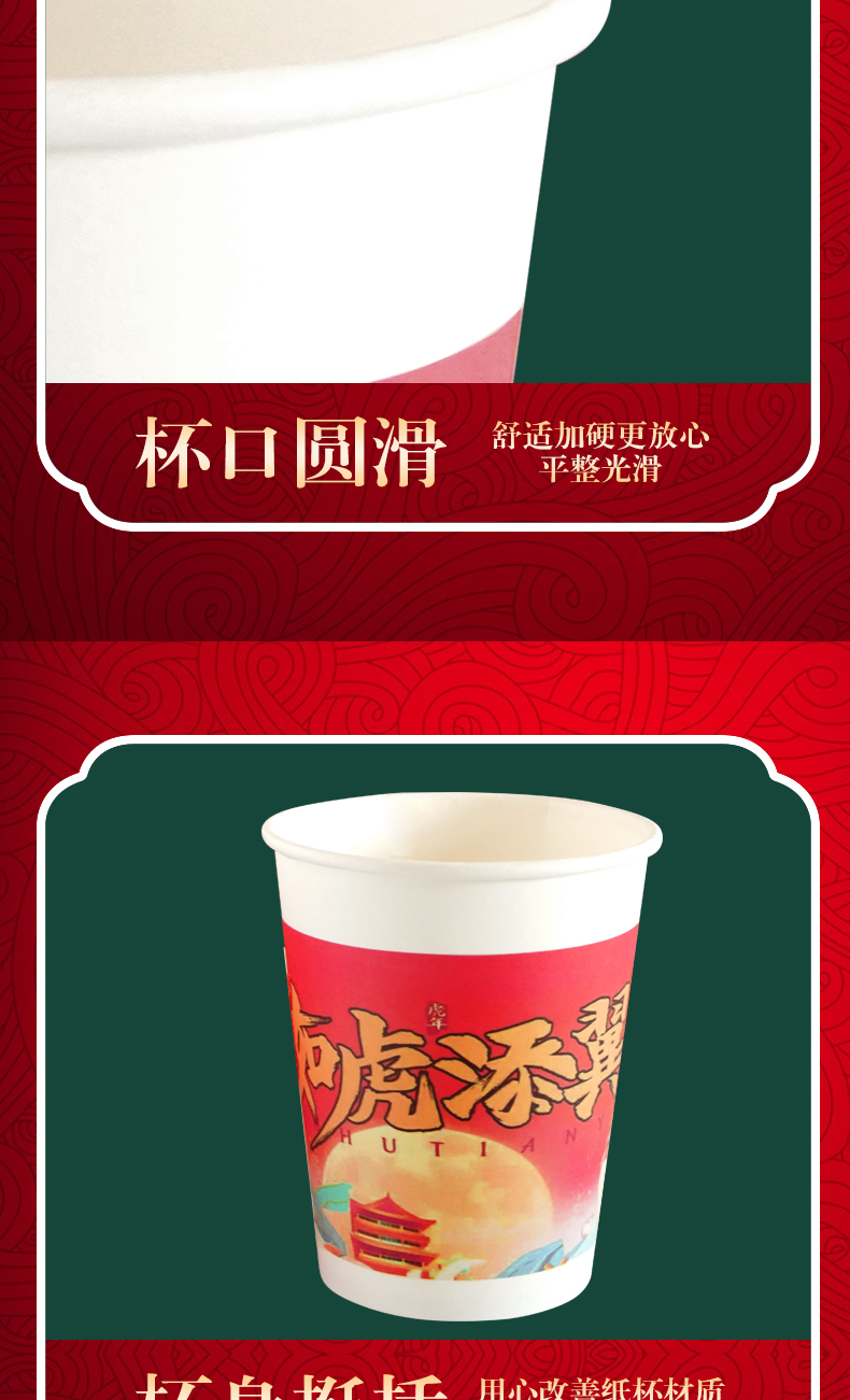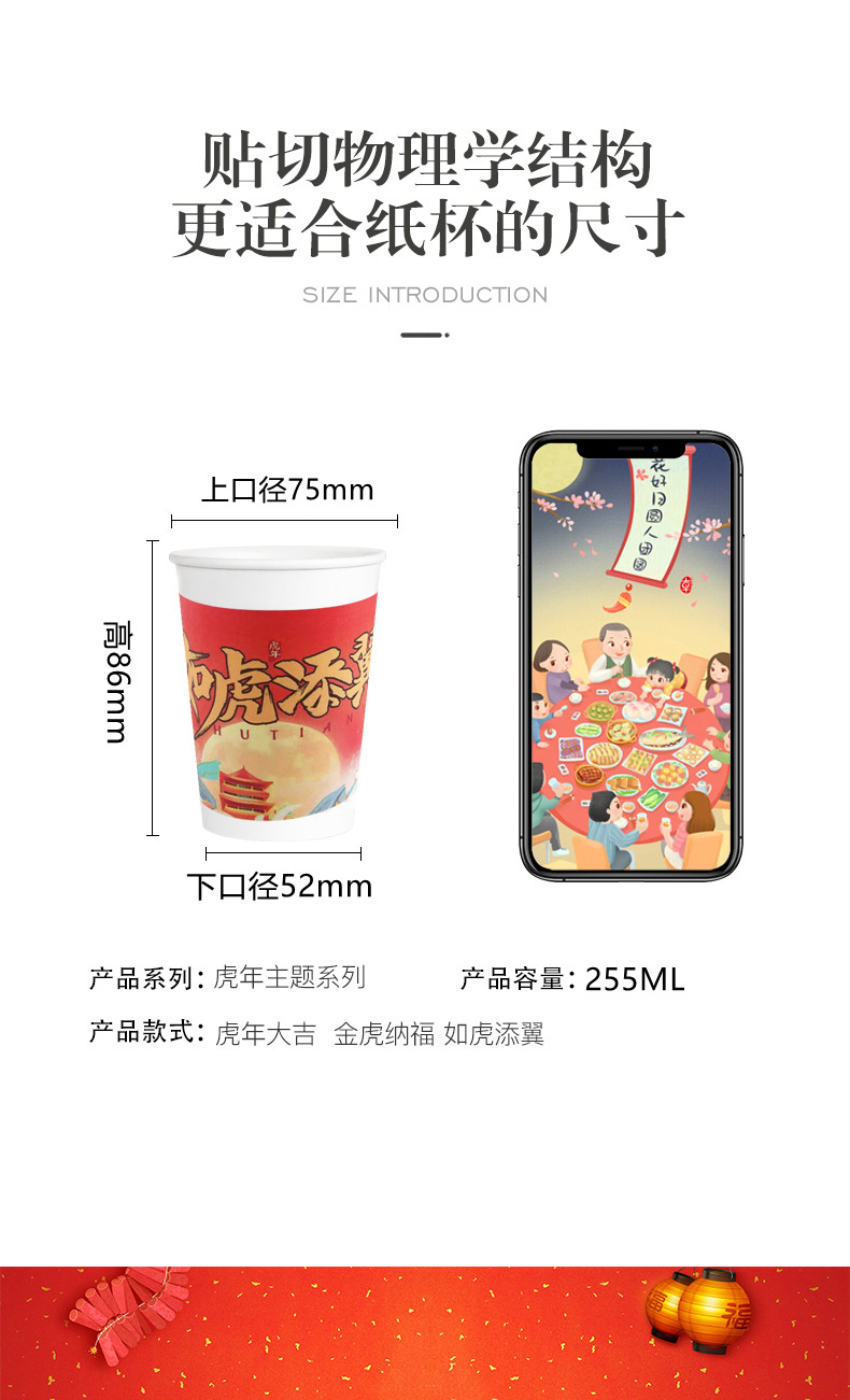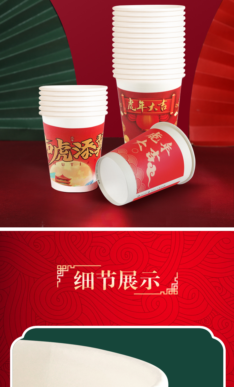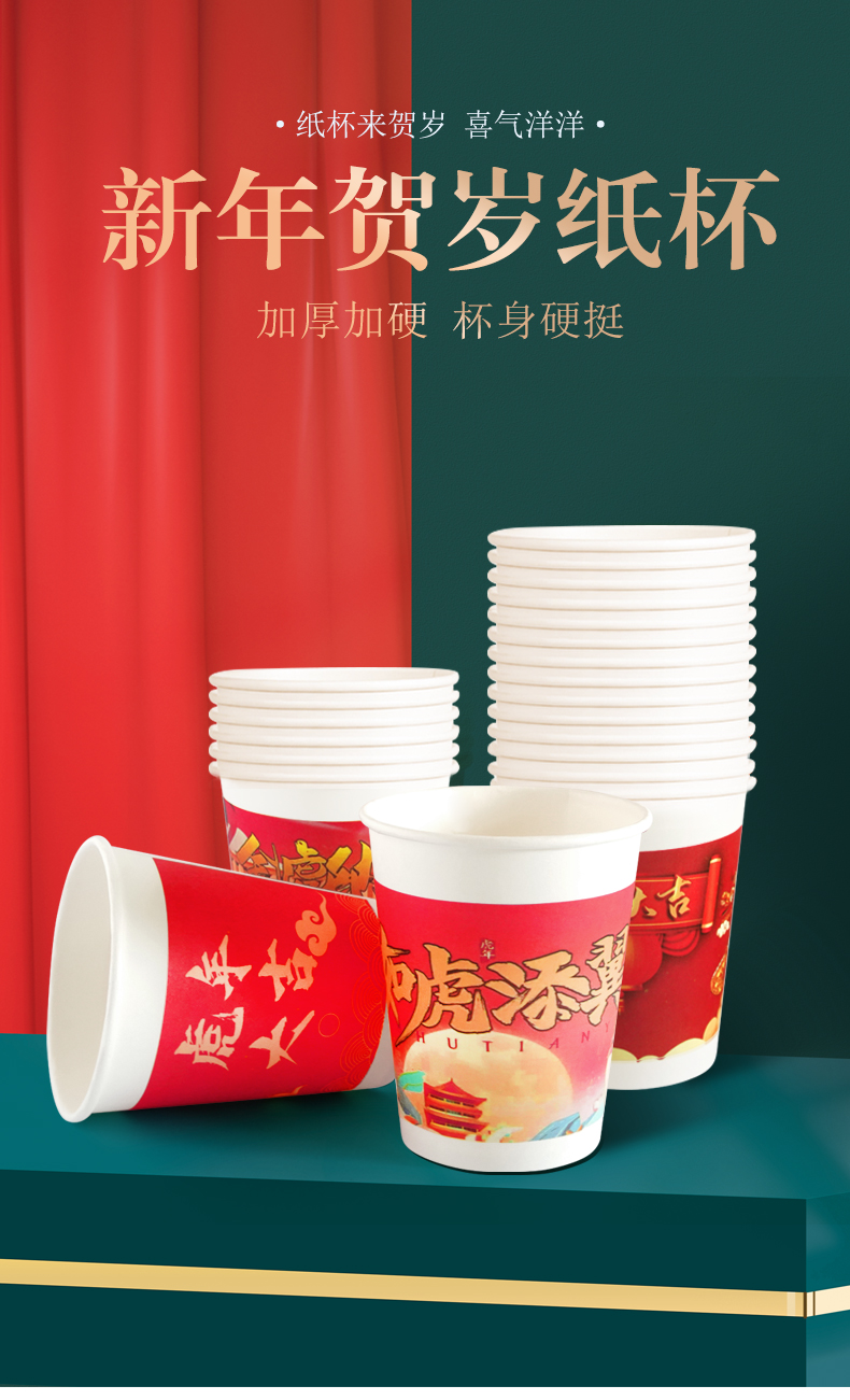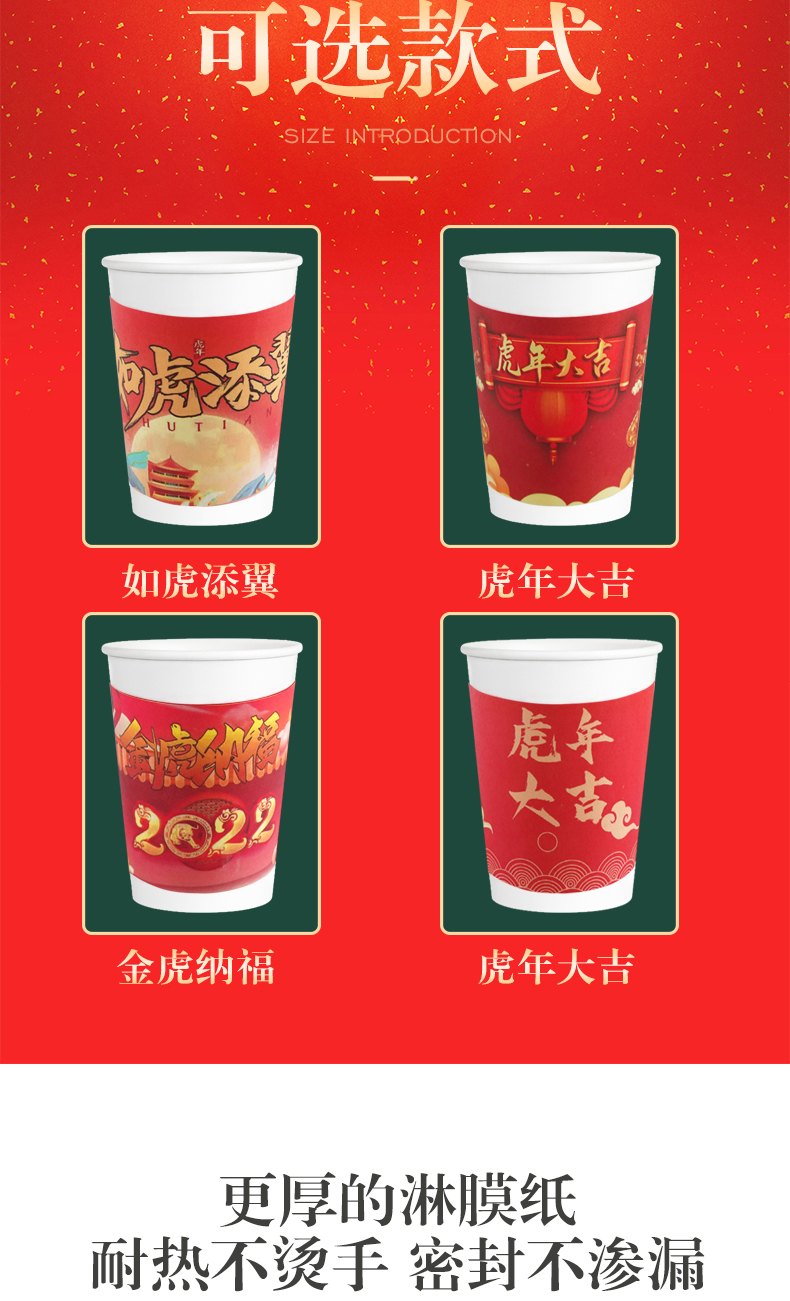2022虎年纸杯春节,多种款式可选,高品质!加厚隔热,冷热共饮,无印光漂白,绿色环保健康,不易变形,不外翻,硬纸杯,挺括手感厚实,无毒,无味无害,便捷卫生~