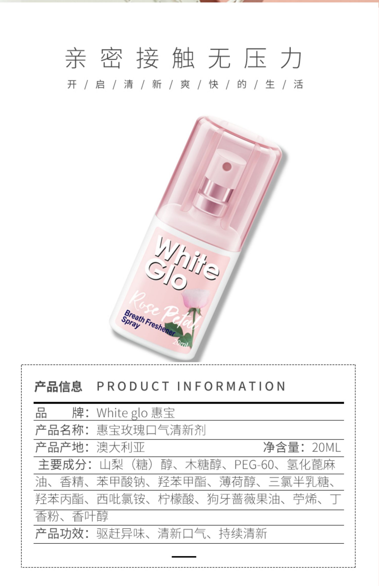 澳洲原装进口,玫瑰香型清新喷雾剂,去除口腔异味,清新持久,给口腔清洁~吃饭后,吸烟后,约会前,会议前,小巧便携,随手喷一喷,让你开口自信,清新舒爽数小时~