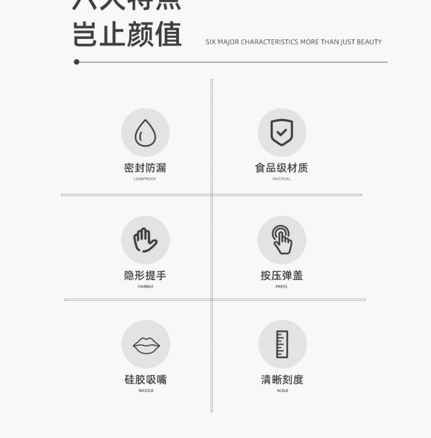精选安全材质,无毒无气味,单手操作,一键开启,隐形提手,清晰刻度,硅胶吸嘴,健康卫生,360度密封不漏水【赠运费险】