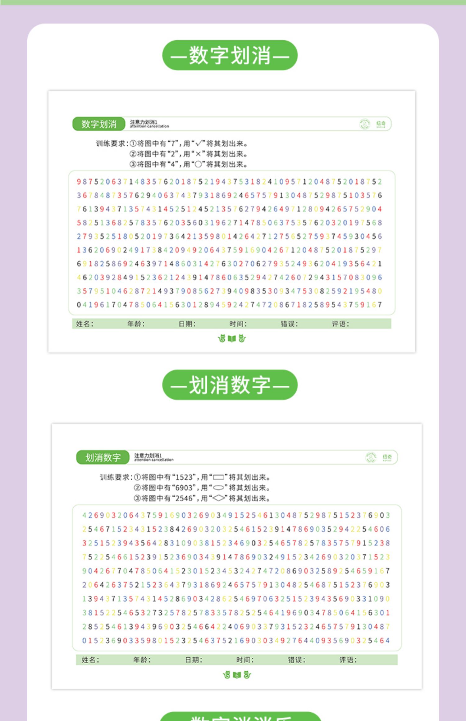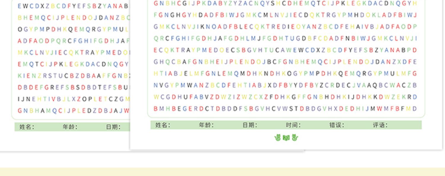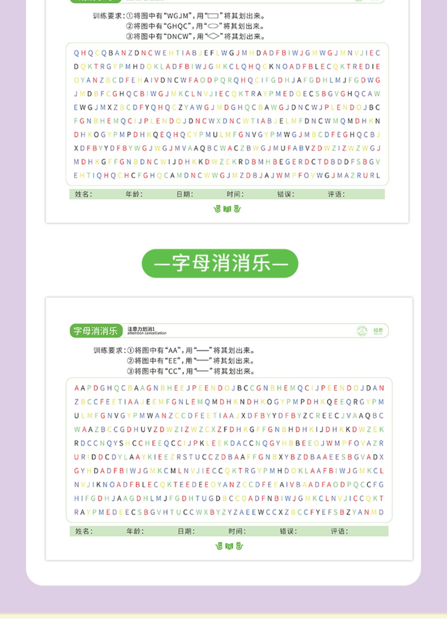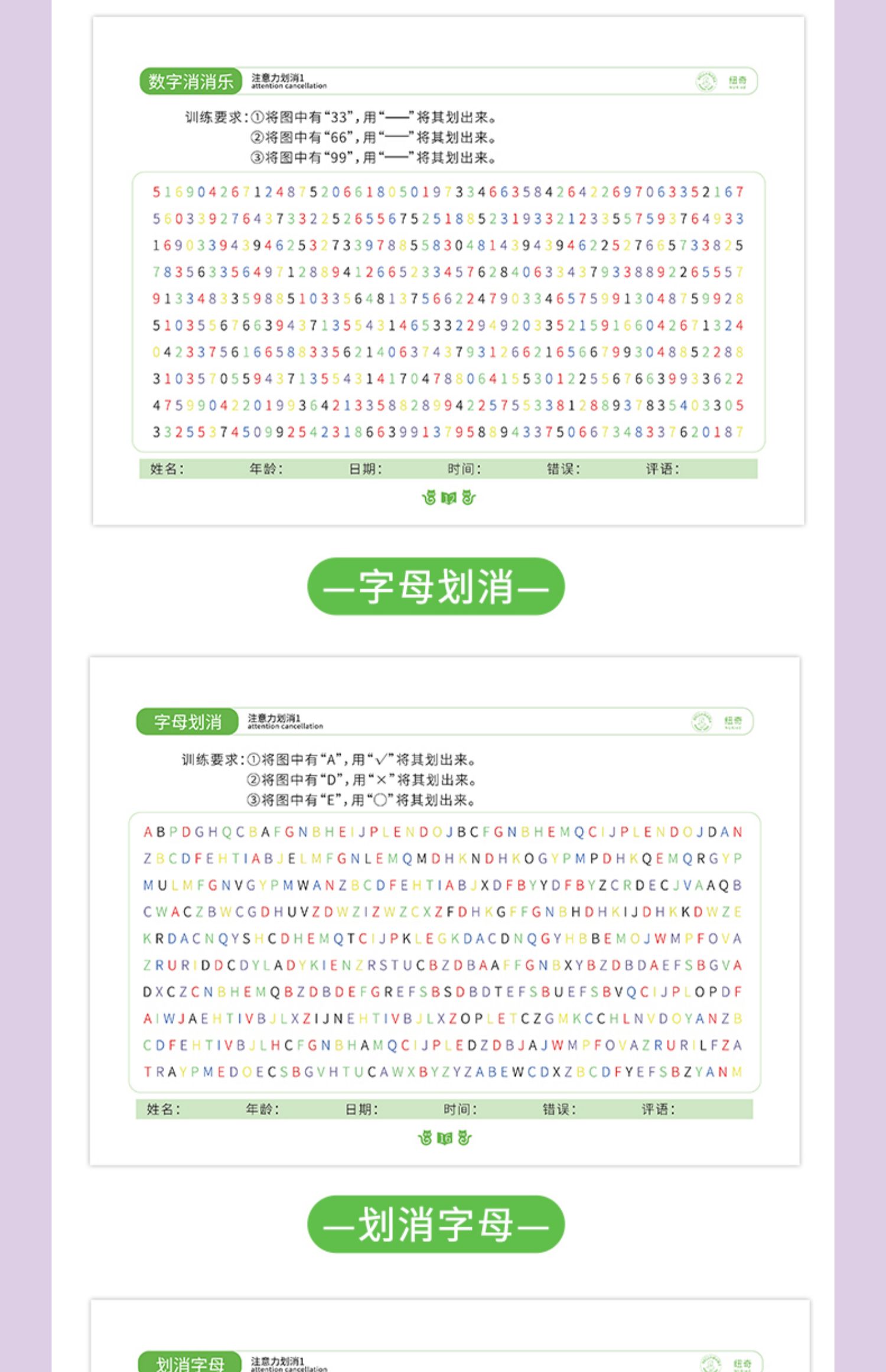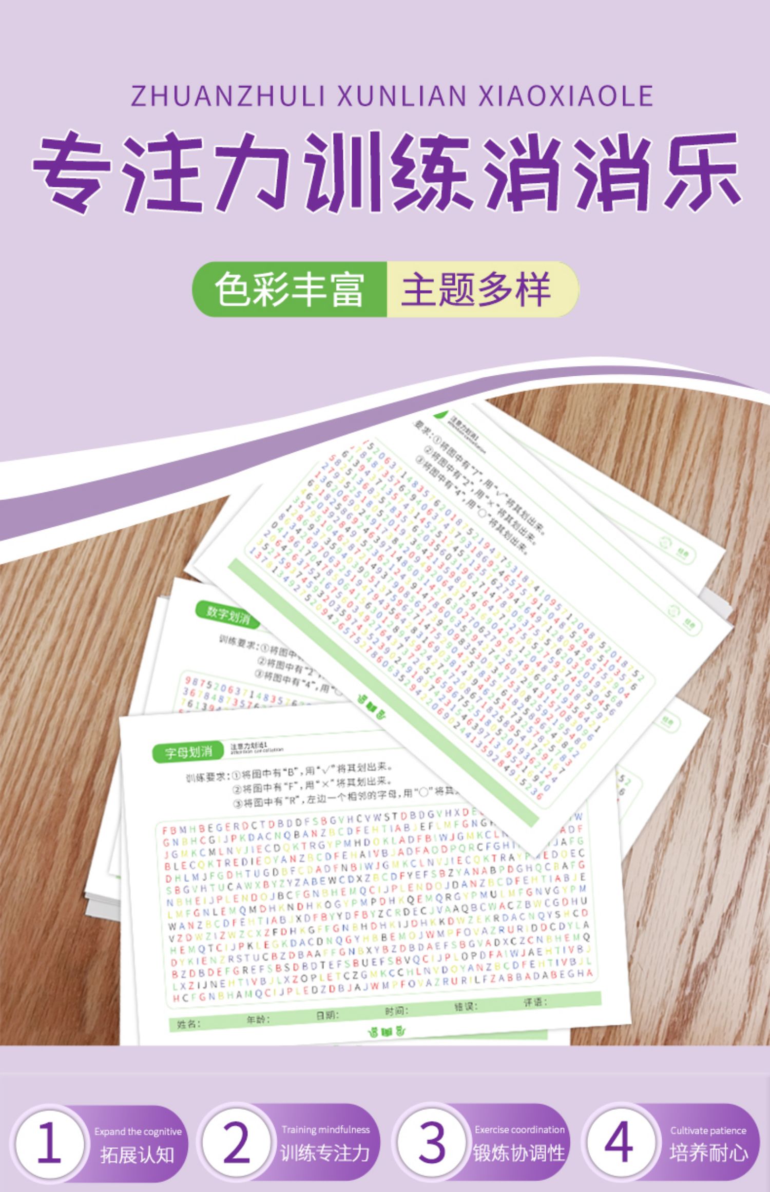 一份练习,多种玩法。练习设有数字和字母两种训练,锻炼宝宝的专注力和协调性。难易搭配训练,循序渐进,护眼纸系列,宝宝用的放心妈妈安心~