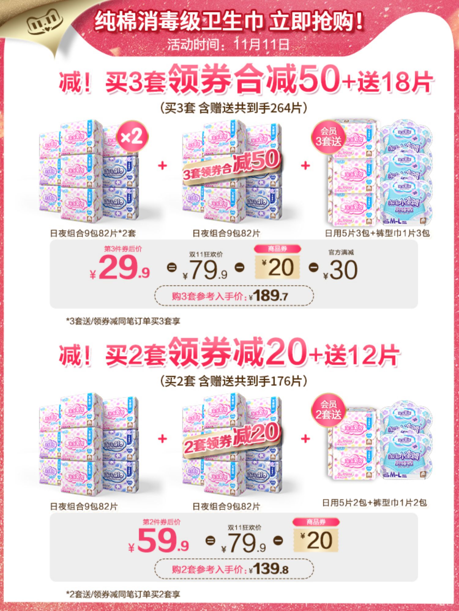 你还没用过消毒级卫生巾?快看看这个,纯棉全新升级,柔感棉超柔软,干爽透气,完全感觉不到姨妈来,快速吸收,令肌肤干净如初,无香味,不闷不过敏,呵护敏感肌,极薄无感,尽享自在,整夜安睡~~