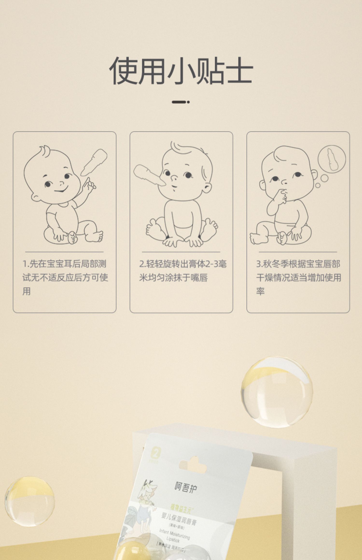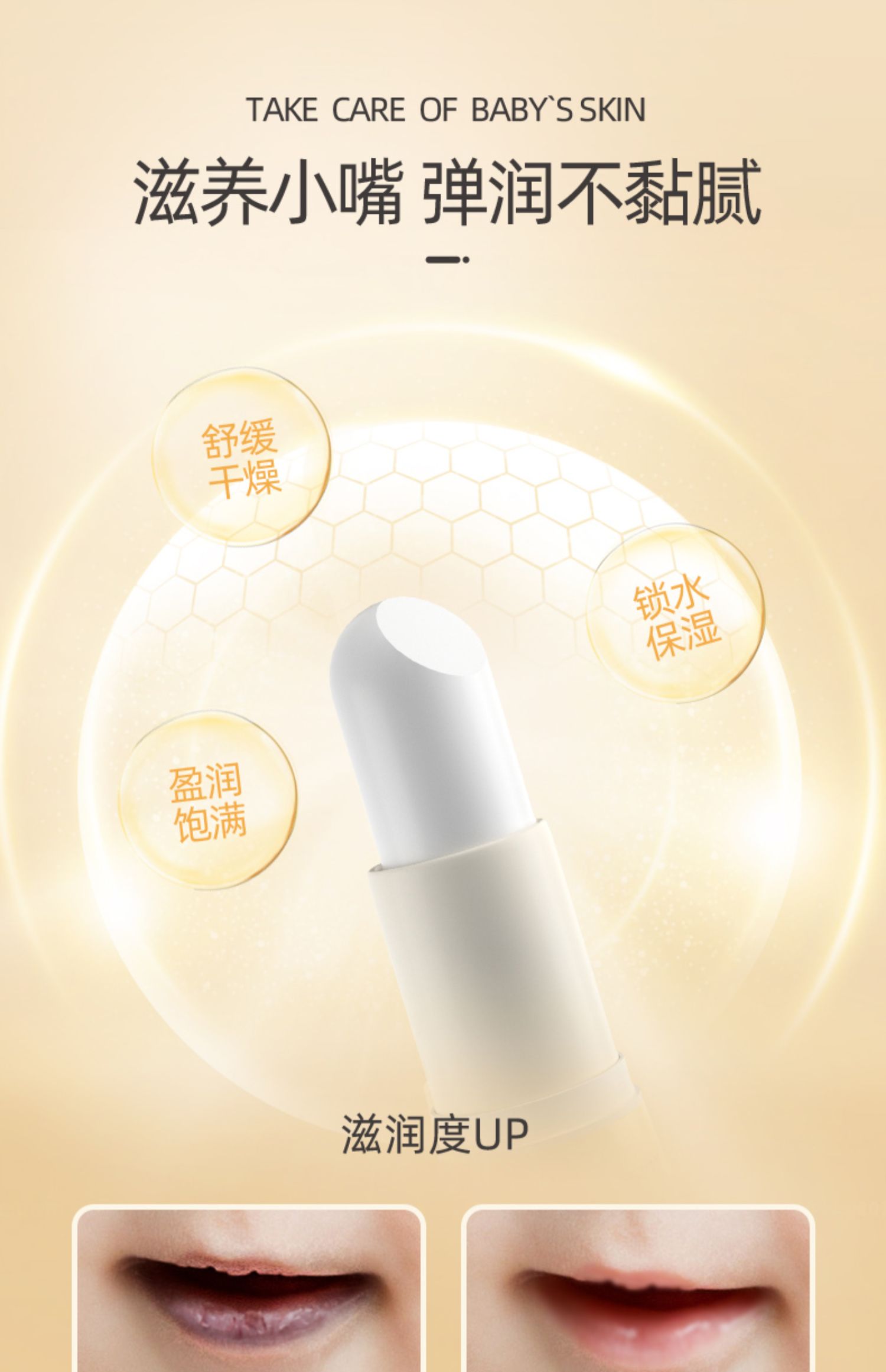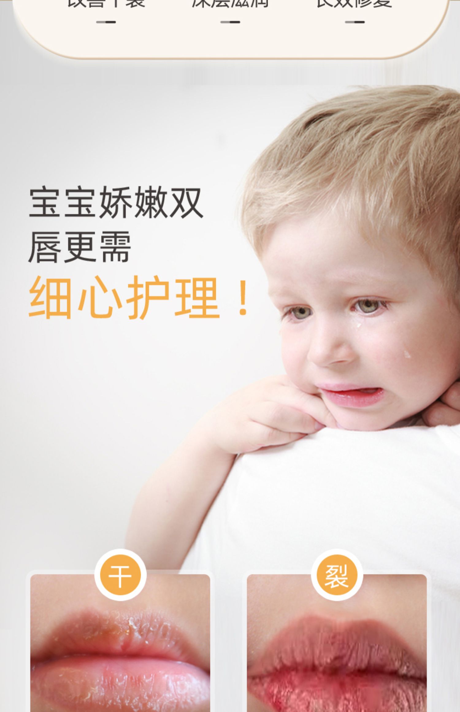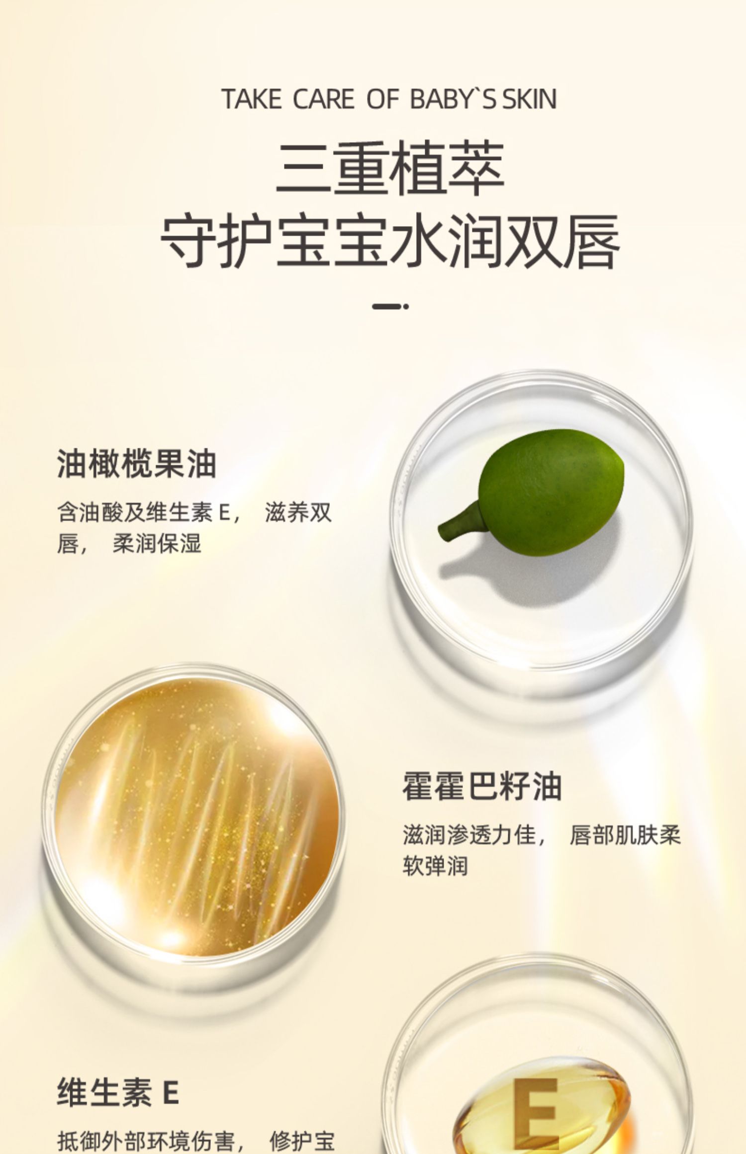 植萃滋养,宝宝‘唇真’水润,改善宝宝肌肤缺水状况,维持肌肤细腻水嫩,弹润不粘腻~